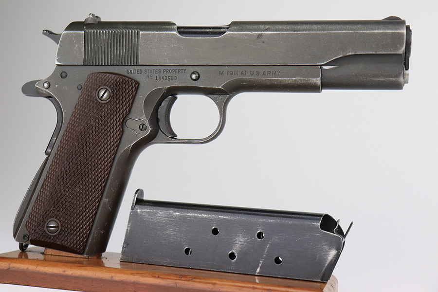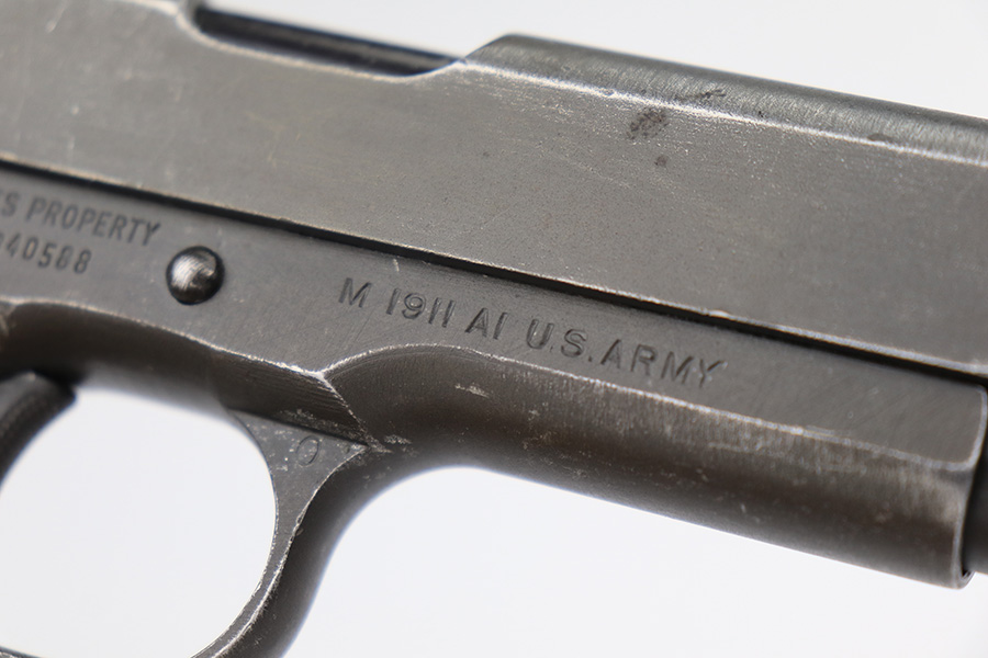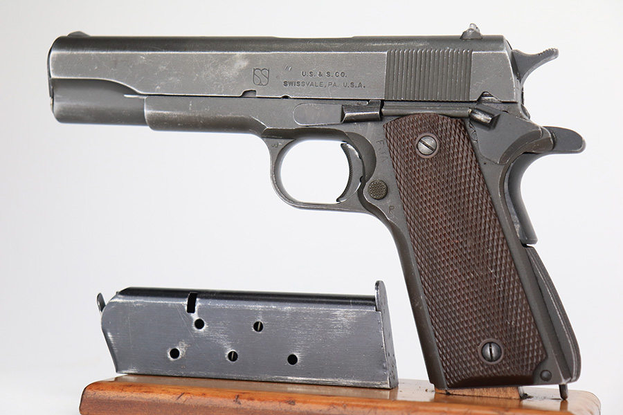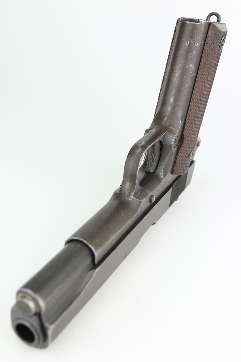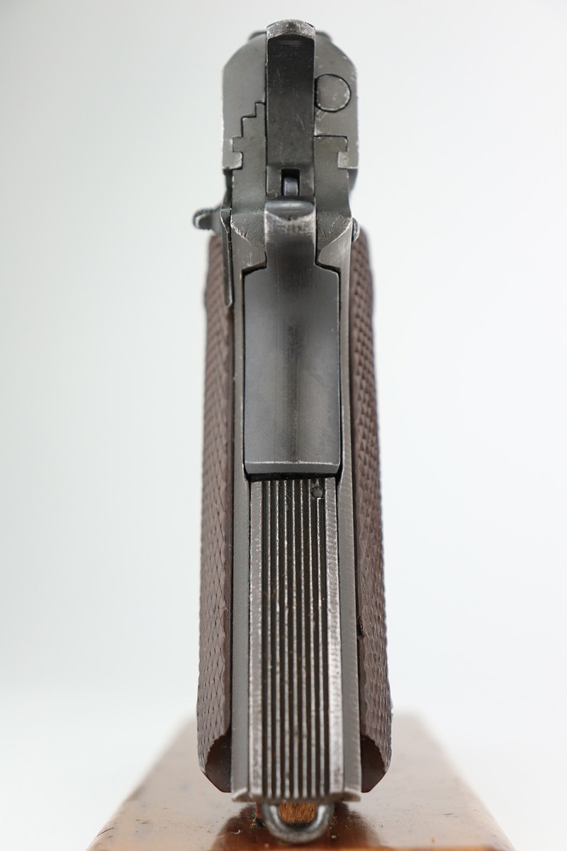 3/3/23 – This is a very nice example of a WW2-era Model 1911A1 pistol put together from parts. The frame was made by Ithaca and dates to 1944. The slide is scarce and made by Union Switch & Signal. The slide should have a dulite finish, but it appears to have been parkerized. The barrel was made by High Standard. The gun has retained about 94% of its finish. Areas of light spotty wear on the front strap, underside of the frame, and along both sides of the slide, concentrated mostly around the high edges. Fitted with period-correct reddish plastic grips. Comes with a period-correct “R” marked magazine. Mint bore.