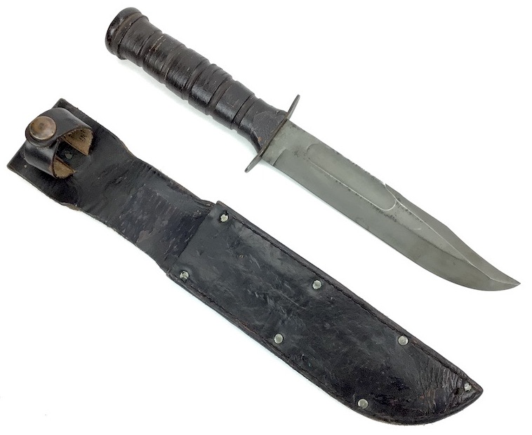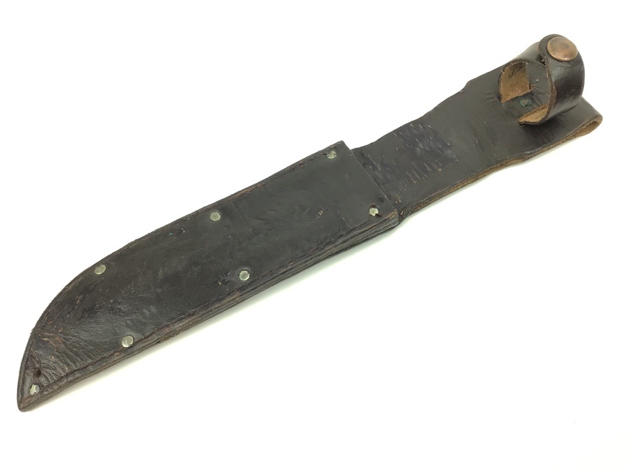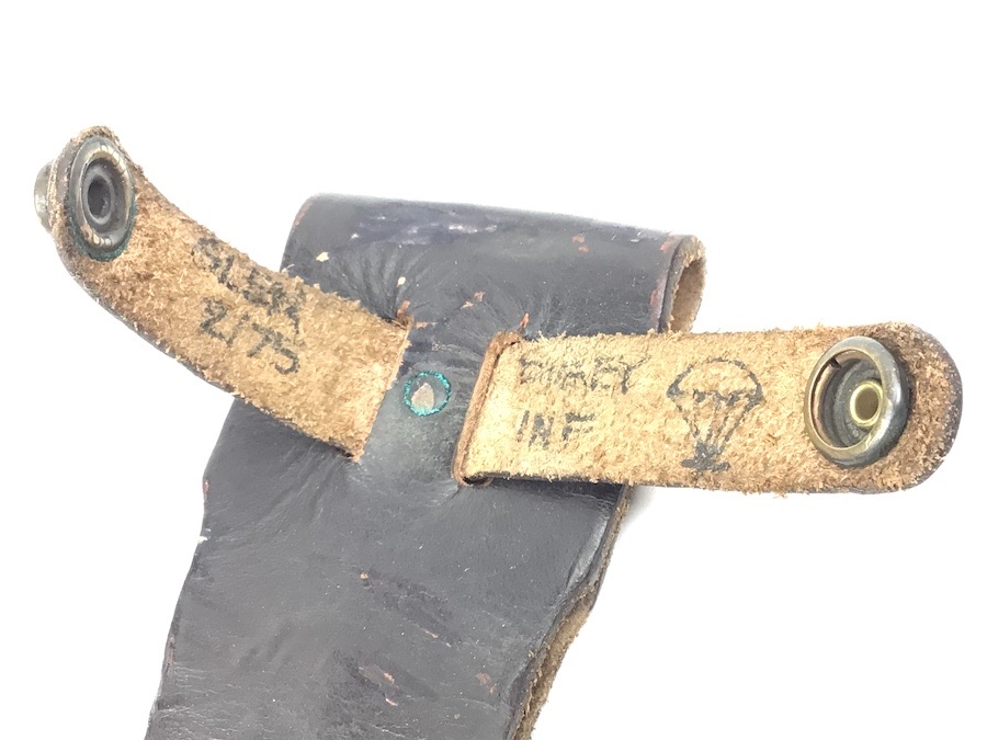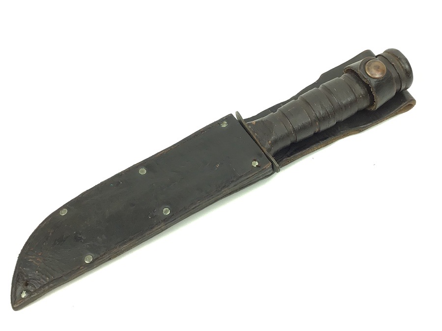 3/22/22 – Original and very good condition. Utica made fighting knife from the Viet Nam era. Includes leather sheath. The 7″ blade has minor wear with a nice patina. No sharpening evident. Stacked leather handle is tight and intact. Leather sheath has intact stitching and rivets. Personalized on the reverse side of the snap enclosure.