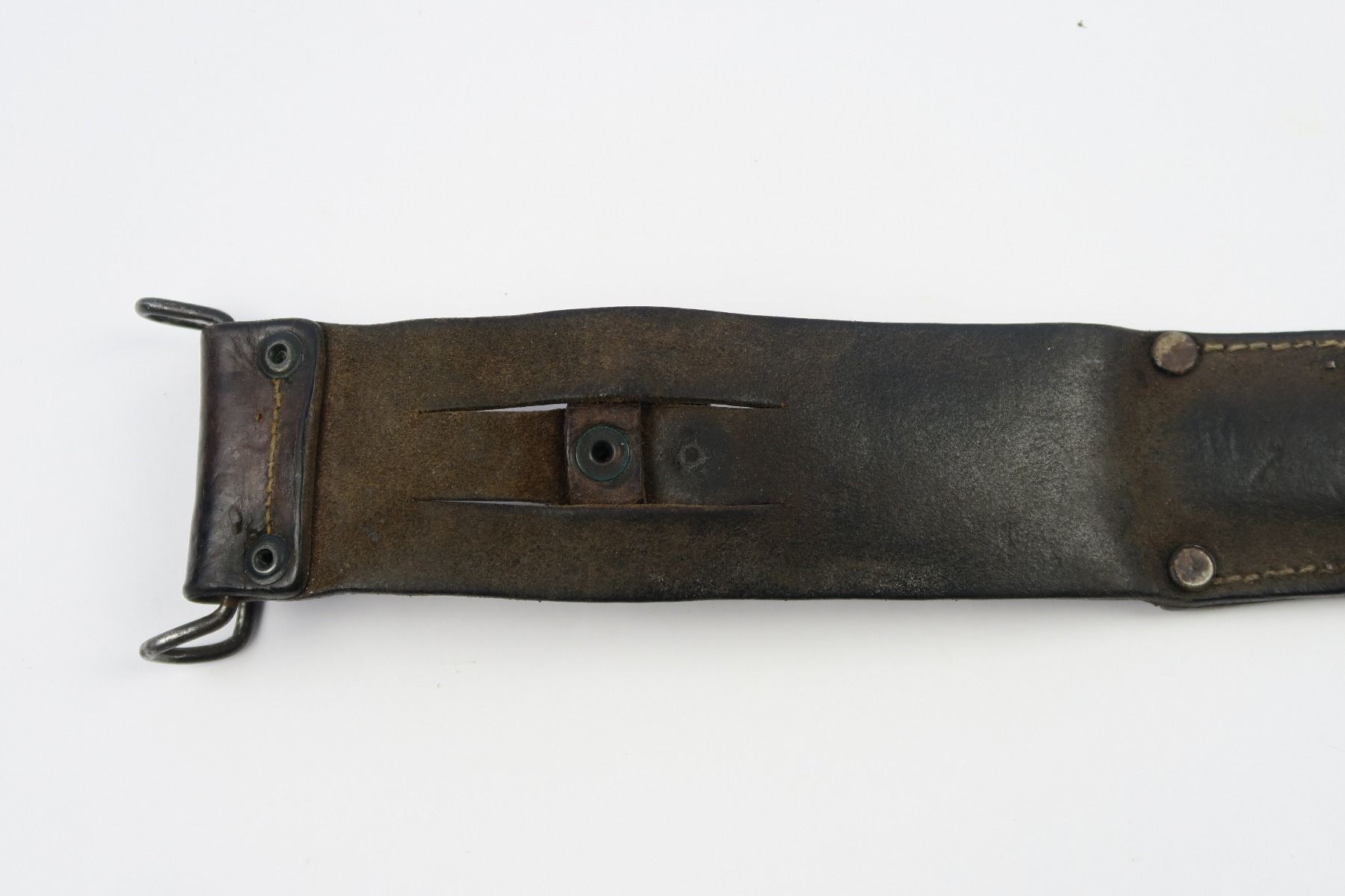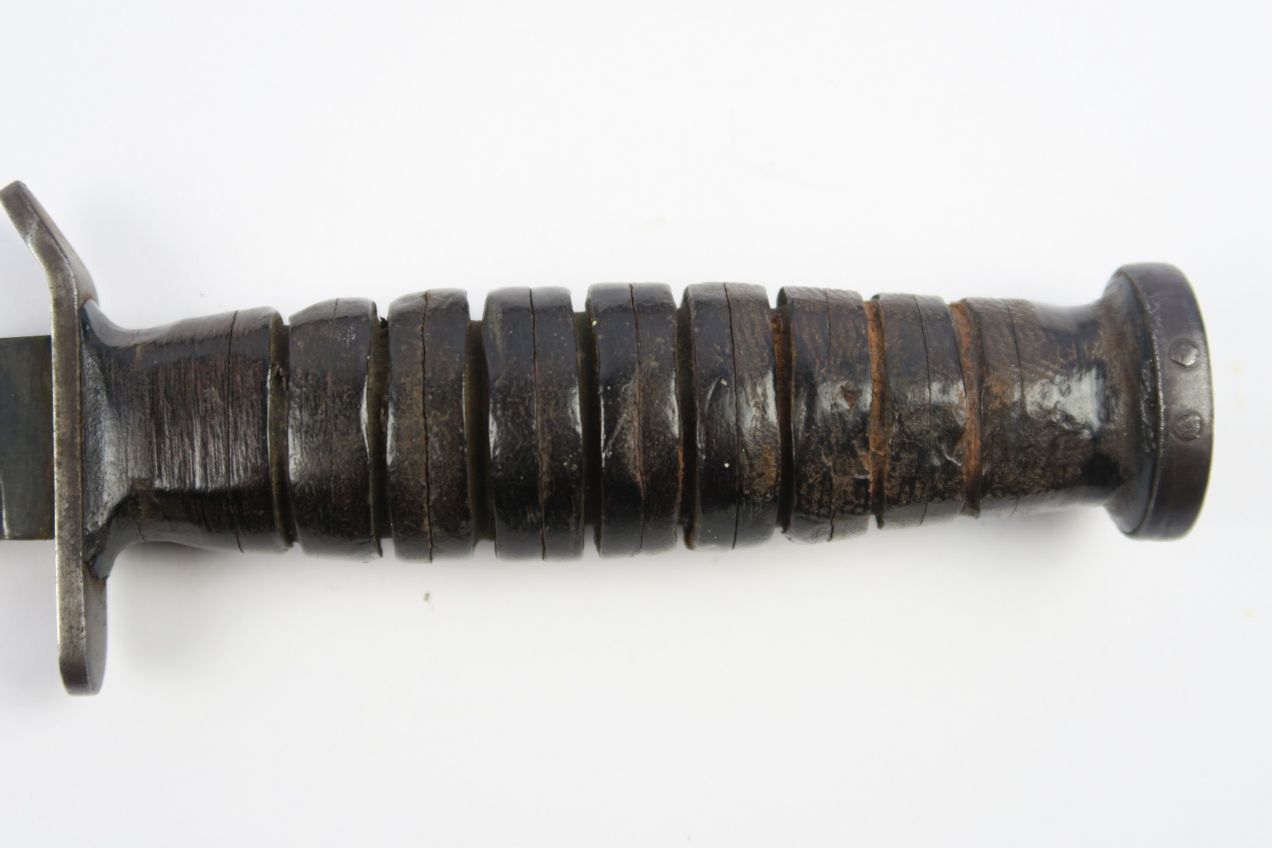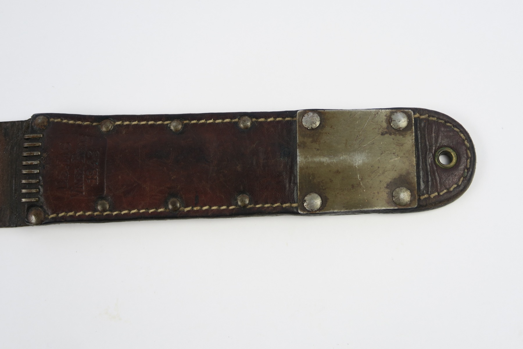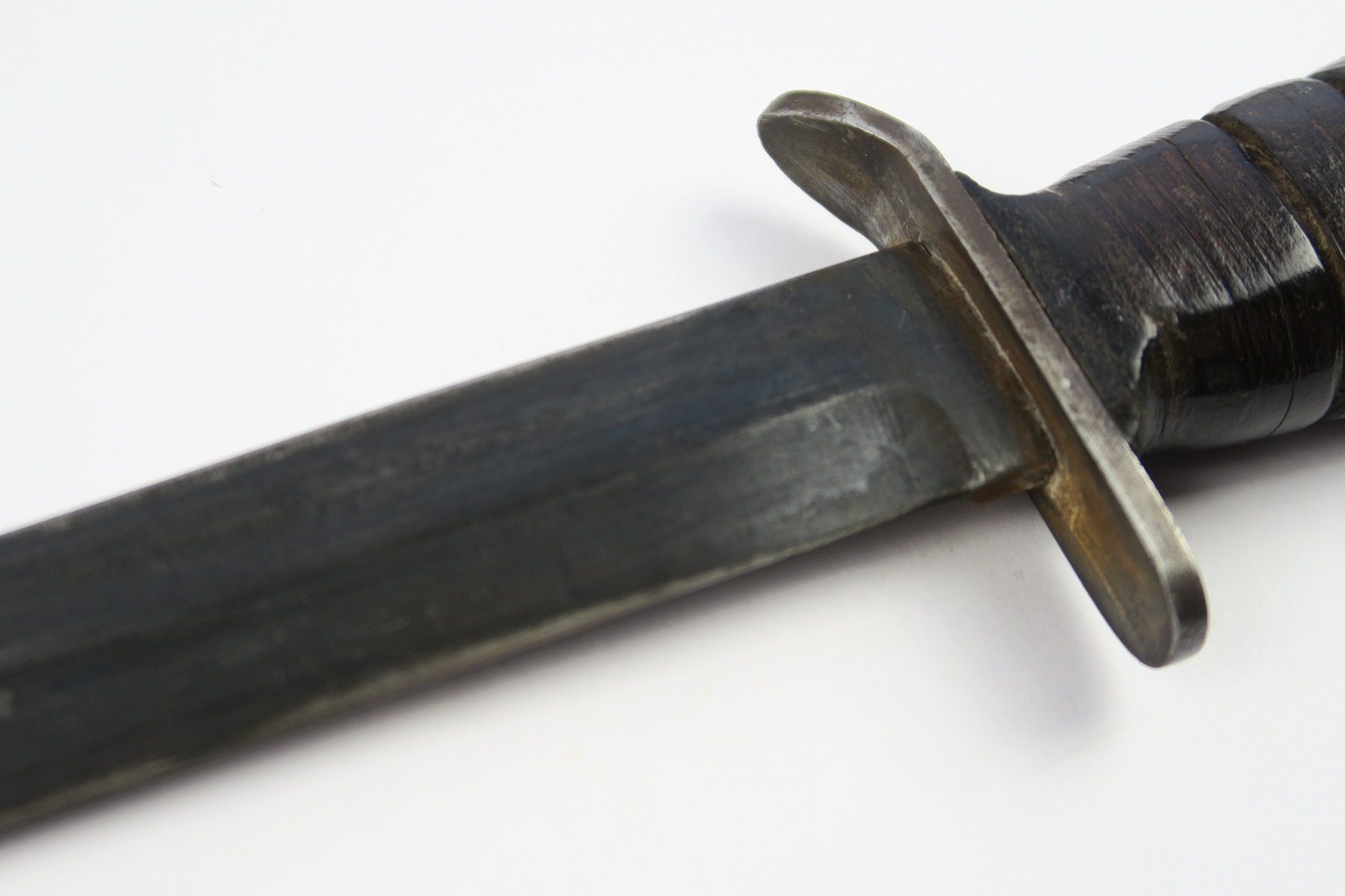 3/19/18 – This is an original WW2 US M3 fighting knife with an original M6 leather scabbard. The blade is blued and in great condition with some light scratch marks mostly from the scabbard and light use. There are no signs of sharpening. The blade is maker stamped and dated 1943. The leather handle has some minor “play” where the leather wiggles a little bit, but this is normal from use (remember these were made for fighting during WW2). The leather scabbard is in excellent condition and made by Viner Bros. The scabbard is all original with no notable flaws – only normal use and aging wear. Guaranteed original and authentic.