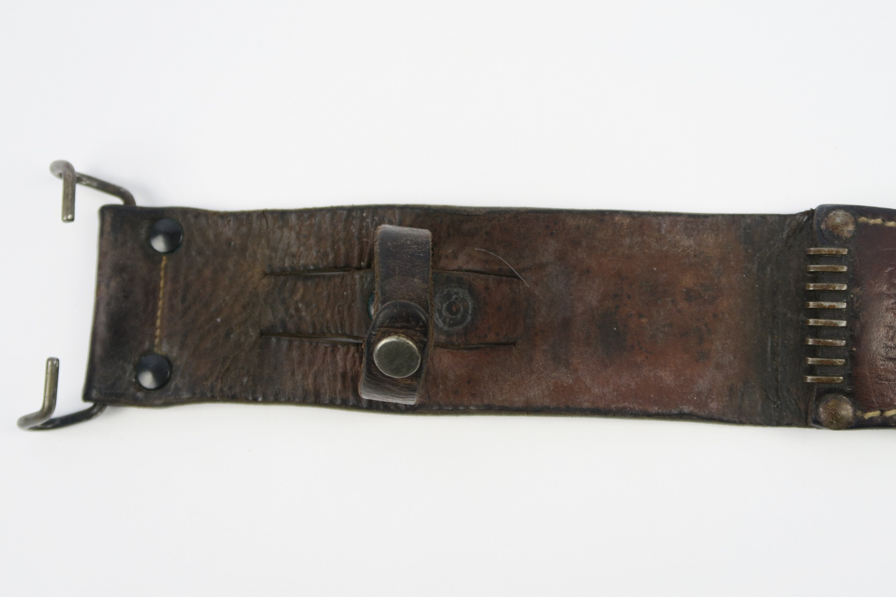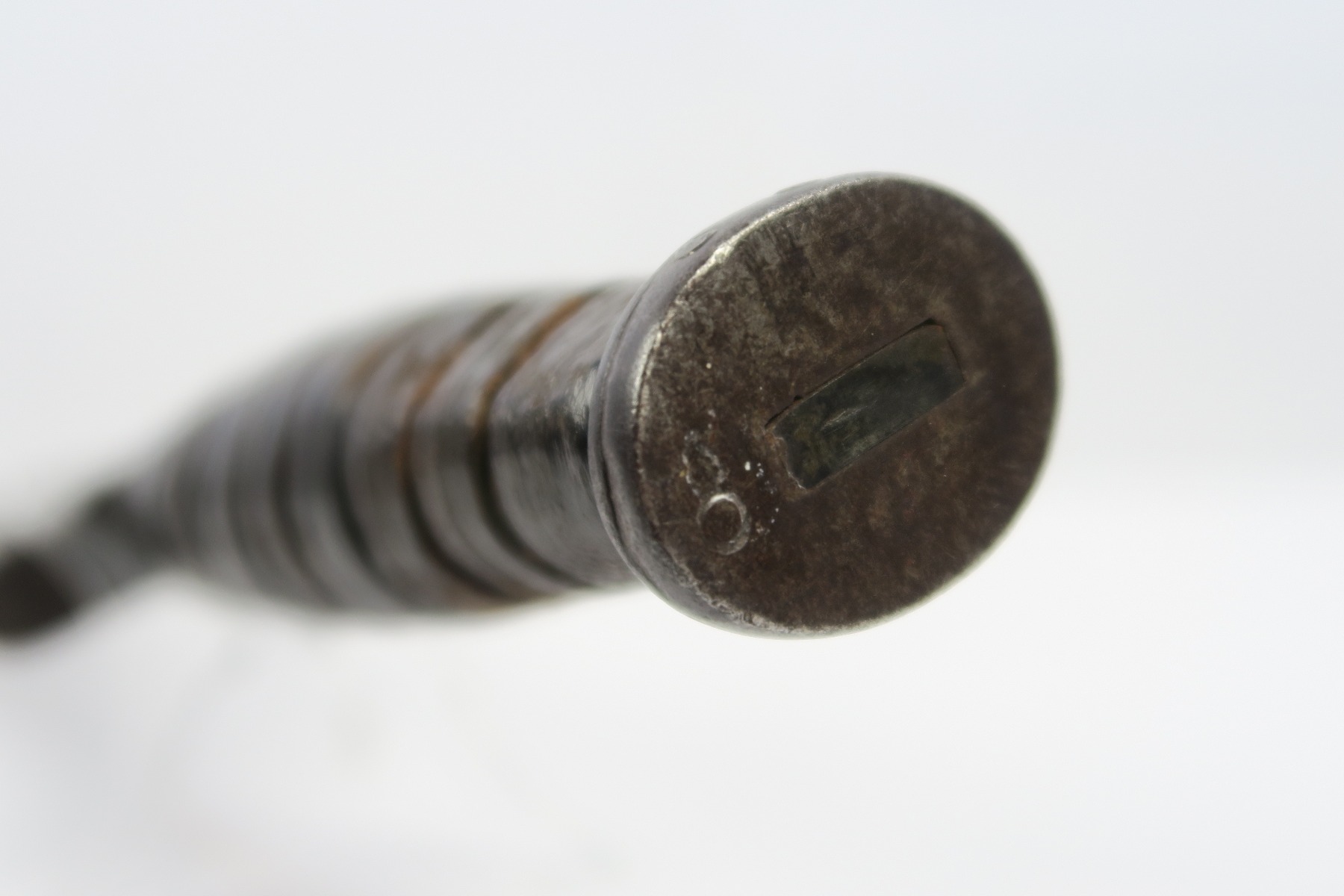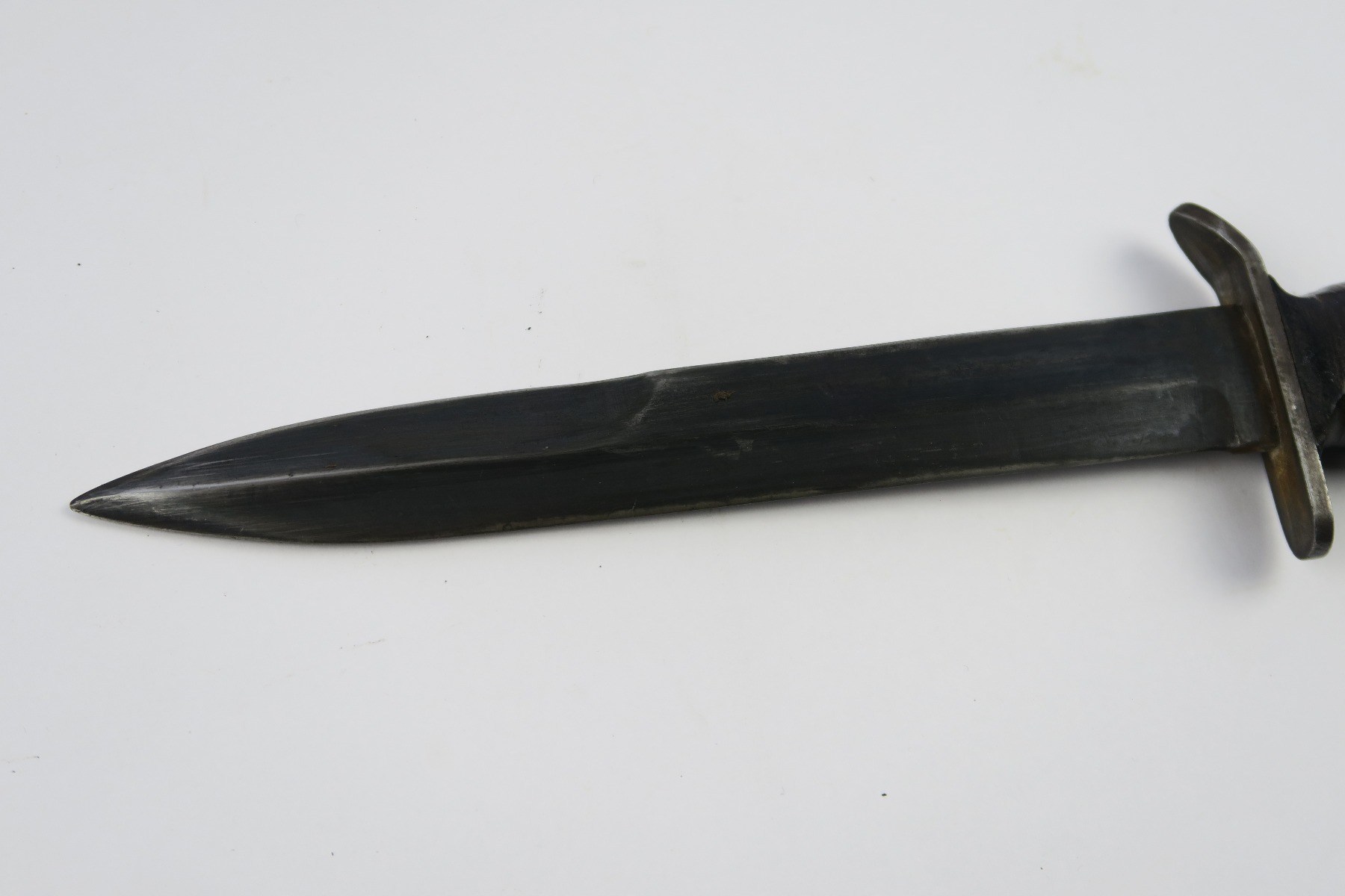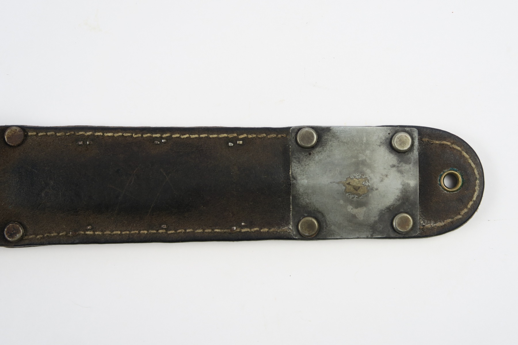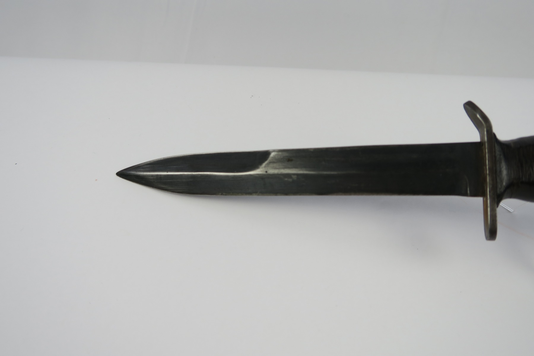 3/19/18 – This is an original WW2 US M3 fighting knife with an original M6 leather scabbard. The blade is blued and in great condition with some light scratch marks mostly from the scabbard and light use. There are no signs of sharpening. The blade is maker stamped and dated 1943. The leather handle has some minor “play” where the leather wiggles a little bit, but this is normal from use (remember these were made for fighting during WW2). The leather scabbard is in excellent condition and made by Viner Bros. The scabbard is all original with no notable flaws – only normal use and aging wear. Guaranteed original and authentic.