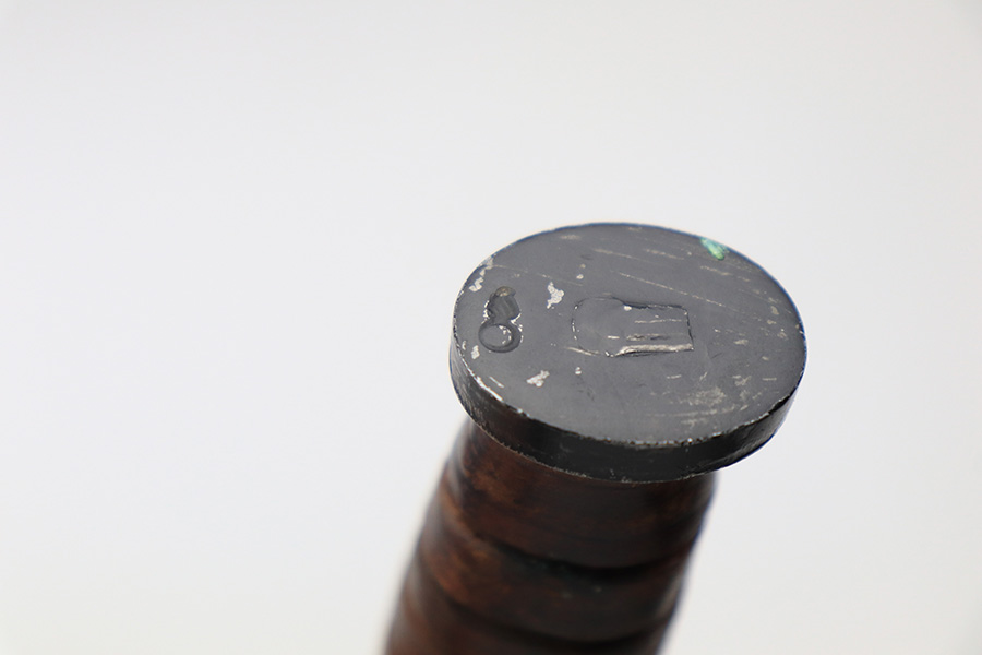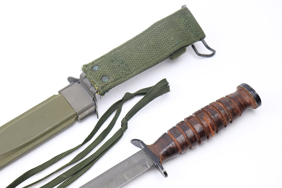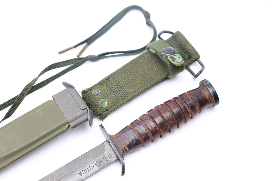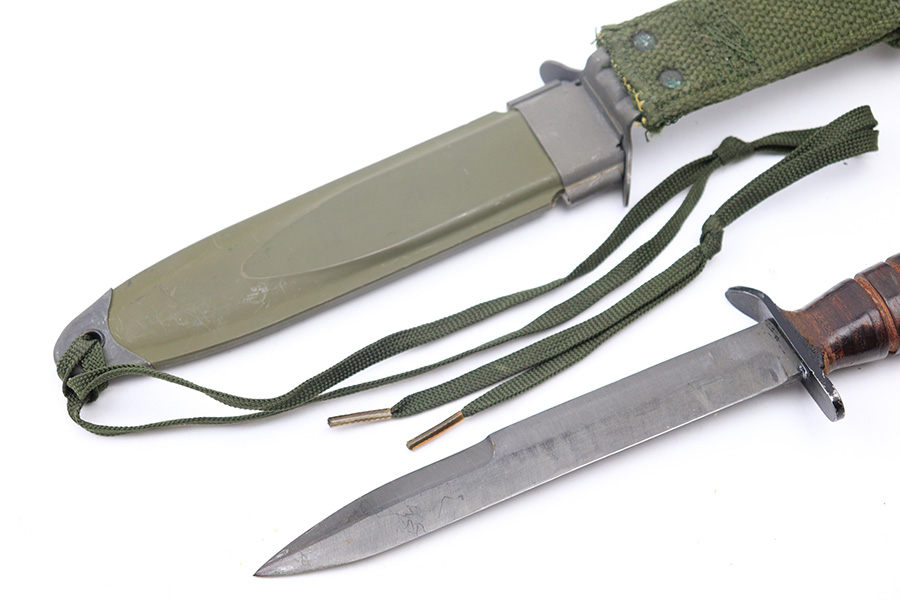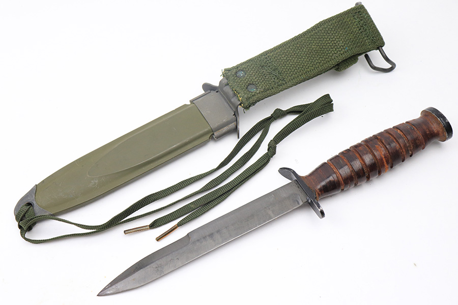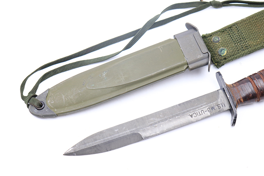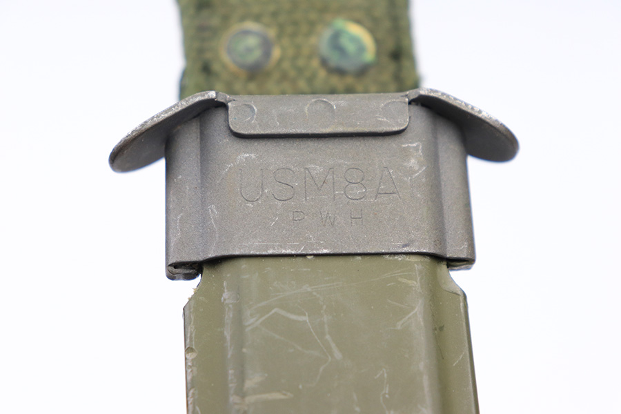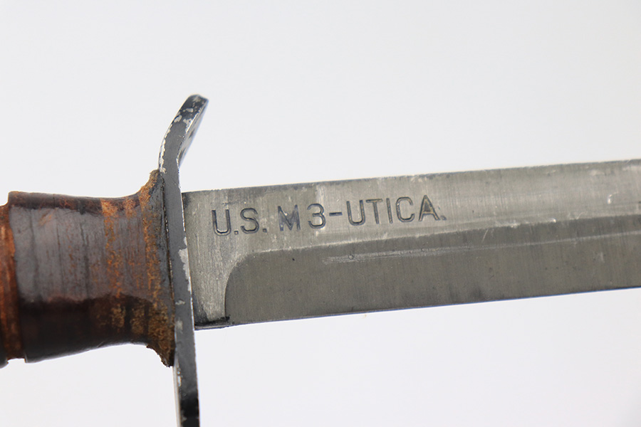 5/31/22 – This is an original WW2 US M3 fighting knife with a post-war M8A1 scabbard. The knife is maker stamped on the blade by Utica. There are no other markings on the parkerized finished blade. There is some mild surface wear and light discoloration but otherwise the blade is in great condition. The hand guard and pommel both have been painted black and retain most of this black finish. The pommel is ordnance stamped. The handle is excellent, as is the scabbard.