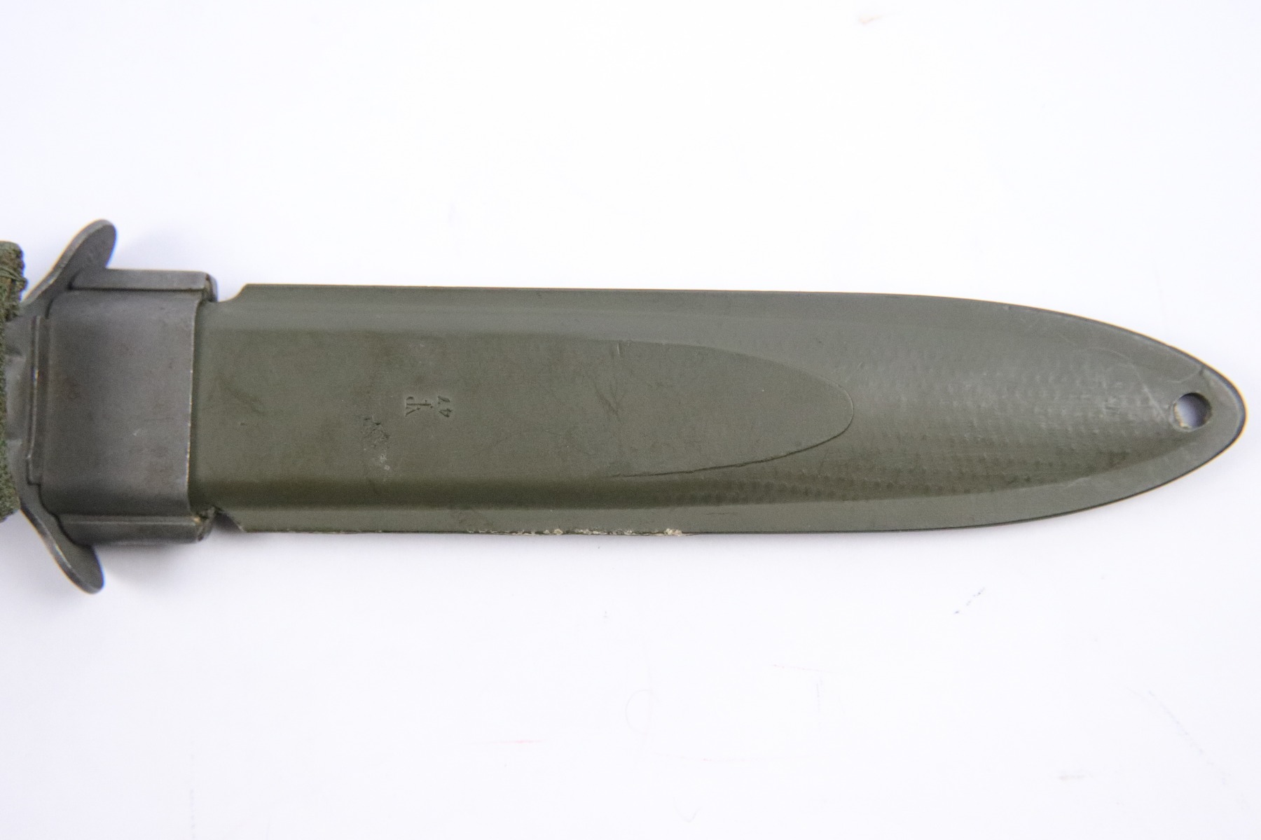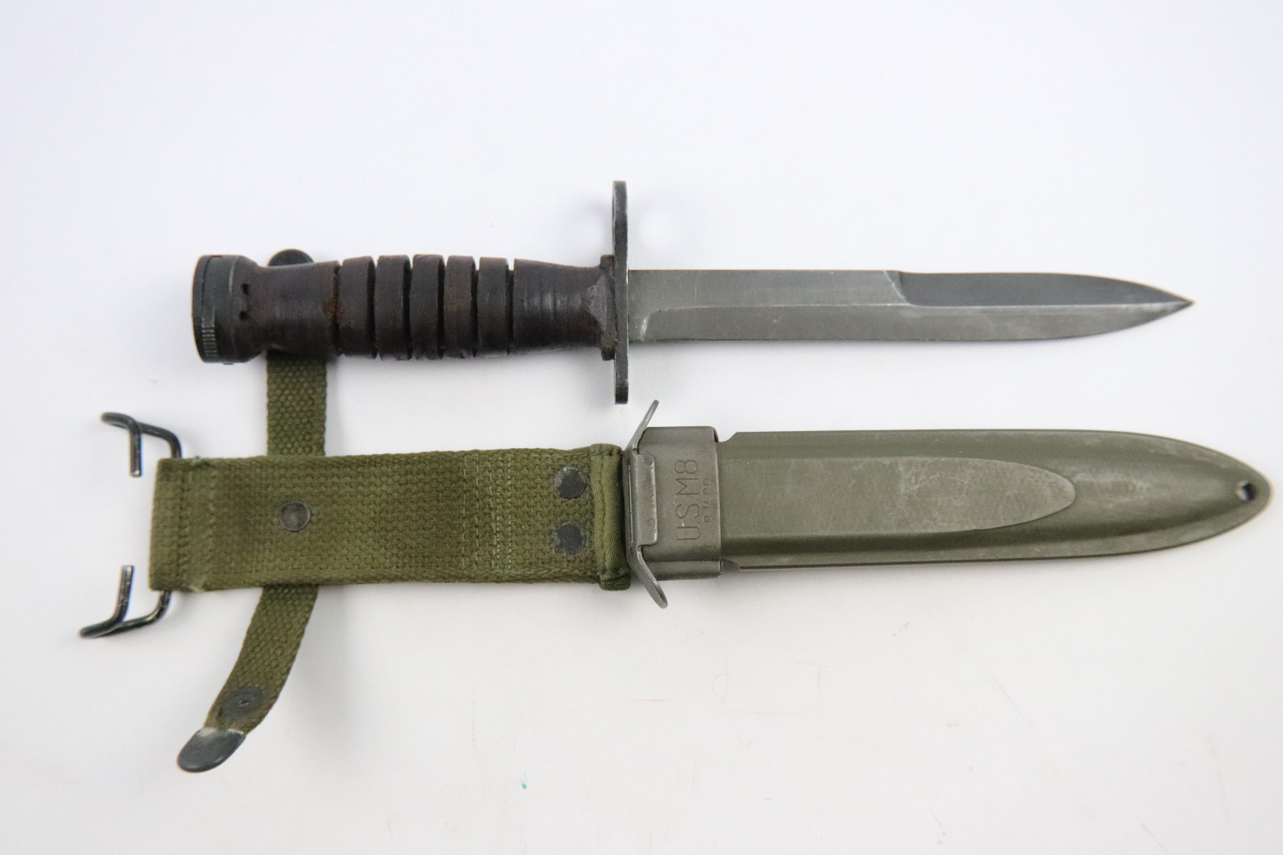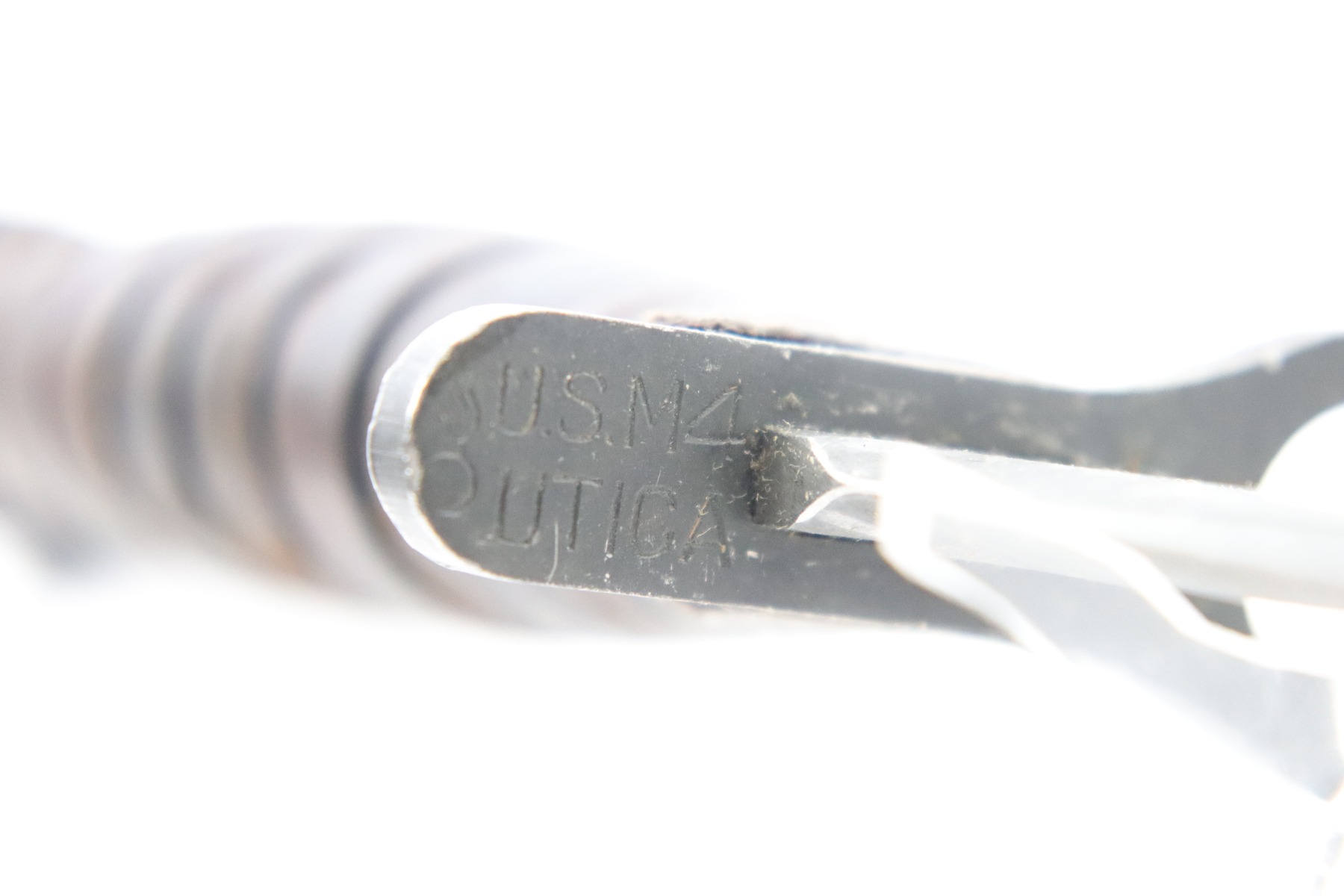 5/18/18 – This is an original Utica US M4 bayonet for the M1 carbine rifle during WW2. The bayonet is US ordnance stamped on the underside of the hand guard, next to the Utica maker stamp. Excellent condition and completely original with an original US M8 scabbard. Guaranteed original and authentic.