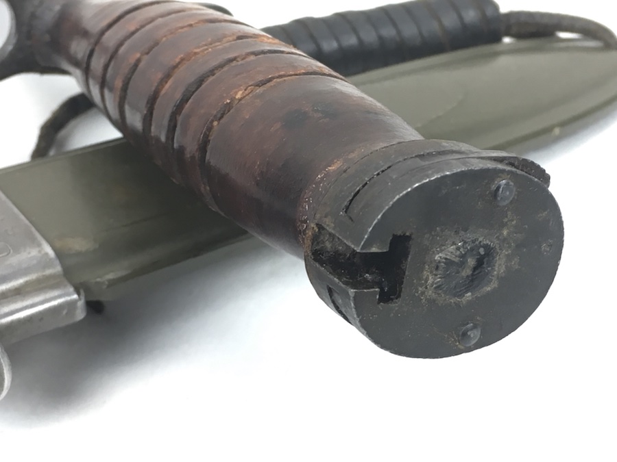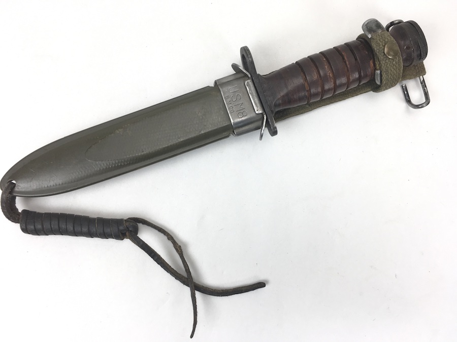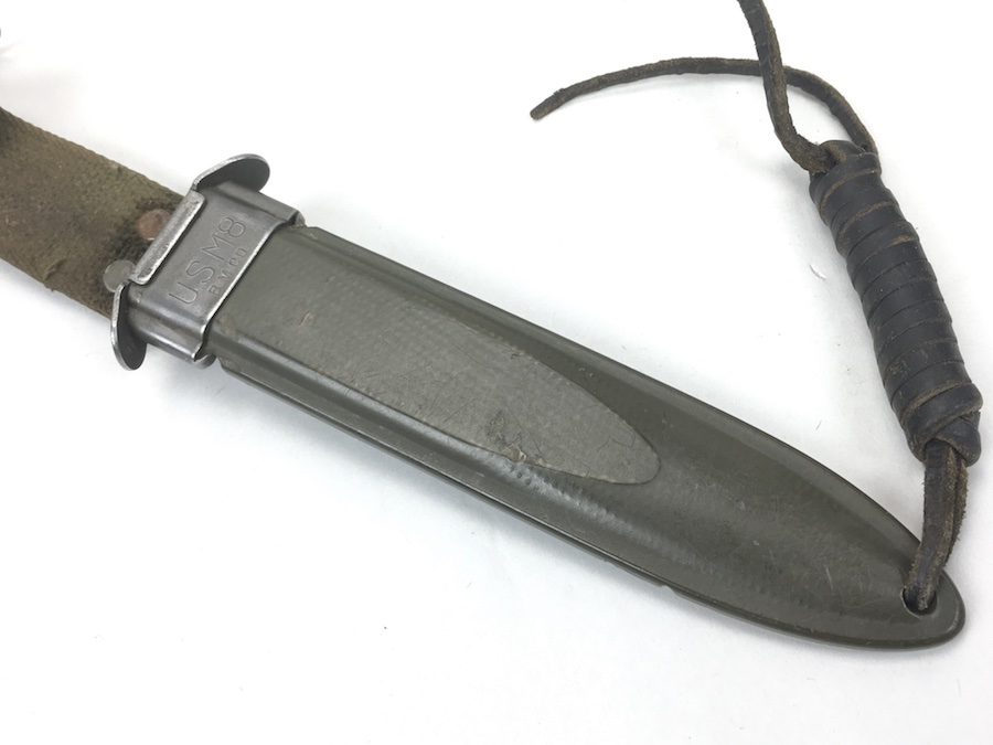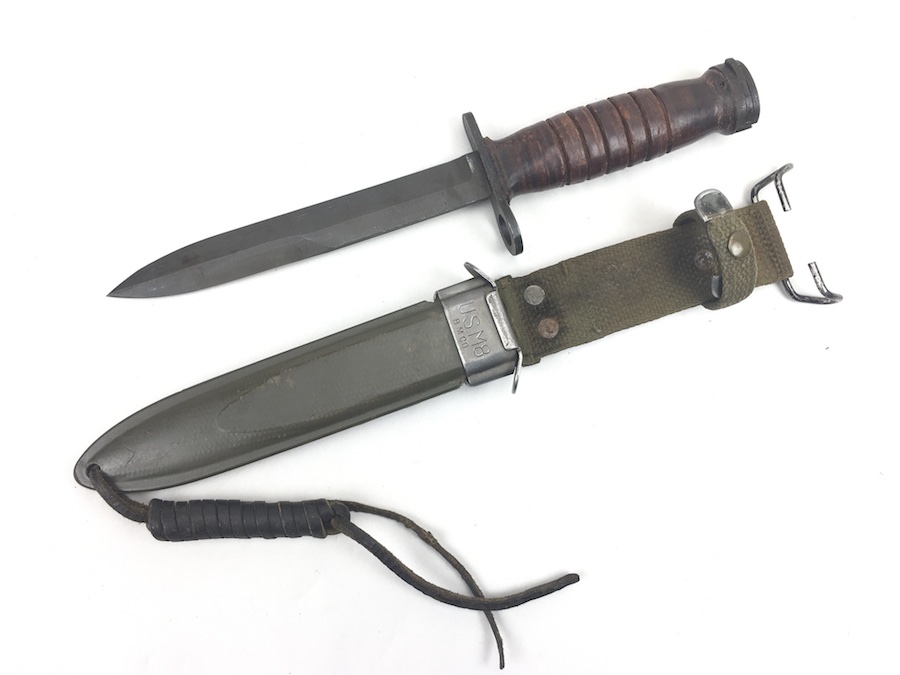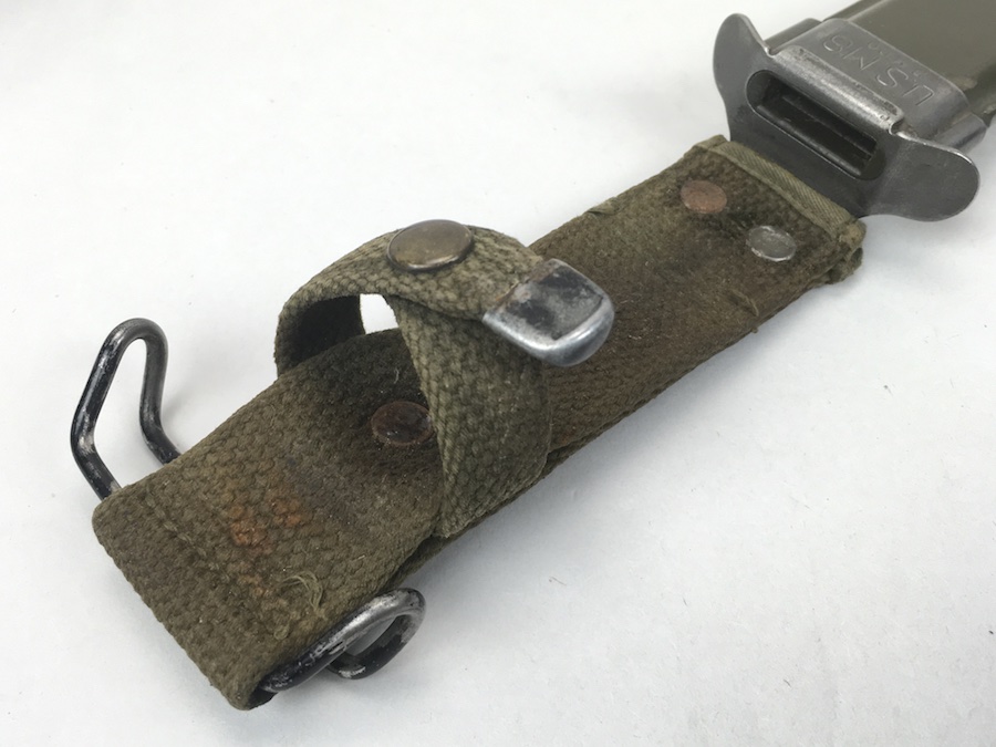 7/1/19 – This is an original Utica US M4 bayonet for the M1 carbine rifle. Manufactured during WW2. The bayonet is US ordnance stamped on the underside of the hand guard, next to the Utica maker stamp. Excellent condition and completely original with an original US M8 scabbard. Leg lanyard still in place. Guaranteed original and authentic.