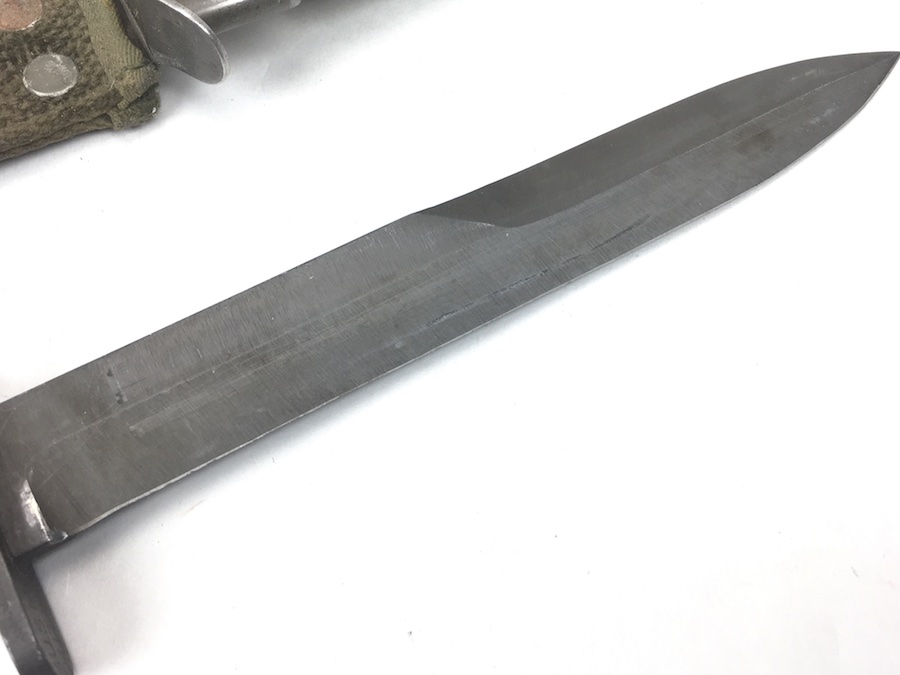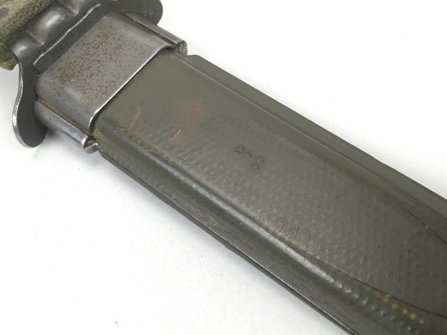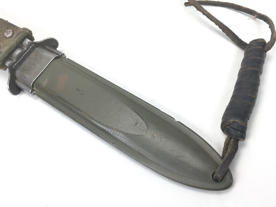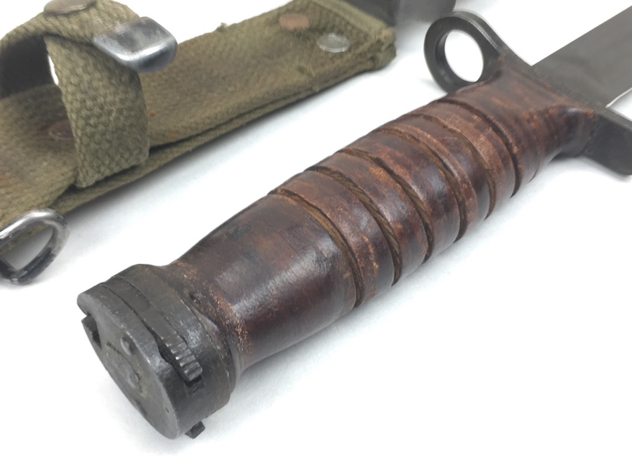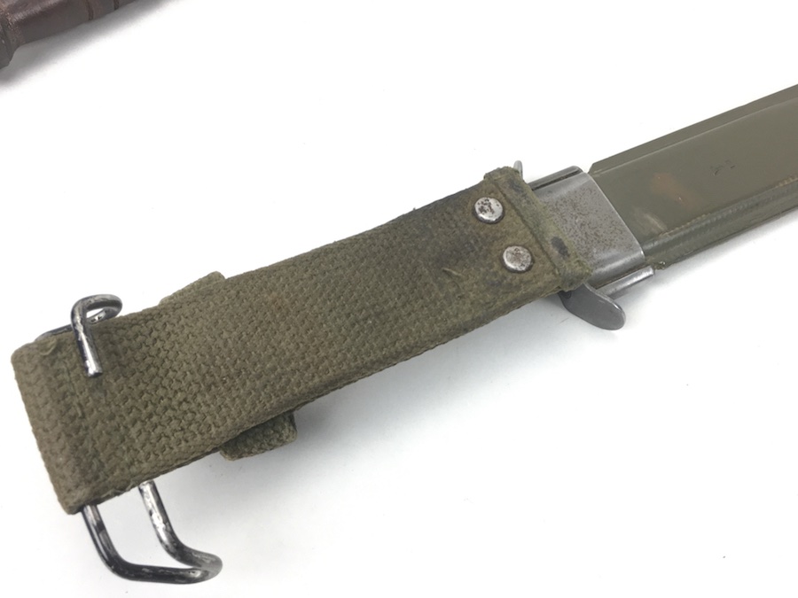 7/1/19 – This is an original Utica US M4 bayonet for the M1 carbine rifle. Manufactured during WW2. The bayonet is US ordnance stamped on the underside of the hand guard, next to the Utica maker stamp. Excellent condition and completely original with an original US M8 scabbard. Leg lanyard still in place. Guaranteed original and authentic.
