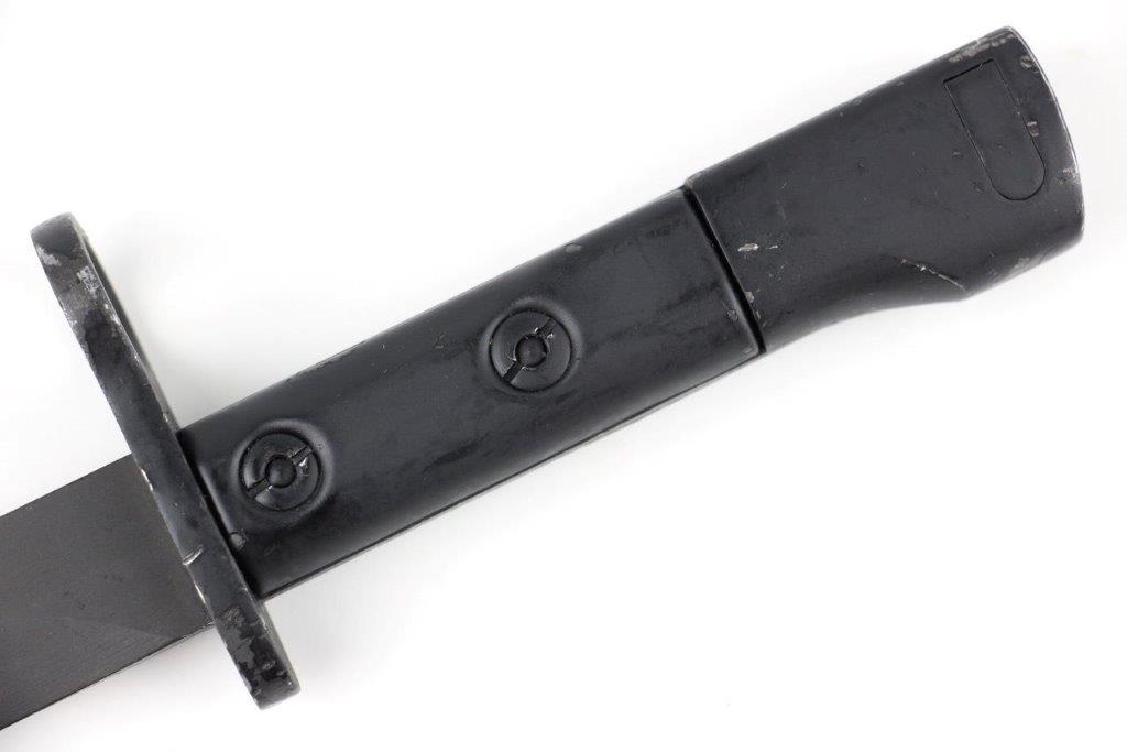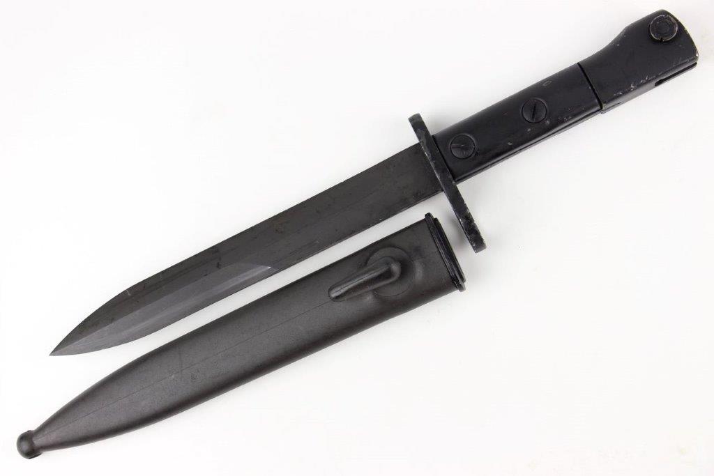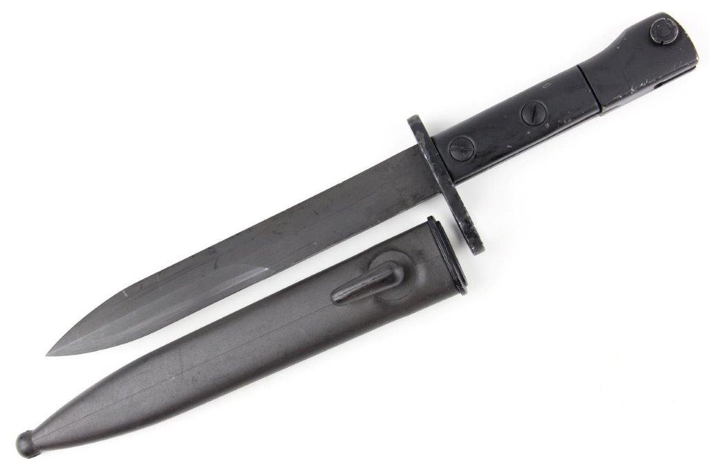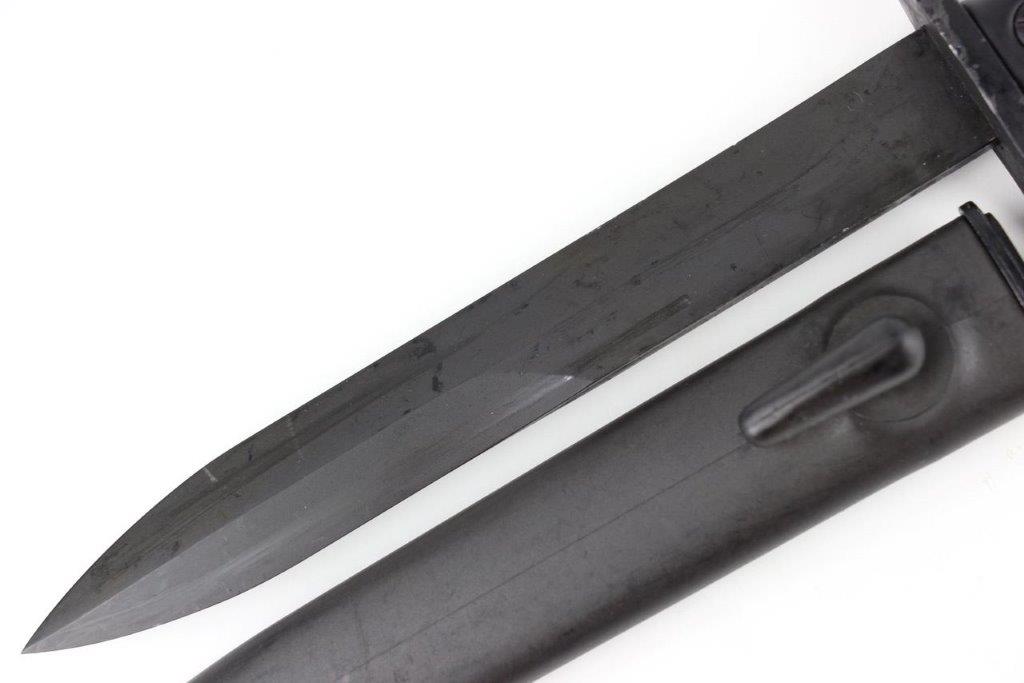 7/1/24 – This is an unmarked, excellent condition Uzi Submachine Gun Bayonet. The bayonet is clean with a parkerized finish on the blade. Unsharpened with light handling and scabbard rub wear. Light handling wear and surface age on the hand guard and pommel, which fits all UZI’s with bayonet lugs. Research finds that this is most likely a 1950’s production example by IMI. Comes with a minty plastic scabbard with German style frog stud. Overall length is about 11 inches (28.1cm) and blade length is about 6.75 inches (17.1cm).
