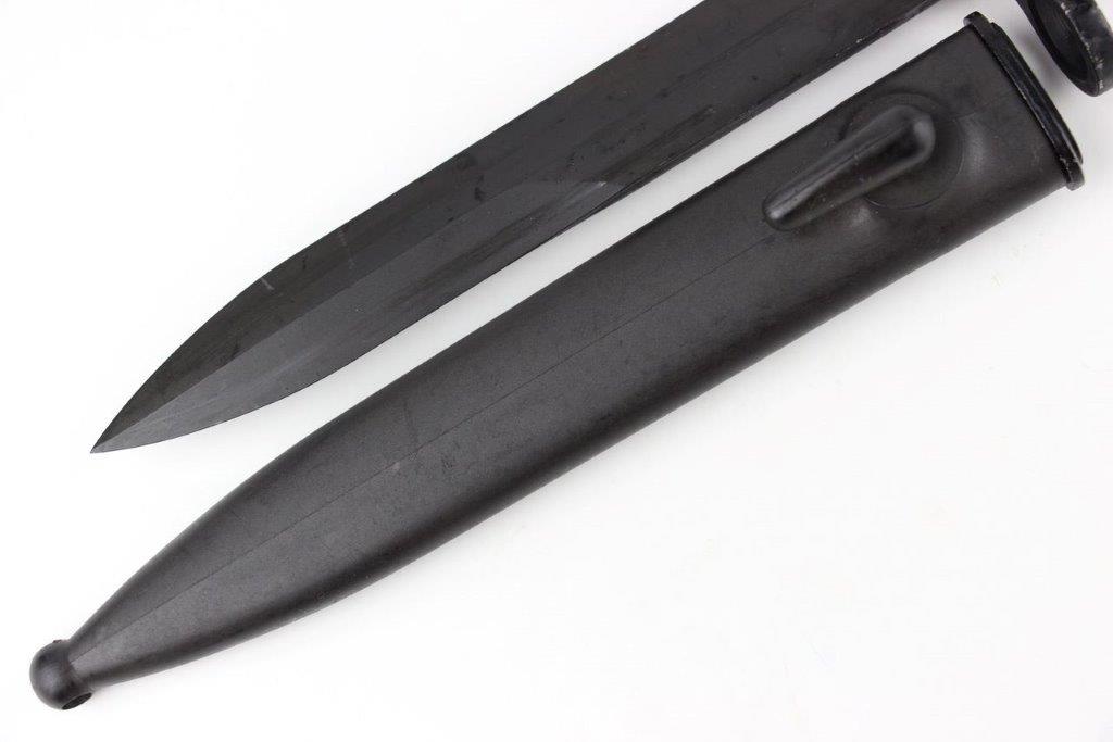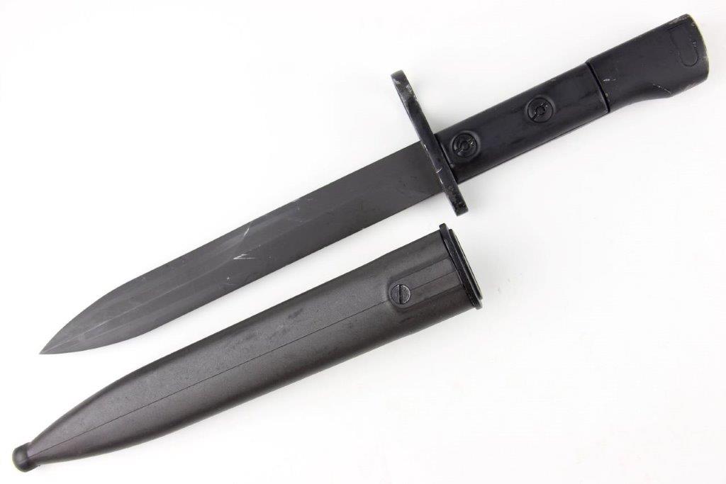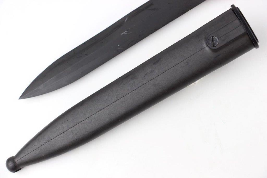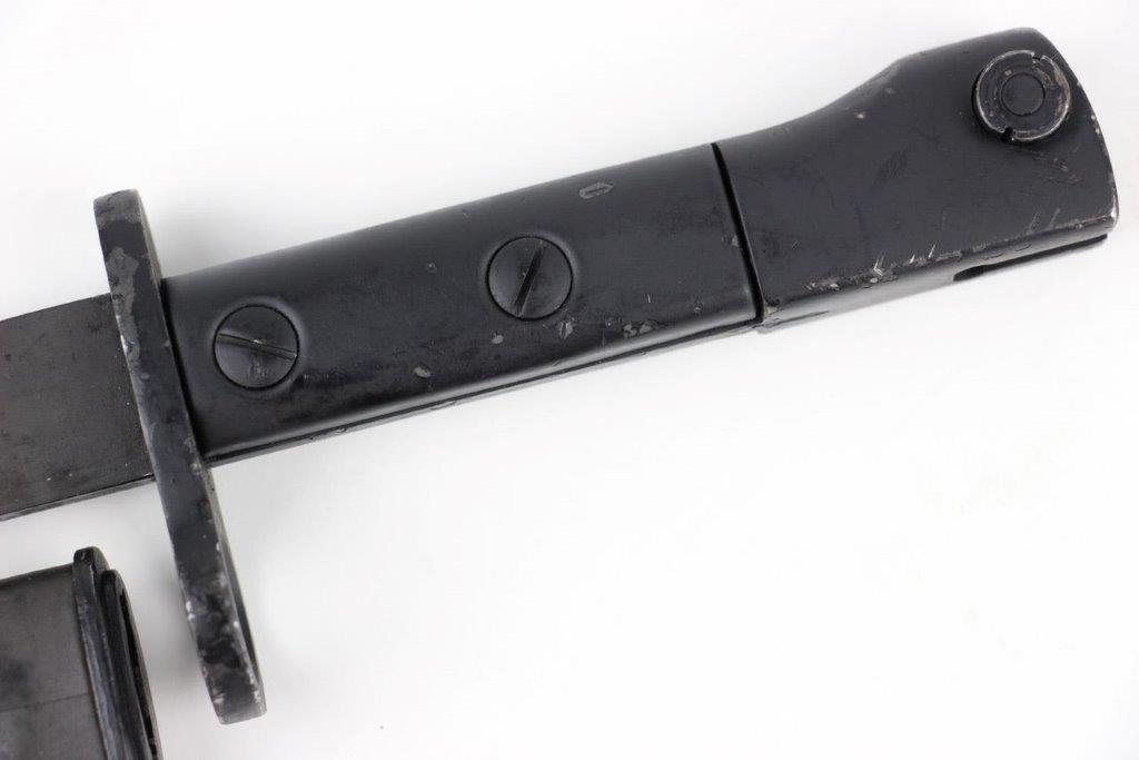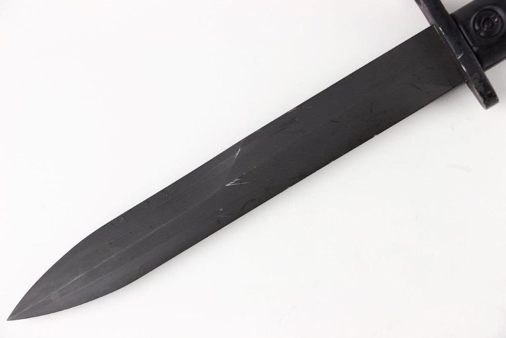 7/1/24 – This is an unmarked, excellent condition Uzi Submachine Gun Bayonet. The bayonet is clean with a parkerized finish on the blade. Unsharpened with light handling and scabbard rub wear. Light handling wear and surface age on the hand guard and pommel, which fits all UZI’s with bayonet lugs. Research finds that this is most likely a 1950’s production example by IMI. Comes with a minty plastic scabbard with German style frog stud. Overall length is about 11 inches (28.1cm) and blade length is about 6.75 inches (17.1cm).