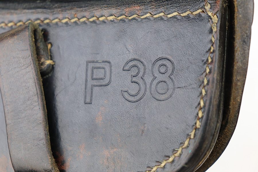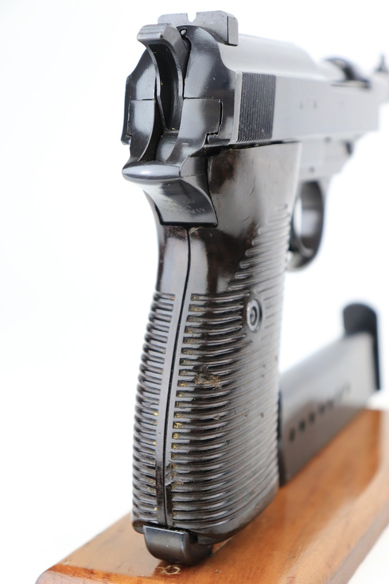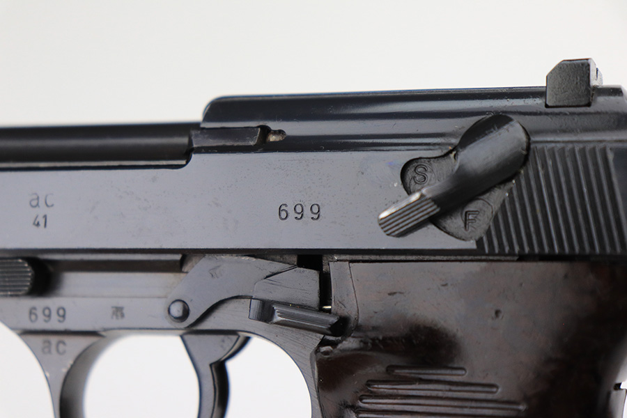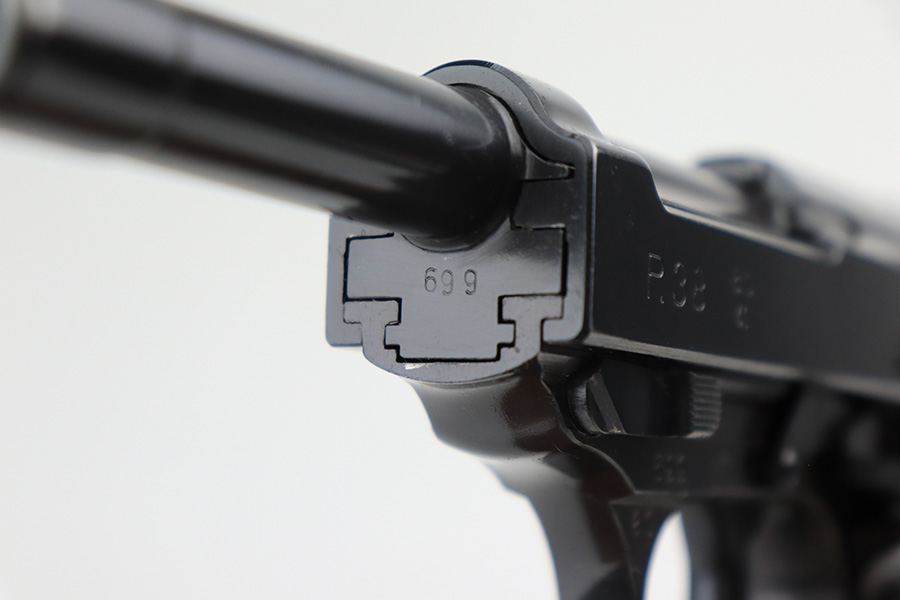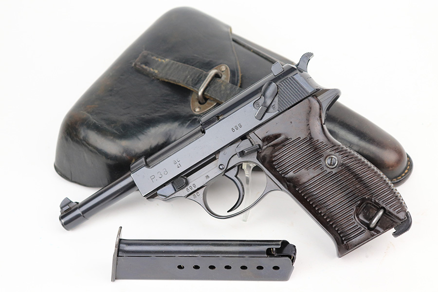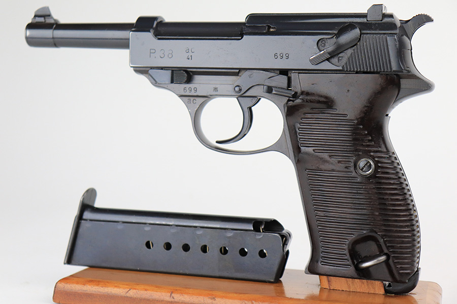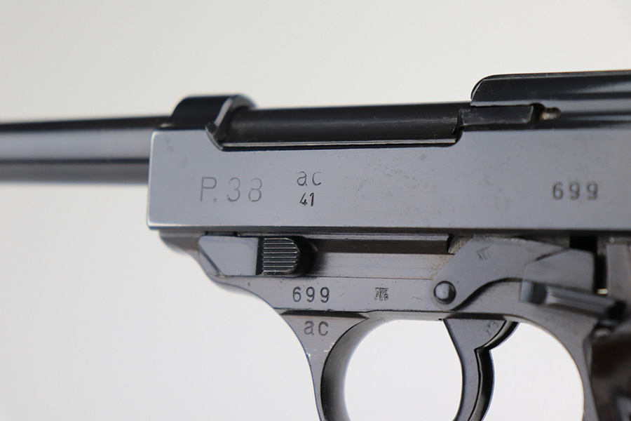 5/20/22 – This is an excellent example of a very early “AC 41” Walther P.38 issued to the Nazi military in 1941. It is a first-variation pistol with “ac” on the trigger guard and has a particularly early “699” serial number. It is all matching and has the proper “Eagle 359” military acceptance proofs throughout, even on the small parts. It comes as a rig with a very nice 1941-dated hardshell holster and an un-numbered “Eagle 359” marked magazine. We believe the entire gun has been professionally restored, so the finish is bright and beautiful. A few very light scratches on the right side of the slide. Both grips are “Eagle 359” proofed – the left panel is numbered and not matching, the right is un-numbered. The bore has strong rifling with some minor freckling here and there. De-cocker is functional. Import mark under the tang.