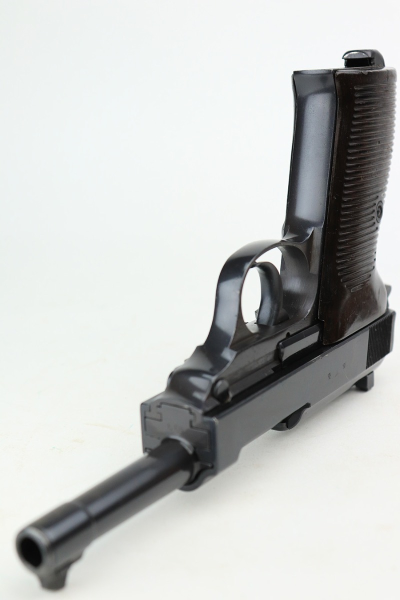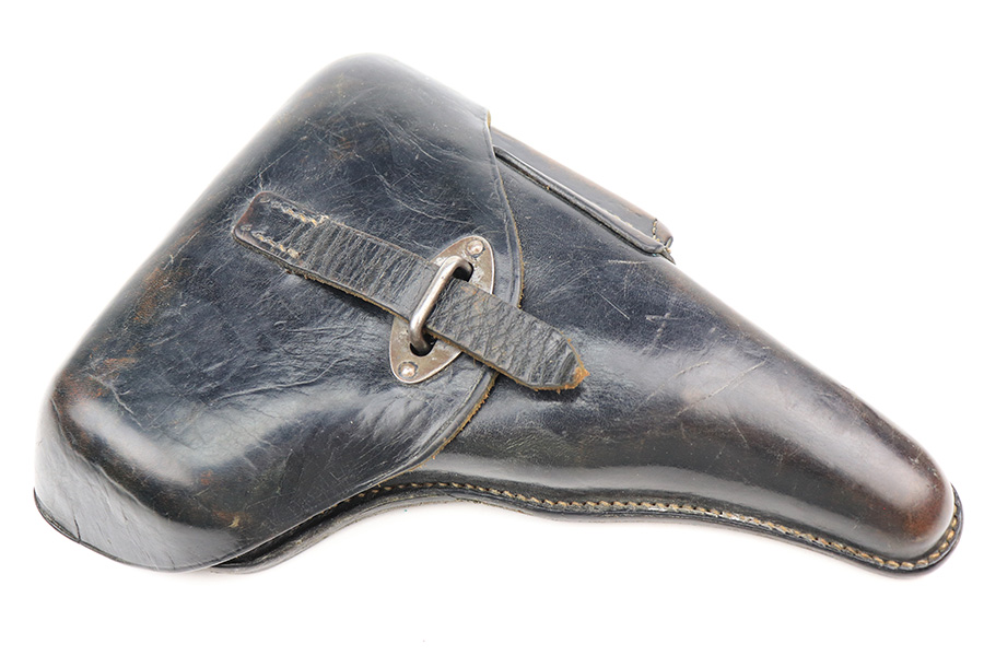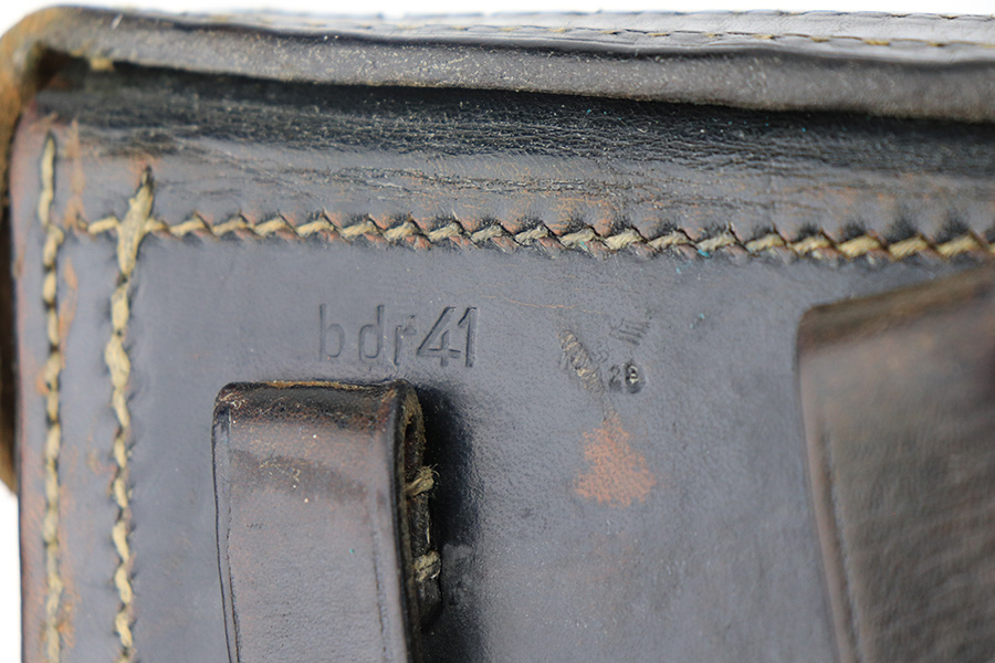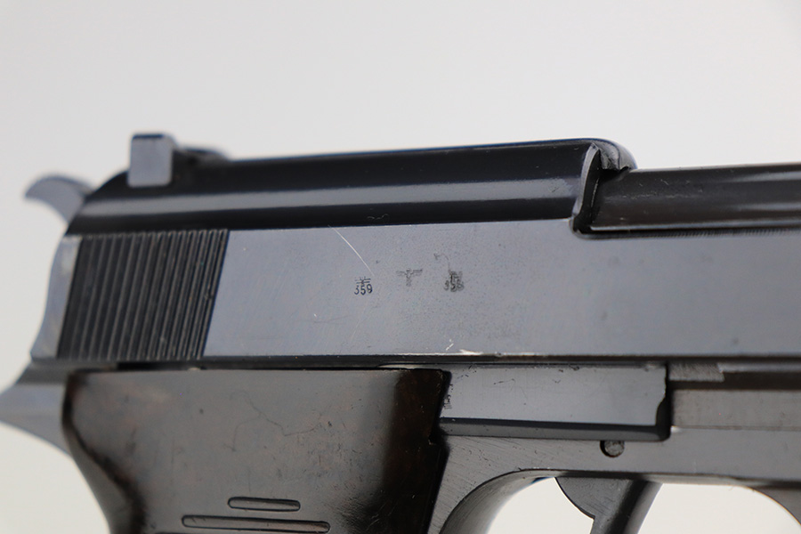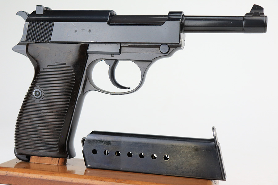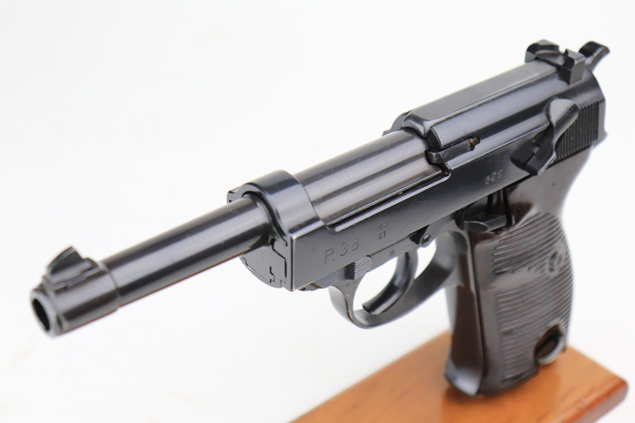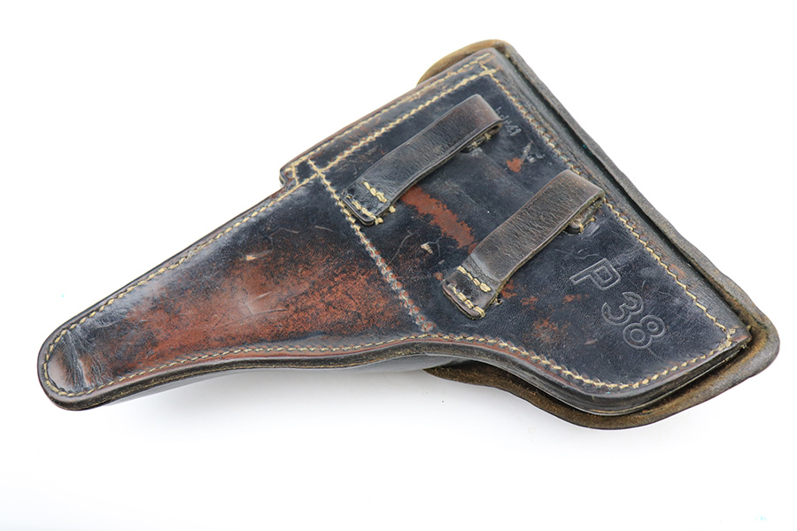 5/20/22 – This is an excellent example of a very early “AC 41” Walther P.38 issued to the Nazi military in 1941. It is a first-variation pistol with “ac” on the trigger guard and has a particularly early “699” serial number. It is all matching and has the proper “Eagle 359” military acceptance proofs throughout, even on the small parts. It comes as a rig with a very nice 1941-dated hardshell holster and an un-numbered “Eagle 359” marked magazine. We believe the entire gun has been professionally restored, so the finish is bright and beautiful. A few very light scratches on the right side of the slide. Both grips are “Eagle 359” proofed – the left panel is numbered and not matching, the right is un-numbered. The bore has strong rifling with some minor freckling here and there. De-cocker is functional. Import mark under the tang.
