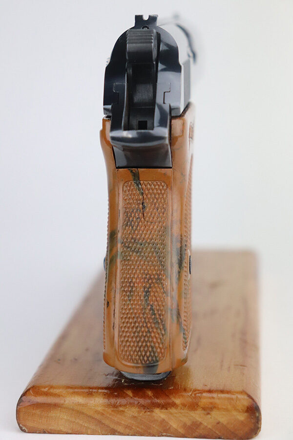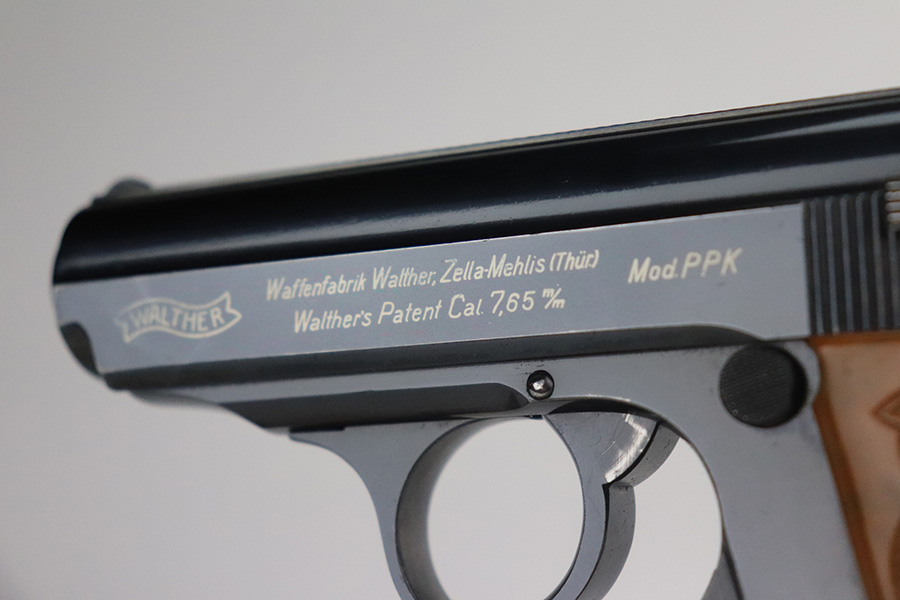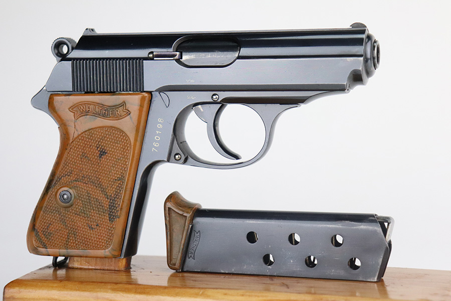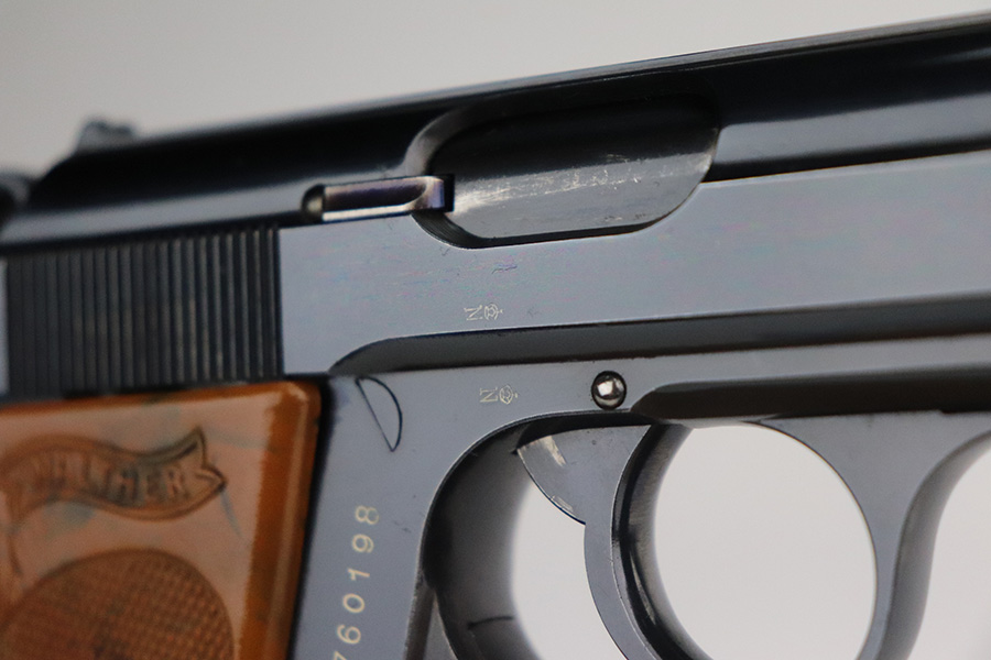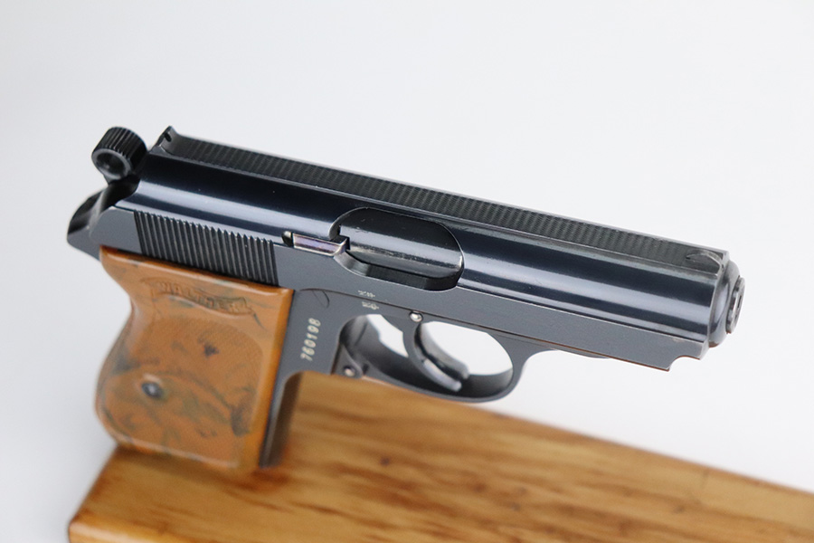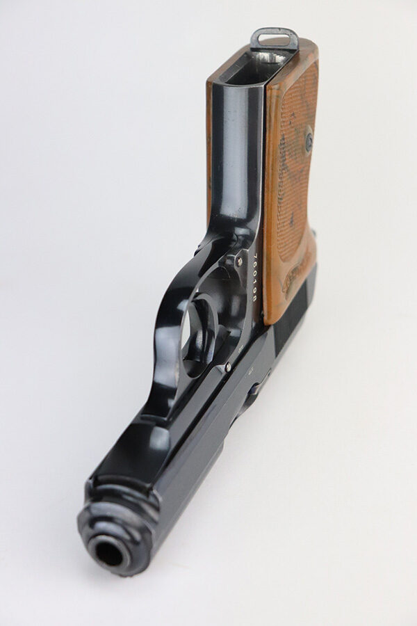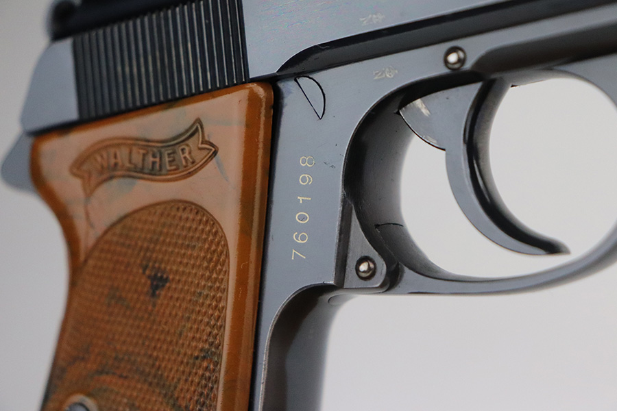 7/6/21 – This is a beautiful, mint example of a very early Walther PPK sold in the commercial market in 1930. It is all matching and has the proper “Crown N” commercial proofs. It has all of the proper early features including the reversed serial number, covered firing pin, and 90 degree safety lever. It has retained about 99% of its very nice high polish finish. There is just a hint of wear around the muzzle and one small spot of wear on the front strap. Comes with a very nice brown grip – there are hairline cracks on both sides and down the spine. Also comes with a period-correct banner-only finger extension magazine. Mint bore.