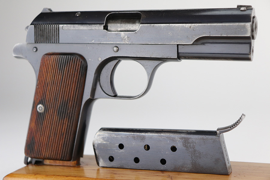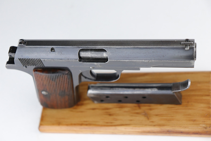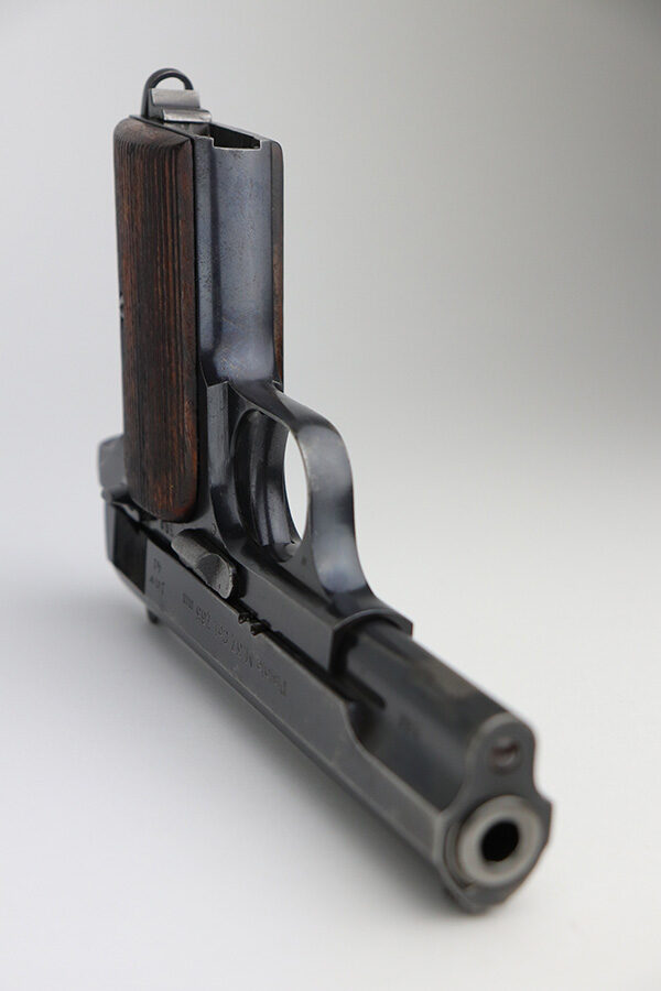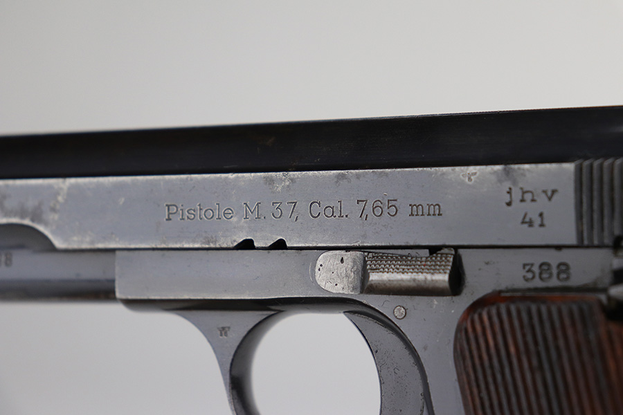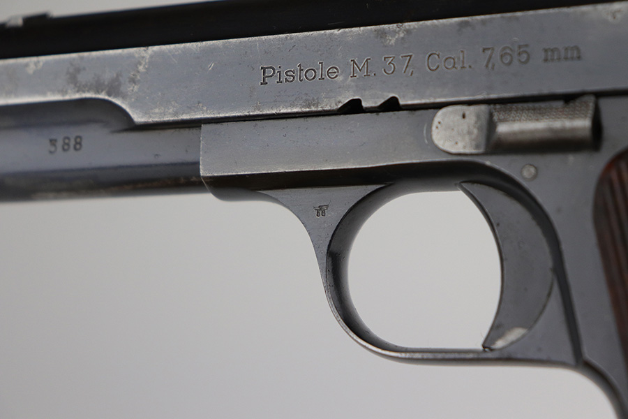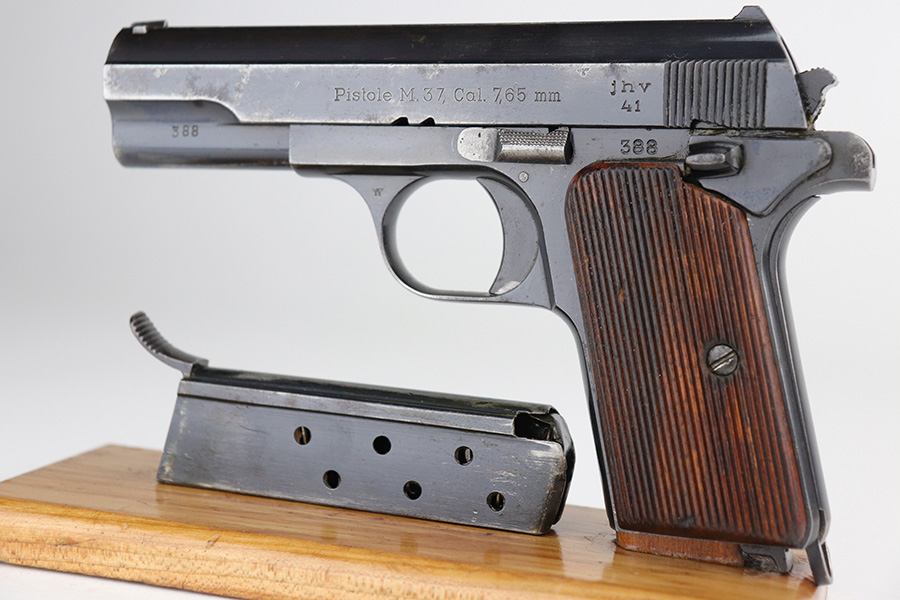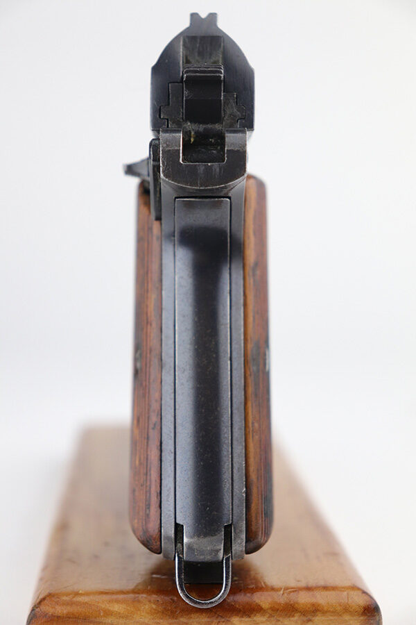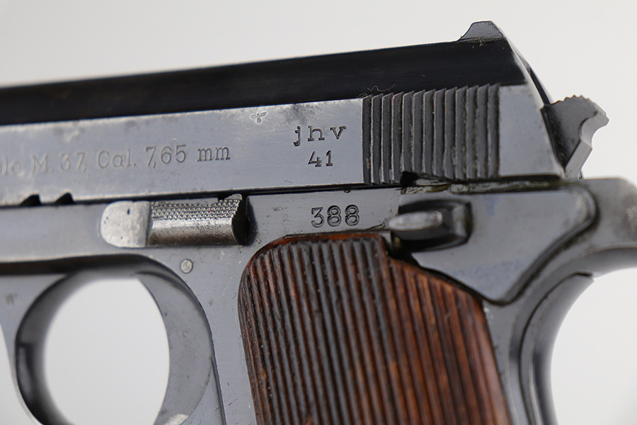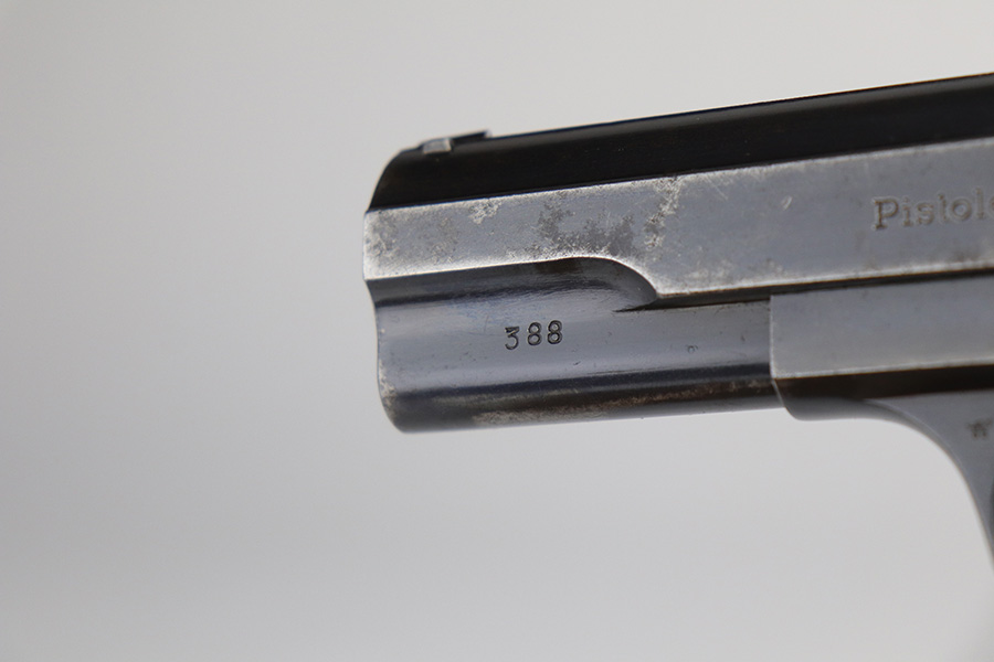 9/1/21 – This is a very nice example of a Femaru M37 issued to the Luftwaffe in 1941. It is all matching and has the proper waffen military proof. This one also has a very early serial number, “388”. It comes with excellent wood grips and a period-correct non-matching magazine. It has retained roughly 85-90% of its finish. There is spotty/splotchy wear on both sides and top of the slide, concentrated around the high edges. Tiny pits and oxidation in the same areas. Pin-pricking on both straps. The take-down lever has lost most of its finish. Mint bore.