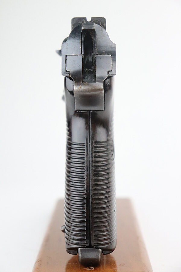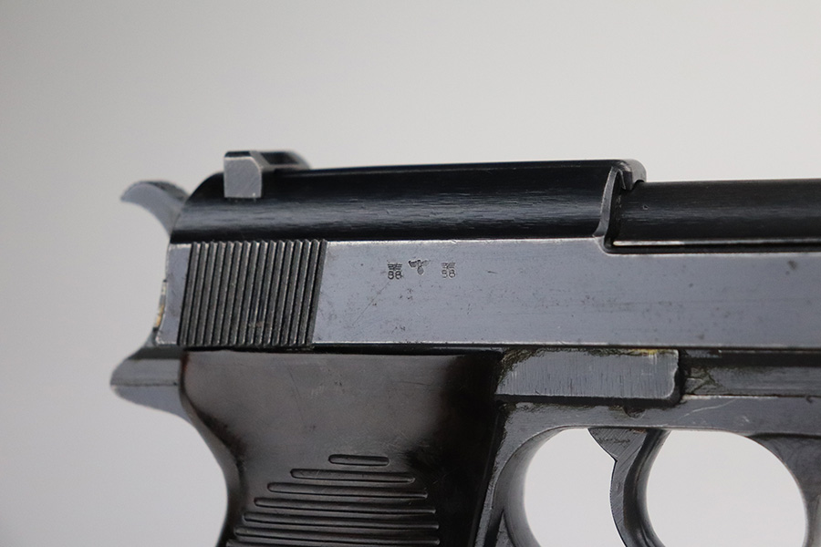 7/3/21 – This is an excellent example of a very early Spreewerk P.38 issued to the Nazi military in October of 1942. It has no letter suffix. It is all matching and has the proper “Eagle 88” military proofs. It has retained about 95% of its original finish. There is minor thinning and patina on the front strap. Minor wear on the high edges of the slide and around the muzzle. Spotty oxidation here and there on the slide. It has the proper Walther grips – Walther was contracted to make these early Spreewerk grips. Also comes with the proper magazine. Mint bore. De-cocker is functional. The slide has trouble locking back, likely because there is a lot of thick grease in the internals. Will likely improve with a good cleaning.