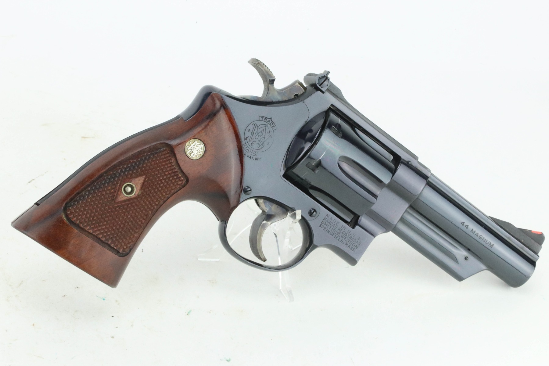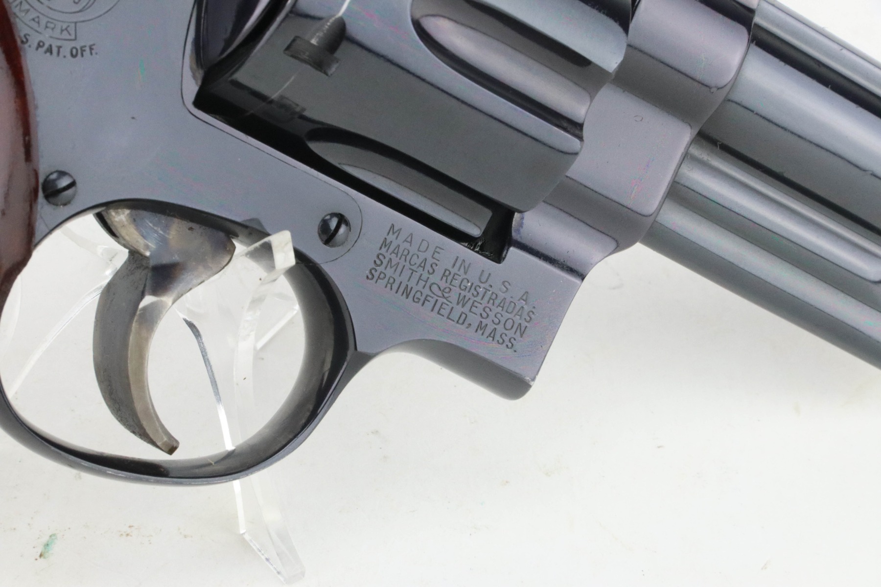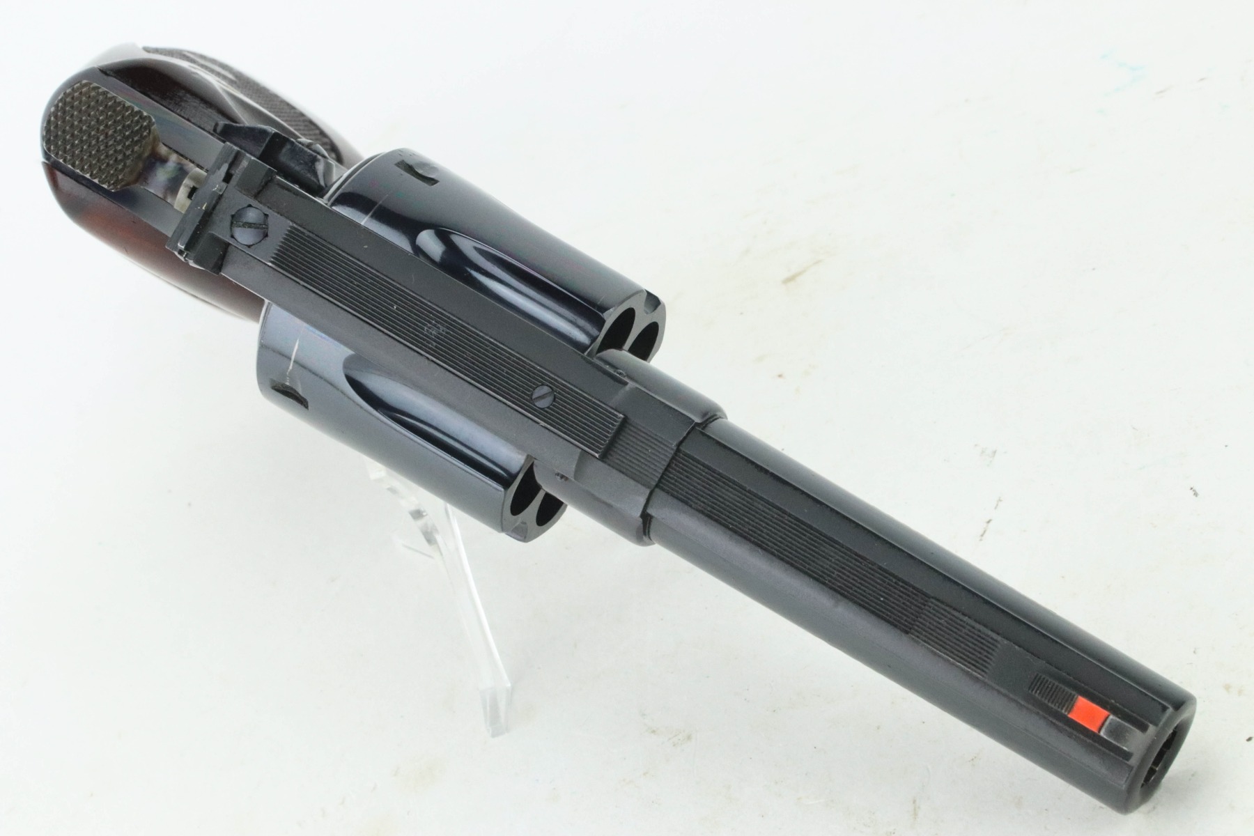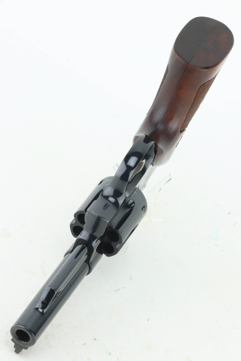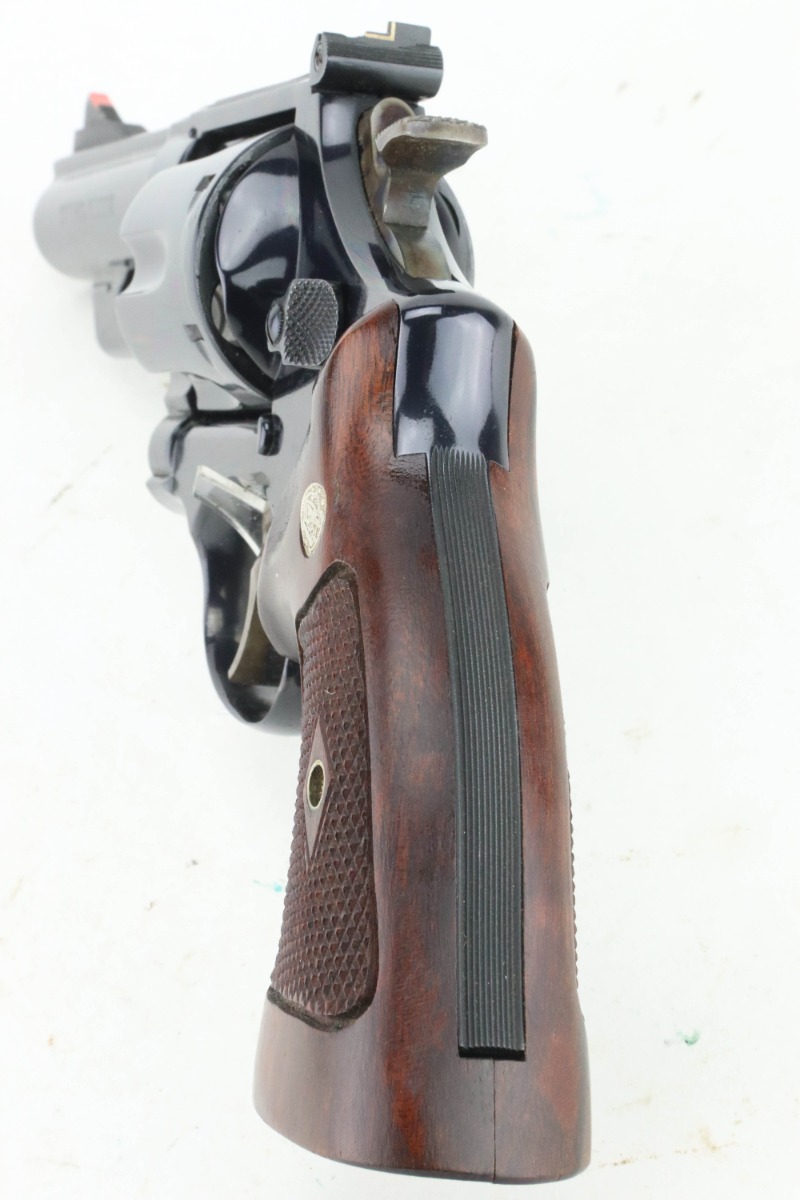 9/9/24 – This is a minty example of a very early Smith & Wesson Model 29-2 Revolver from early 1965. Chambered in .44 Magnum with a 4 inch barrel. All matching. It has retained nearly all of its original high polish bluing with just a roll mark on the cylinder. Case-hardening on the hammer and trigger. Fitted with very nice checkered wood grips – tiny repaired chip on the top right of the right panel. Near-mint bore.