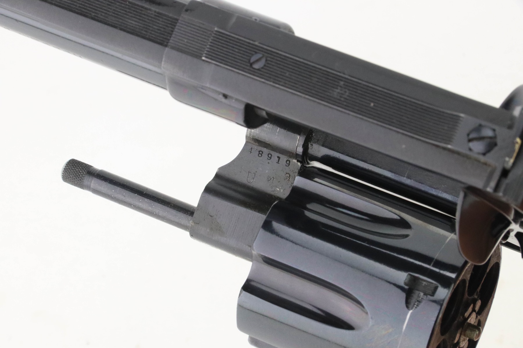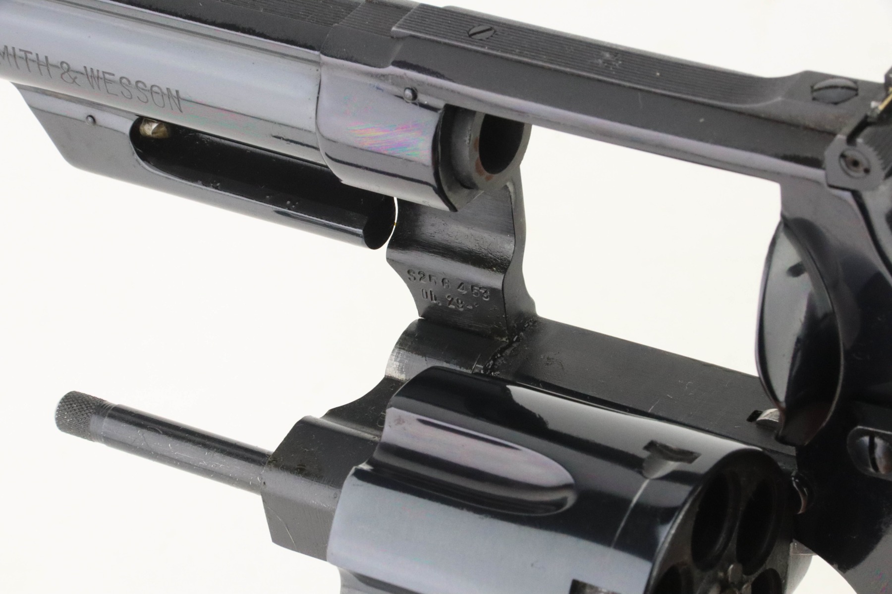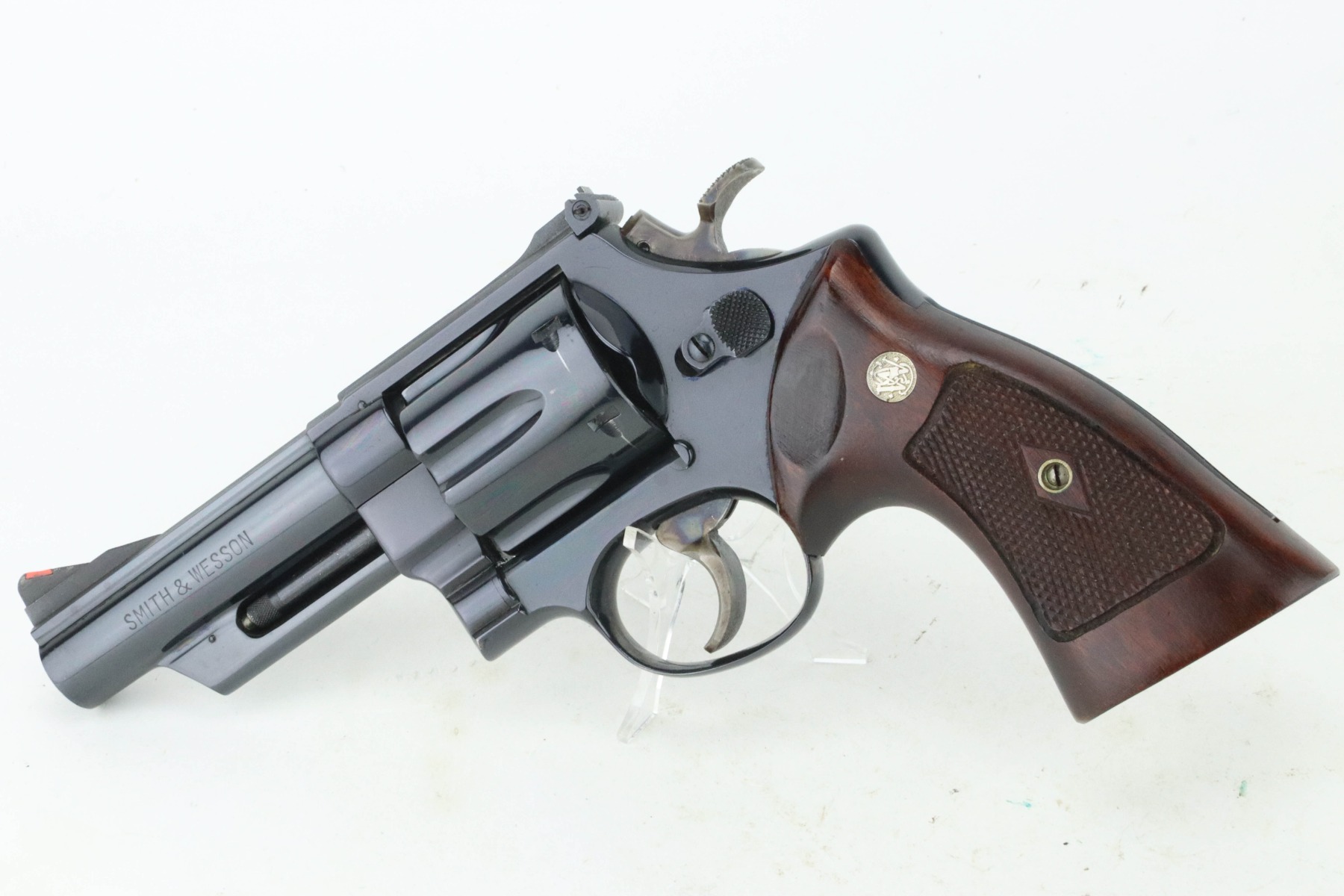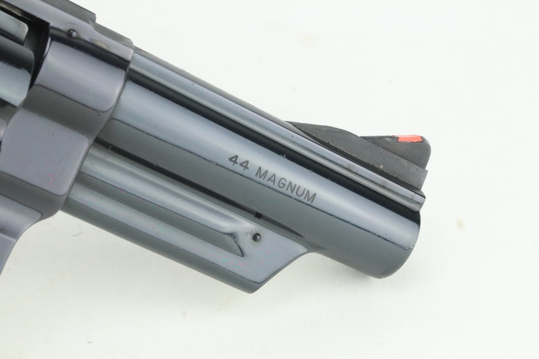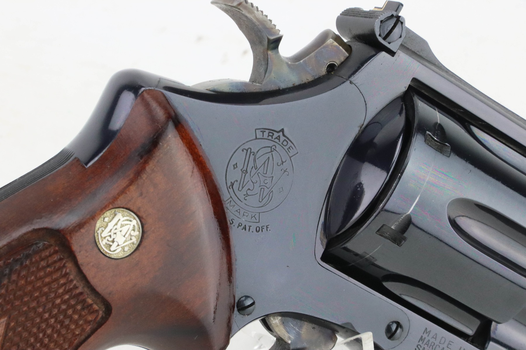 9/9/24 – This is a minty example of a very early Smith & Wesson Model 29-2 Revolver from early 1965. Chambered in .44 Magnum with a 4 inch barrel. All matching. It has retained nearly all of its original high polish bluing with just a roll mark on the cylinder. Case-hardening on the hammer and trigger. Fitted with very nice checkered wood grips – tiny repaired chip on the top right of the right panel. Near-mint bore.