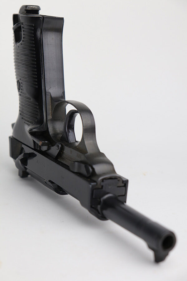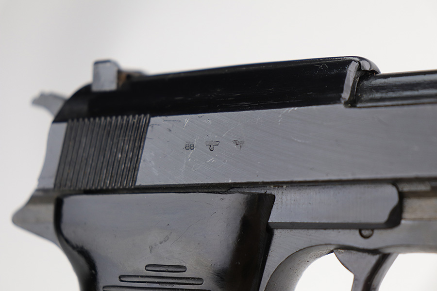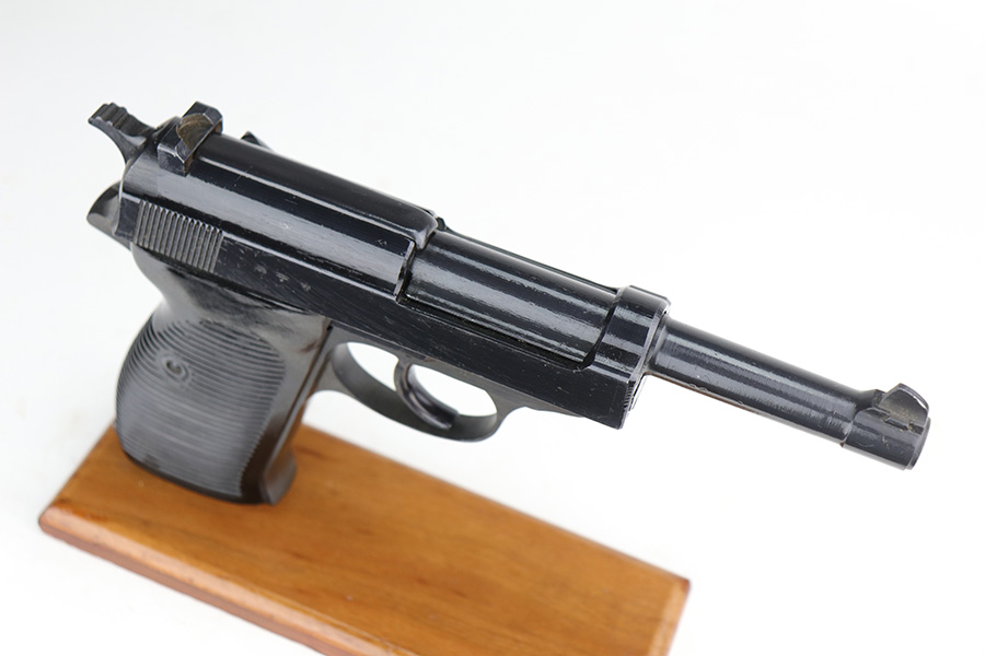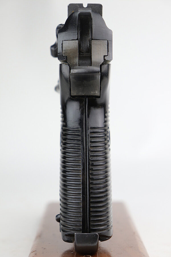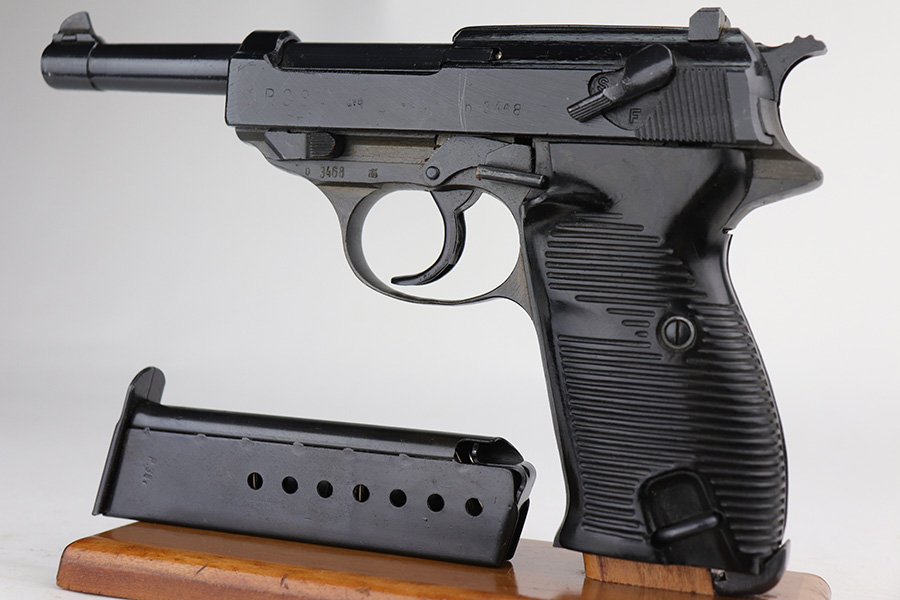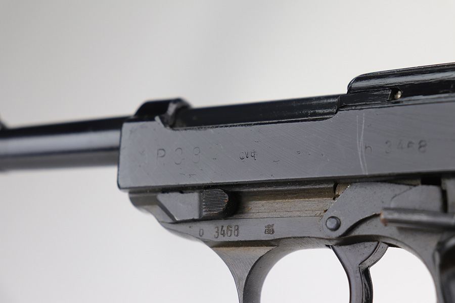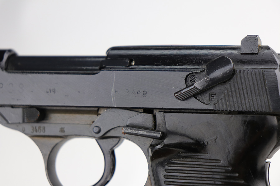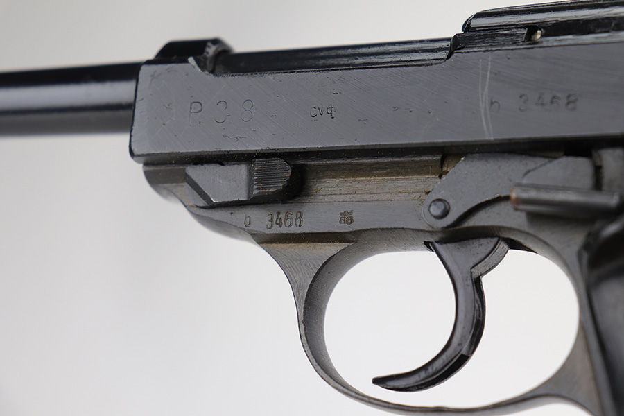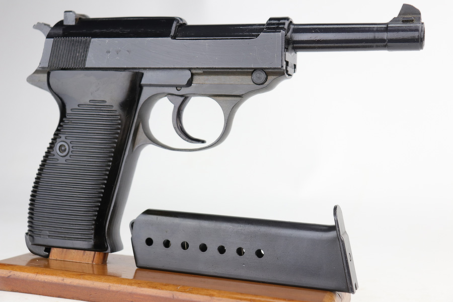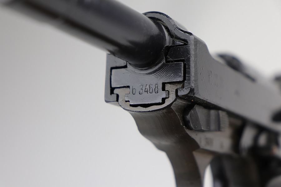 12/22/22 – This is a very nice example of a very late “b prefix” Spreewerk P.38 manufactured at the end of WW2, in April of 1945. It is all matching and has the proper “Eagle 88” military acceptance proofs. It has retained about 99% of its bluing, but nearly all of these very late examples went to Russia or East Germany after the war and were dipped at that time. There are some very light scratches on the slide, most noticeable on the right side. A few very small dings on the barrel. Comes with very nice grips that look like they’ve been cut down and a period-correct Walther magazine. The bore is mint. The de-cocker is functional.