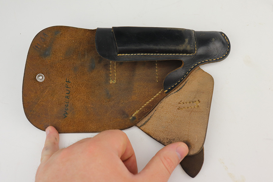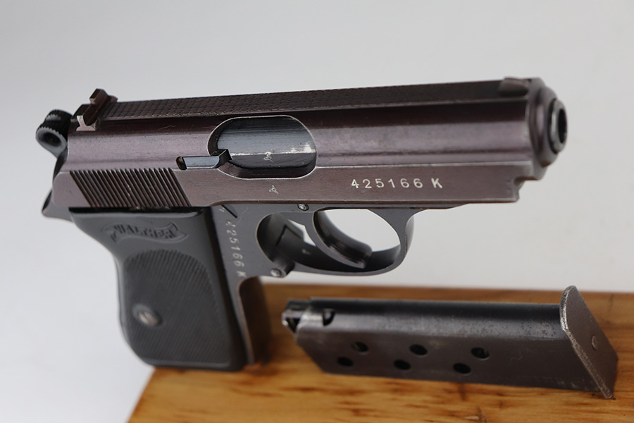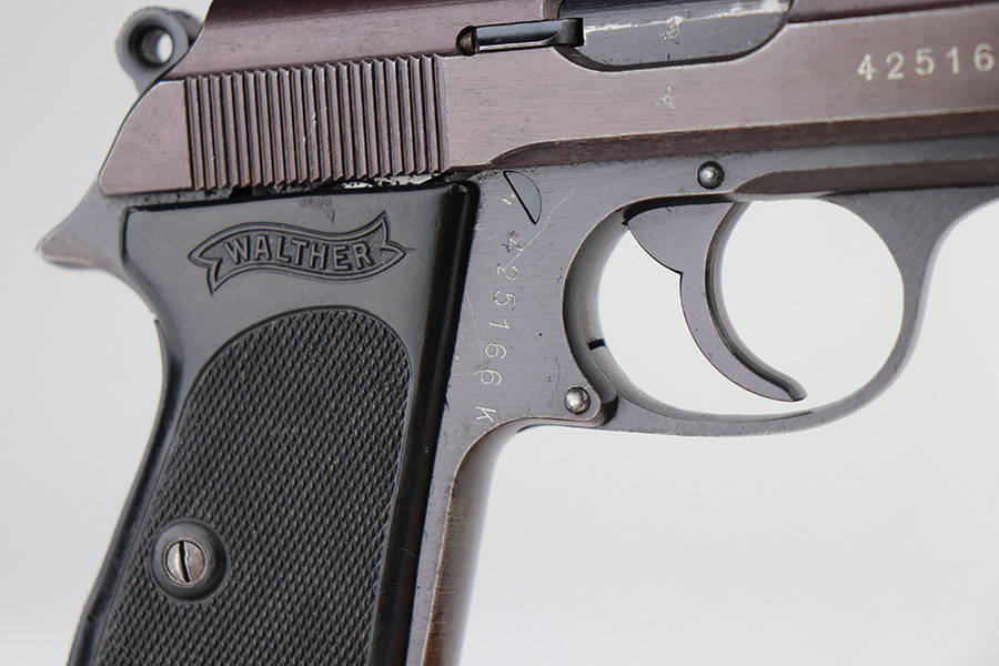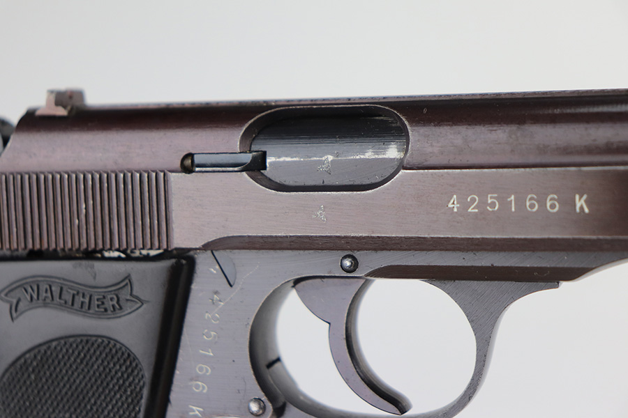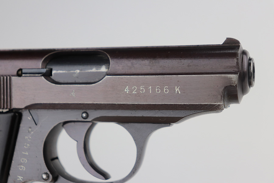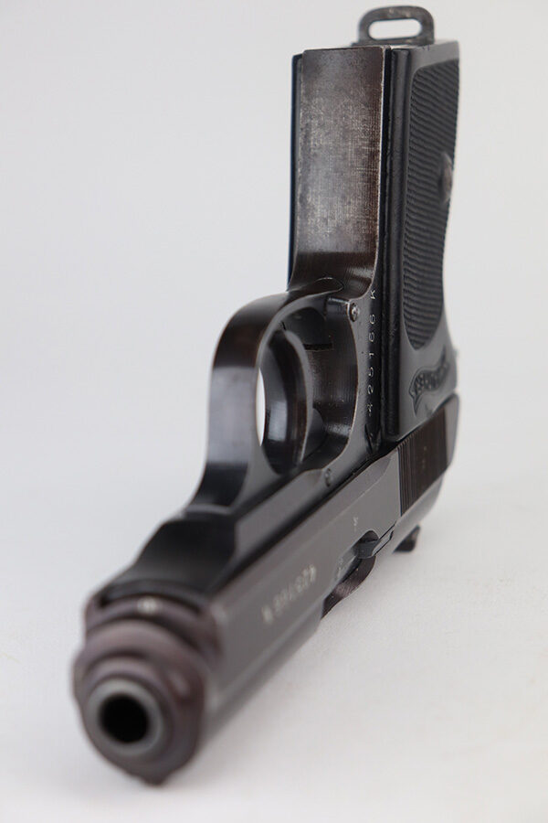 6/21/21 – This is a very nice example of a very late Walther PPK manufactured in 1944. The gun’s serial number is among known SS guns, so it is very possible that this gun was issued to the SS. There is no way for us to know for sure, though, without the original matching magazine. It comes with an excellent 1944-dated holster and two magazines. One of the magazines is numbered and doesn’t match the gun, but is in a know SS serial range. The is all matching and has the proper “Eagle N proofs”. The slide has a beautiful plumb color. It has retained about 93% of its original finish. There is very minor wear on the high edges of the slide and around the muzzle. Spotty wear on the front strap and left side of the slide. Spotty oxidation on the front strap. Comes with a nice late-war black grip – small crack in the spine. The bore is stone-mint.