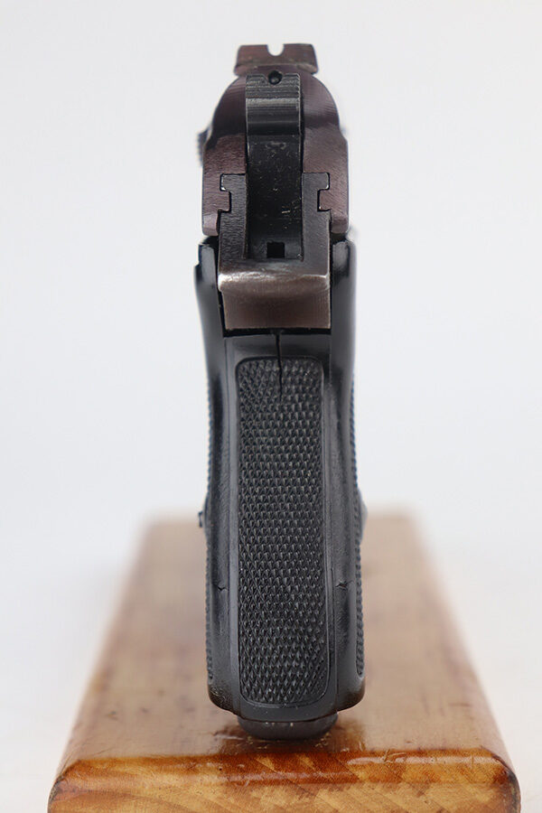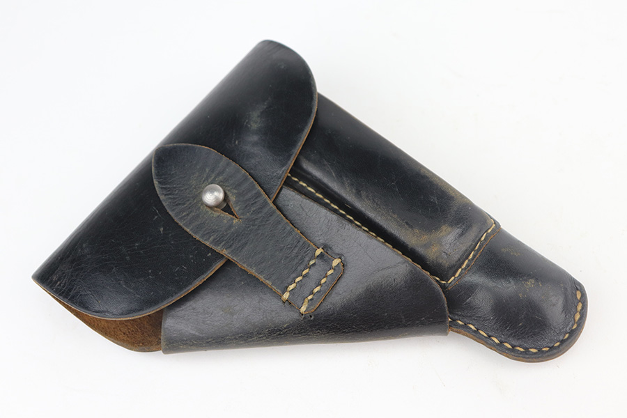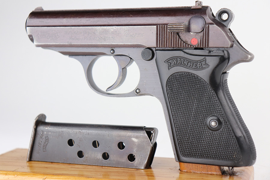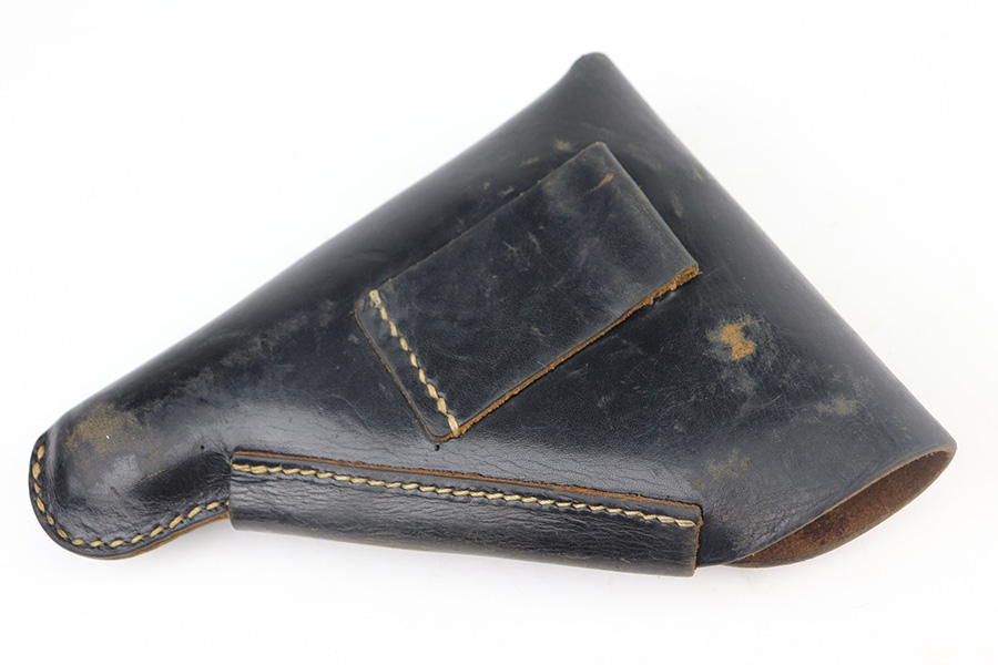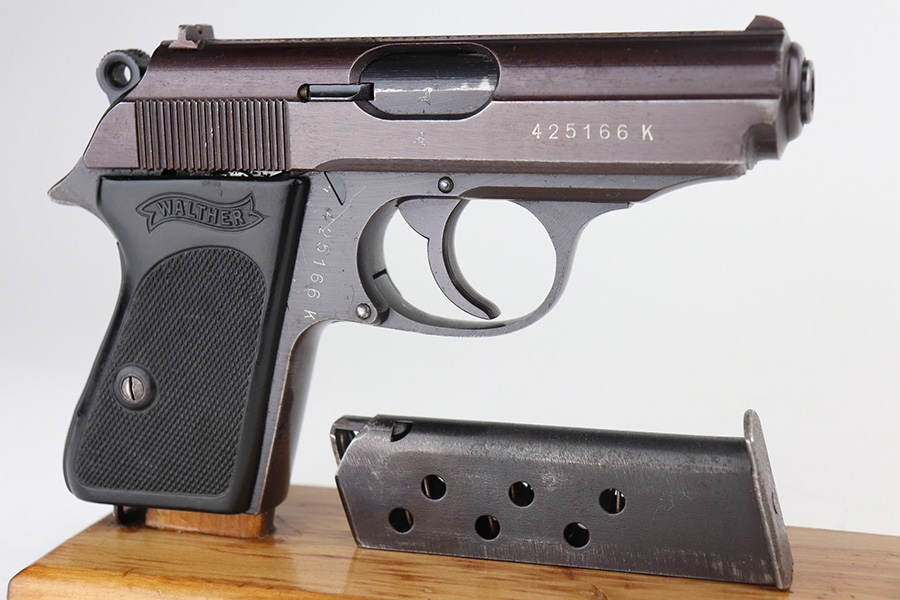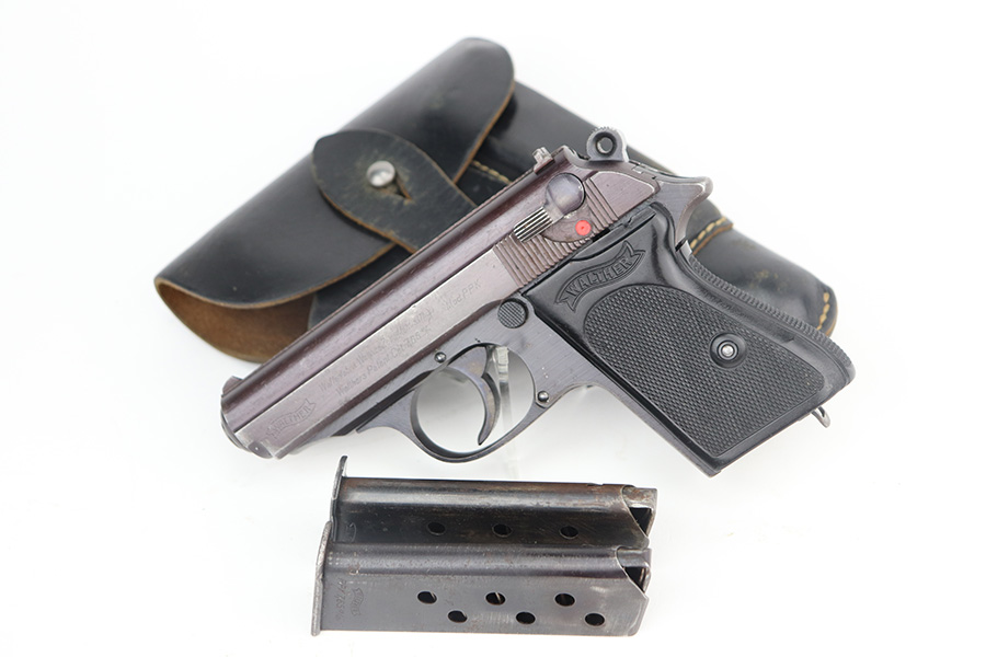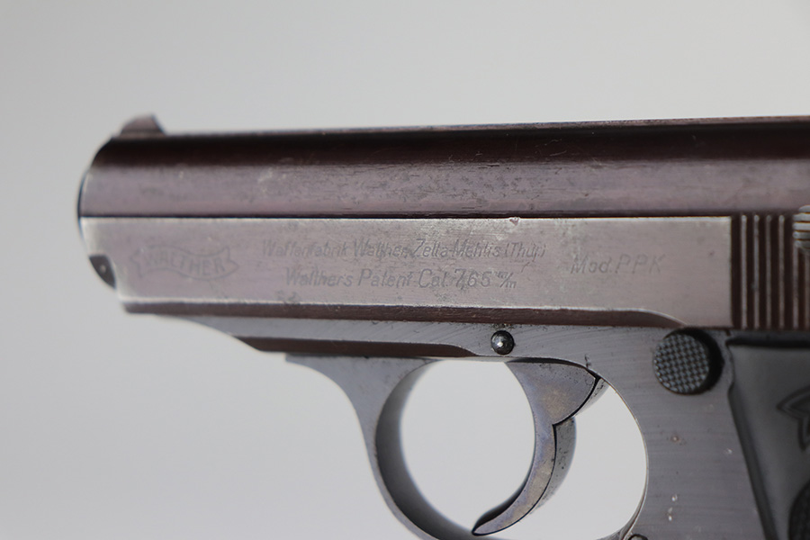 6/21/21 – This is a very nice example of a very late Walther PPK manufactured in 1944. The gun’s serial number is among known SS guns, so it is very possible that this gun was issued to the SS. There is no way for us to know for sure, though, without the original matching magazine. It comes with an excellent 1944-dated holster and two magazines. One of the magazines is numbered and doesn’t match the gun, but is in a know SS serial range. The is all matching and has the proper “Eagle N proofs”. The slide has a beautiful plumb color. It has retained about 93% of its original finish. There is very minor wear on the high edges of the slide and around the muzzle. Spotty wear on the front strap and left side of the slide. Spotty oxidation on the front strap. Comes with a nice late-war black grip – small crack in the spine. The bore is stone-mint.