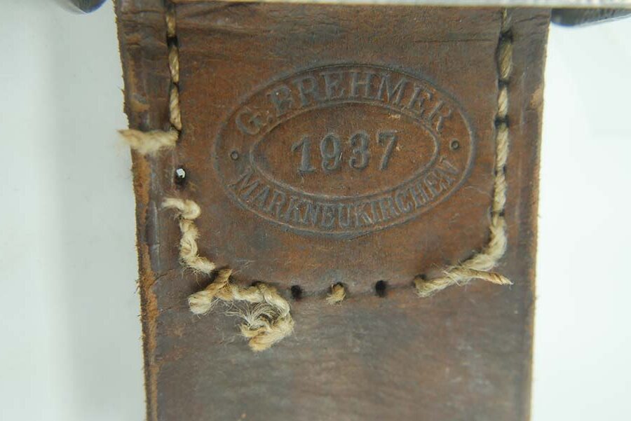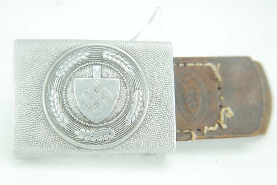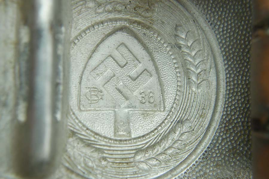 11/20/24 – This is a great example of an aluminum 1937 RAD Belt Buckle with Tab. The RAD or Reichsarbeitsdienst, was the Reich Labor Service in Nazi Germany. The RAD was a major paramilitary organization that was established to help mitigate the effects of unemployment that gripped Germany during the Great Depression. Young men served 6 months in the RAD prior to their military service. The RAD were an auxiliary to the Wehrmacht and operated in ways similar to the Engineers today, digging trenches, and building reinforcements. The RAD acted as reinforcement troops during Operation Market Garden, where RAD members saw combat being integrated into 9th SS Pionier Abteilung. This buckle is in great overall condition and has very little wear. The buckle is maker marked on the inside with the maker mark for G. Brehmer and the date stamp. This buckle also has its original tab, also maker marked by G. Brehmer. The leather is in good overall condition and is still pliable. The tab’s stitching is tearing, but is still present.
