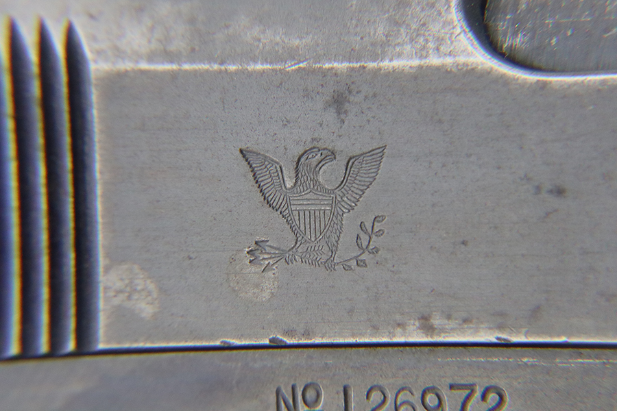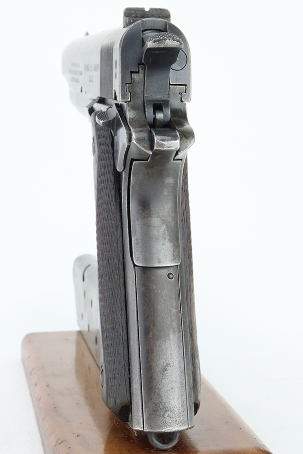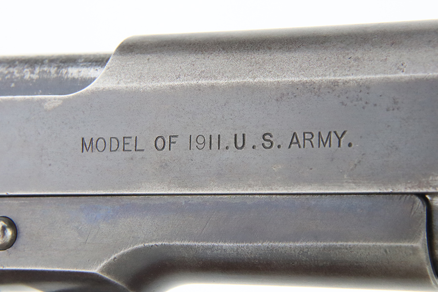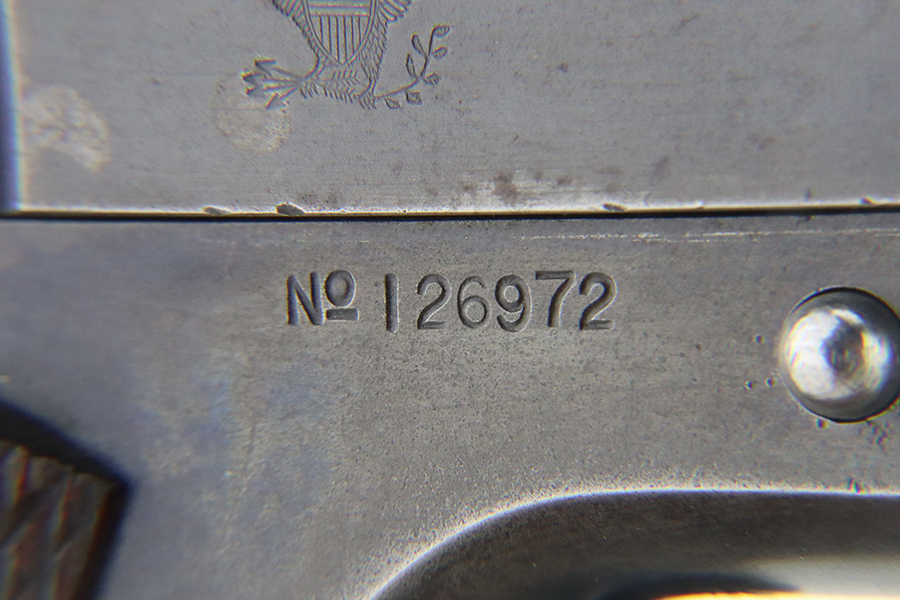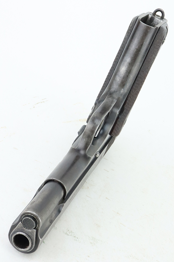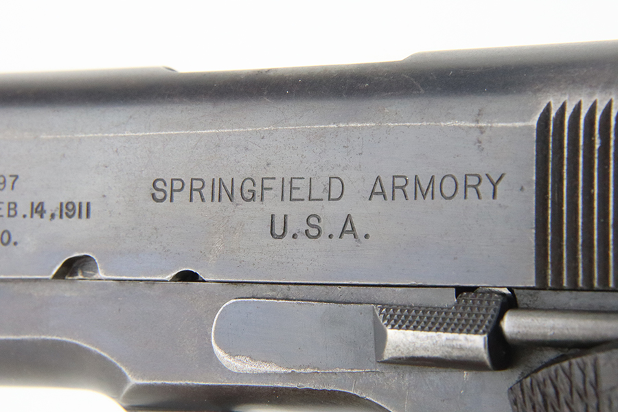 05/29/2024 – For sale is an excellent example of an M1911 pistol produced by Springfield Armory in 1917. This handgun is in an overall 95% condition and retains a lot of its original, but worn, blued finish. There is plenty of wear around the muzzle and slide from holster use. The left side of the frame and slide is stamped with the flaming bomb ordnance stamp. The slide is stamped “Springfield Armory USA” and patent numbers on the left side and “Model of 1911, US ARMY” on the right side with an American Eagle. The barrel is stamped “S” and “P” for Springfield. The bore is very bright with good rifling. The firing pin stop plate has a very small crack. The handgun comes with one wartime magazine with lanyard loop. Additional photos of all Springfield “S” proofs are in the gallery.