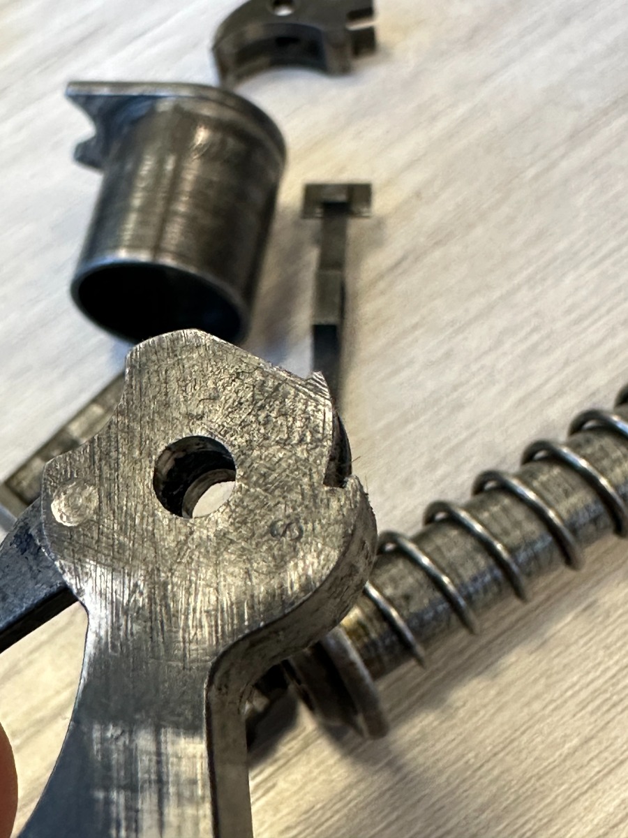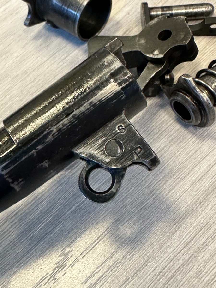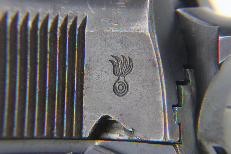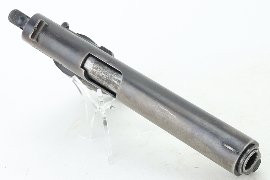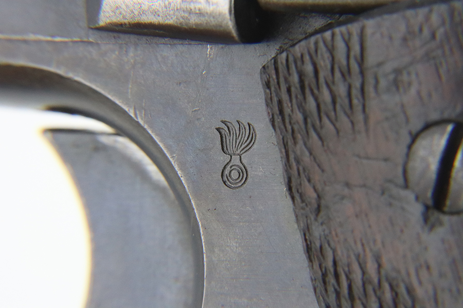 05/29/2024 – For sale is an excellent example of an M1911 pistol produced by Springfield Armory in 1917. This handgun is in an overall 95% condition and retains a lot of its original, but worn, blued finish. There is plenty of wear around the muzzle and slide from holster use. The left side of the frame and slide is stamped with the flaming bomb ordnance stamp. The slide is stamped “Springfield Armory USA” and patent numbers on the left side and “Model of 1911, US ARMY” on the right side with an American Eagle. The barrel is stamped “S” and “P” for Springfield. The bore is very bright with good rifling. The firing pin stop plate has a very small crack. The handgun comes with one wartime magazine with lanyard loop. Additional photos of all Springfield “S” proofs are in the gallery.