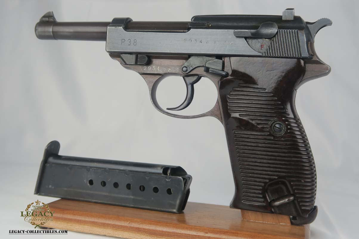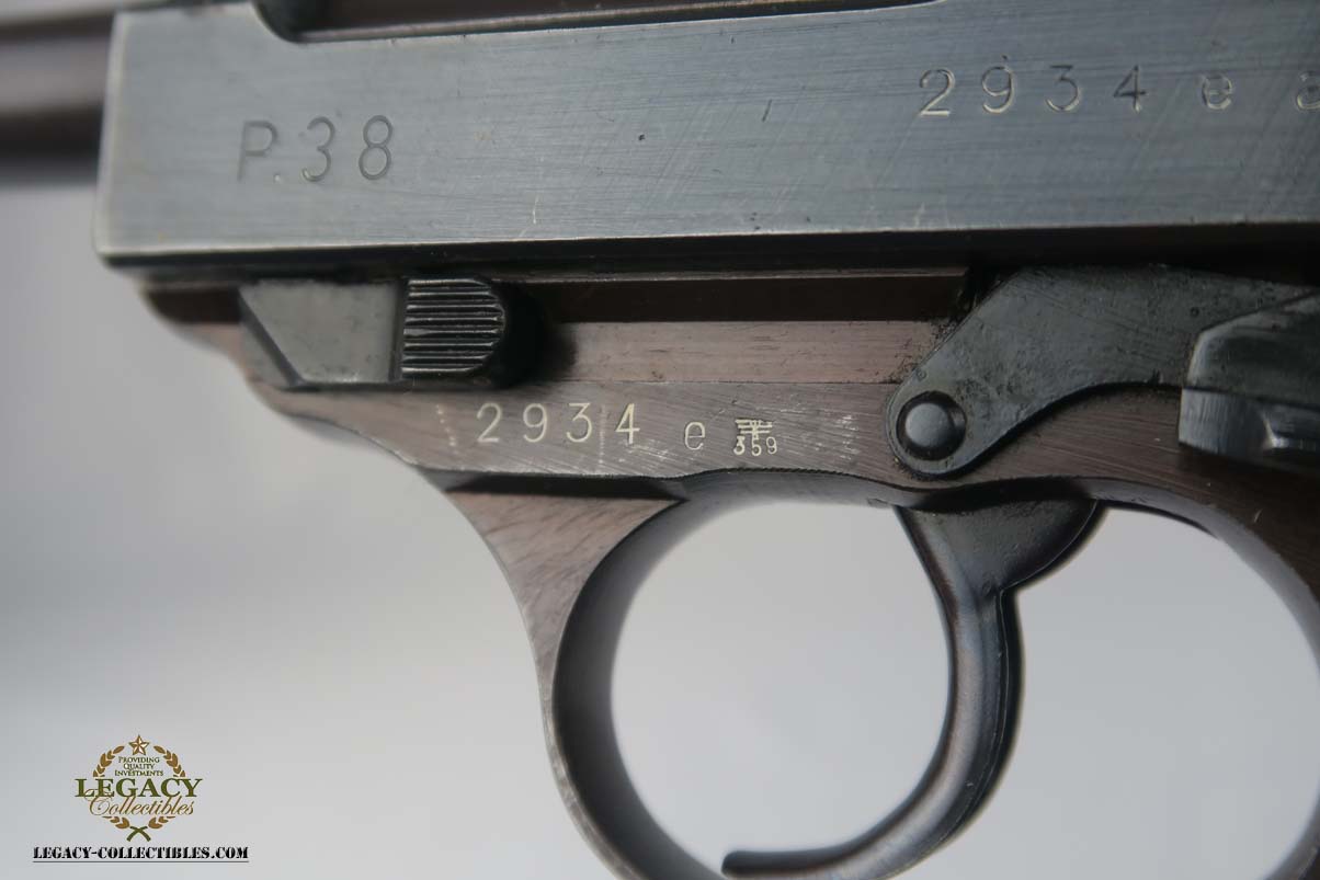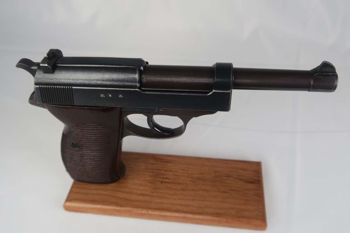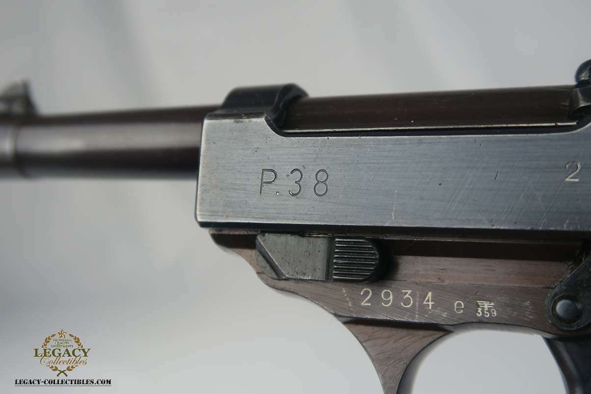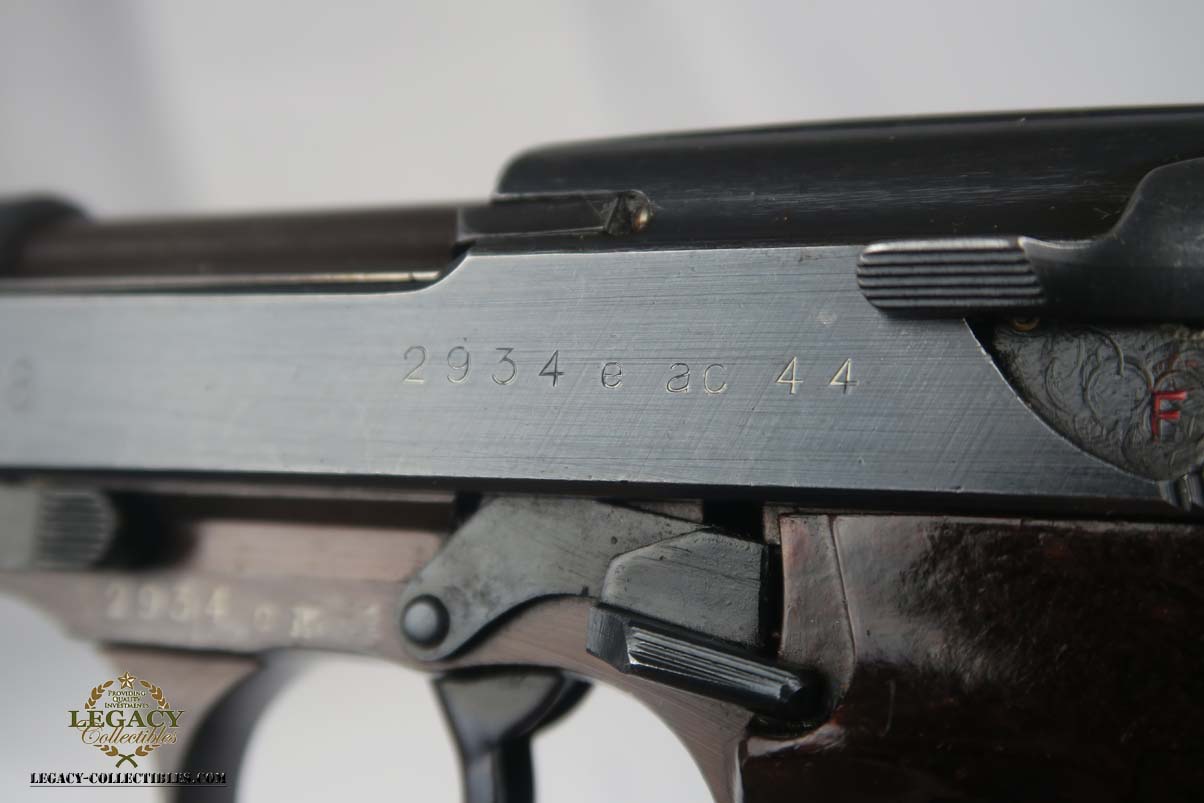 3/7/17 – This is a 1944 produced Walther P.38, in about 98% original condition.  The slide finish is excellent but rough, with only minor edge wear.  The frame shows a bit of a plum color and nice contrast to the slide, though the front strap shows similar rough machining to the slide that is a thinner color.  Excellent brown grips.  Bore is near mint.