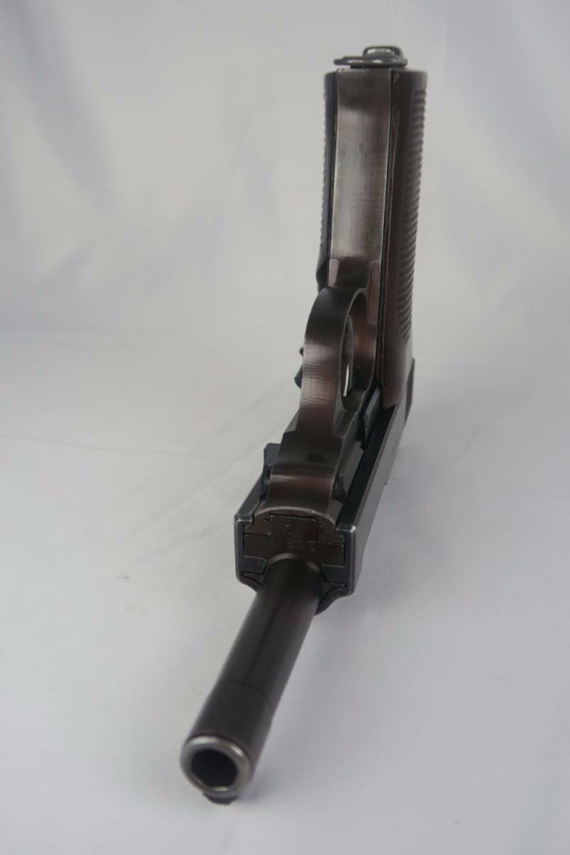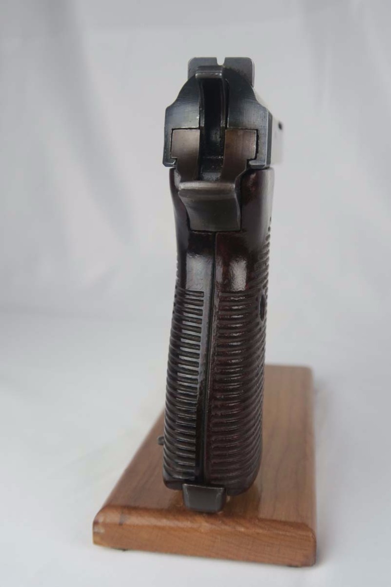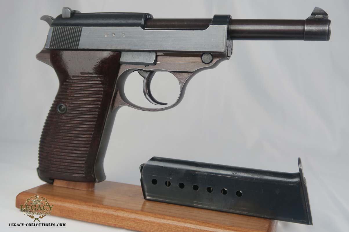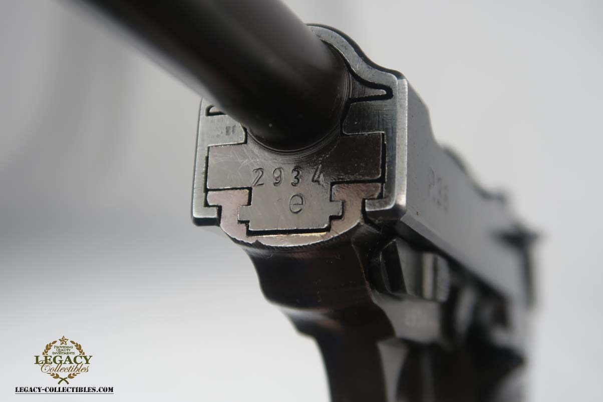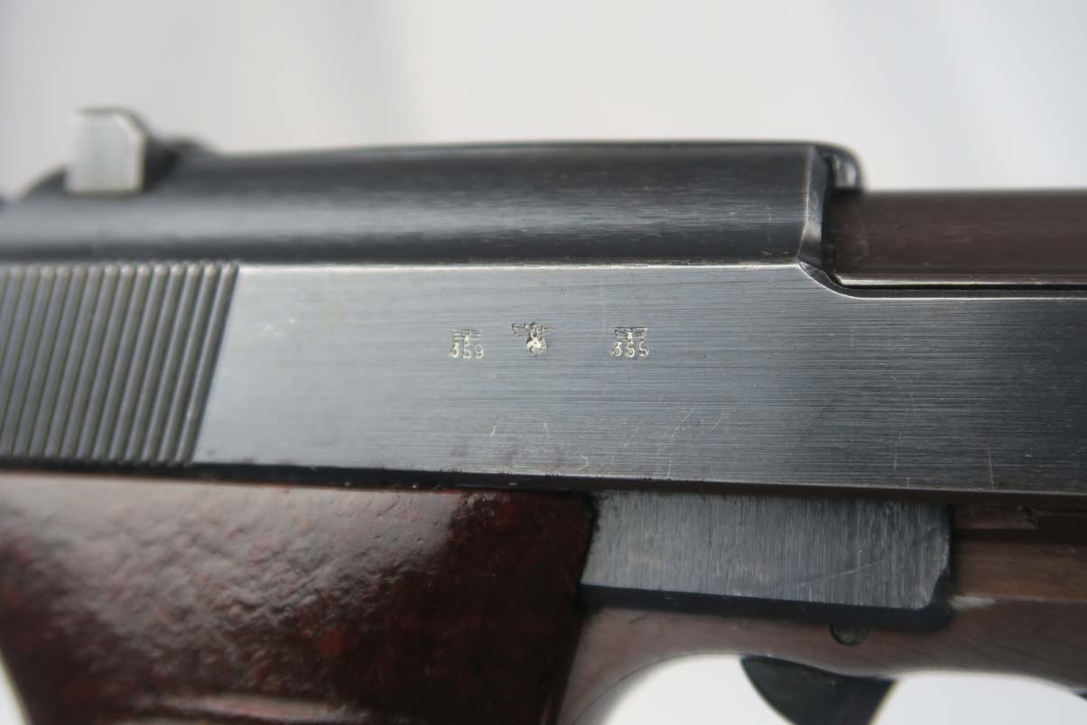 3/7/17 – This is a 1944 produced Walther P.38, in about 98% original condition.  The slide finish is excellent but rough, with only minor edge wear.  The frame shows a bit of a plum color and nice contrast to the slide, though the front strap shows similar rough machining to the slide that is a thinner color.  Excellent brown grips.  Bore is near mint.