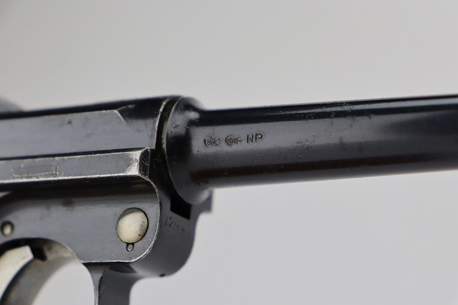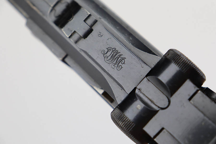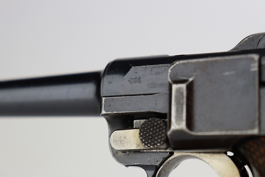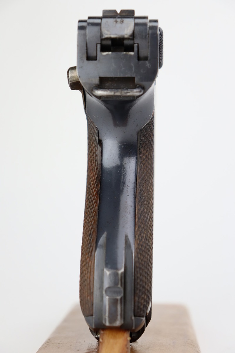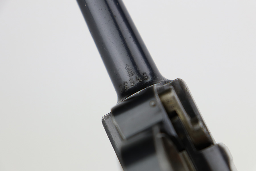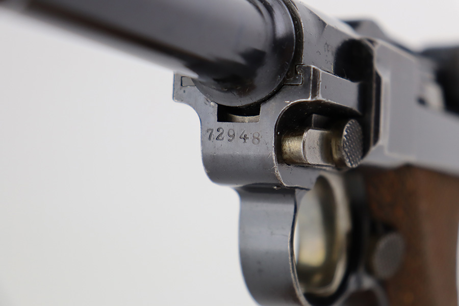 8/1/23 – This is a very nice example of a super rare 1914 Commercial DWM Luger. There were only 2,000 produced, all within serial range 71,500-73,500. All were chambered in 9mm Luger. It is all matching and has the proper “Crown N” proofs. There are also British export proofs throughout. It has retained about 93-94% of its original finish. Minor wear around the muzzle, on the side plate, and on the side rails. Some tiny scratches here and there. Light freckling on both grip straps and some light scratchy wear on the front strap. Fitted with very nice wood grips – numbered but mismatched. Comes with an un-marked magazine. The bore has good rifling, but there is minor pin-pricking throughout.