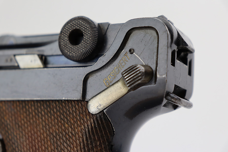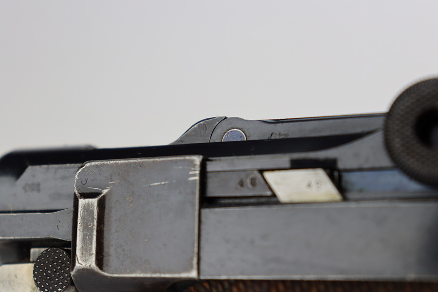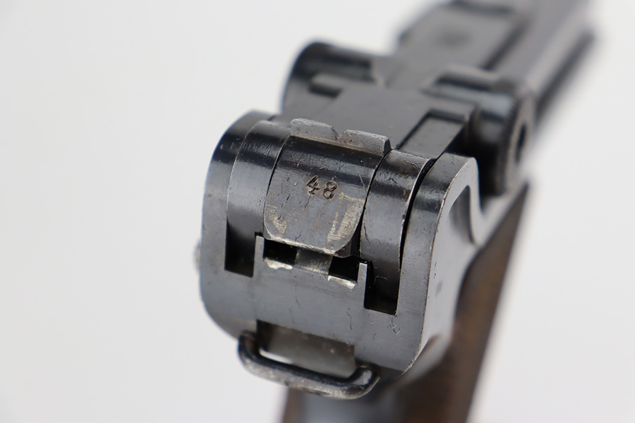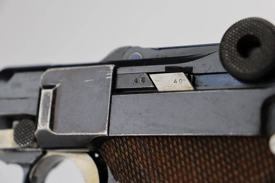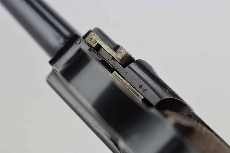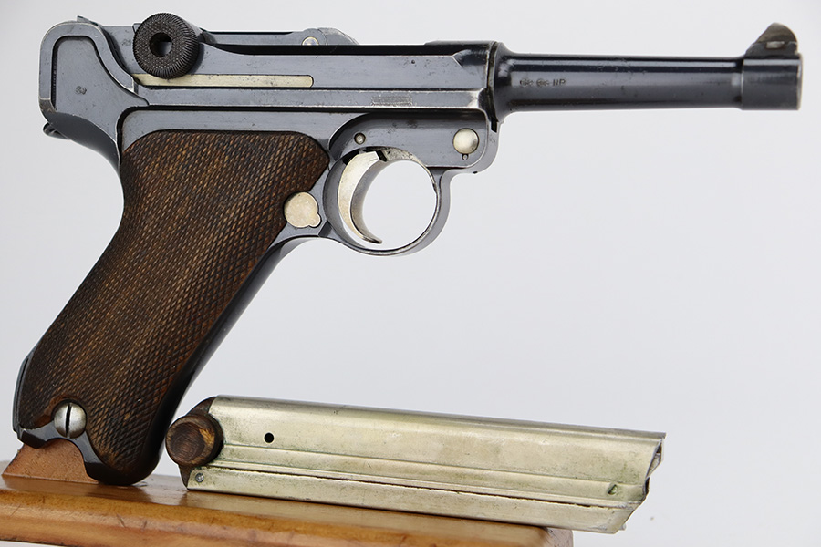 8/1/23 – This is a very nice example of a super rare 1914 Commercial DWM Luger. There were only 2,000 produced, all within serial range 71,500-73,500. All were chambered in 9mm Luger. It is all matching and has the proper “Crown N” proofs. There are also British export proofs throughout. It has retained about 93-94% of its original finish. Minor wear around the muzzle, on the side plate, and on the side rails. Some tiny scratches here and there. Light freckling on both grip straps and some light scratchy wear on the front strap. Fitted with very nice wood grips – numbered but mismatched. Comes with an un-marked magazine. The bore has good rifling, but there is minor pin-pricking throughout.