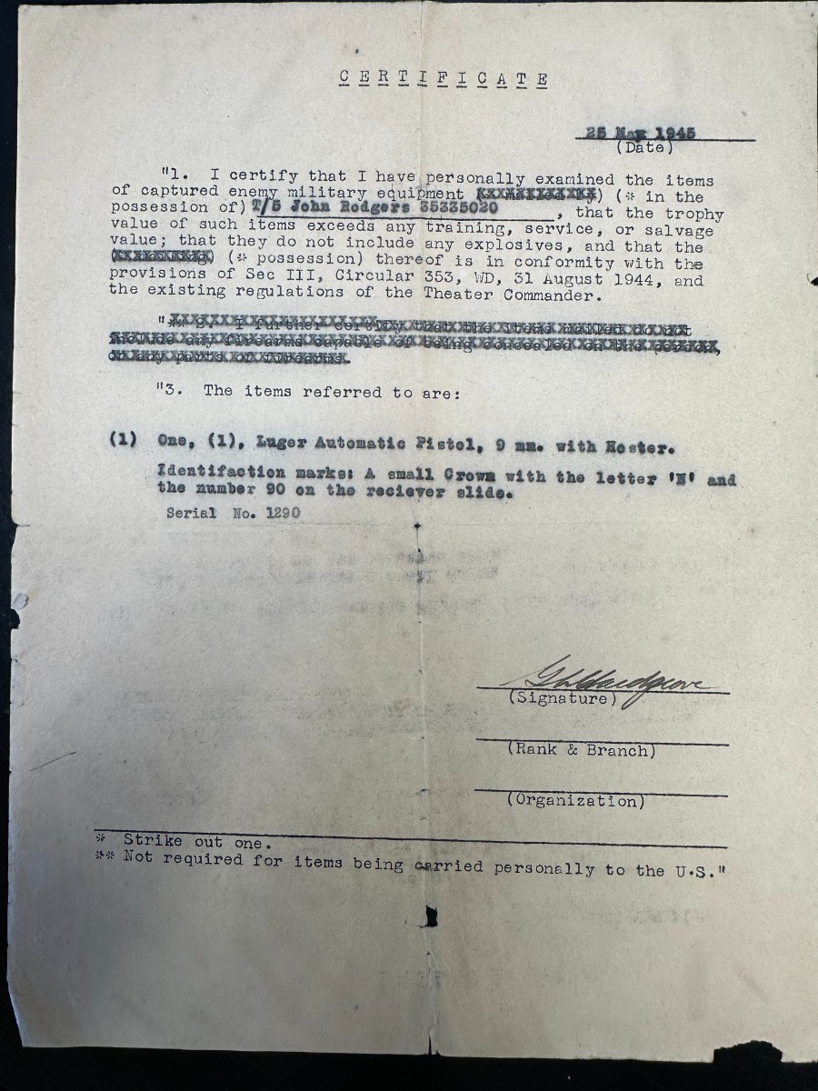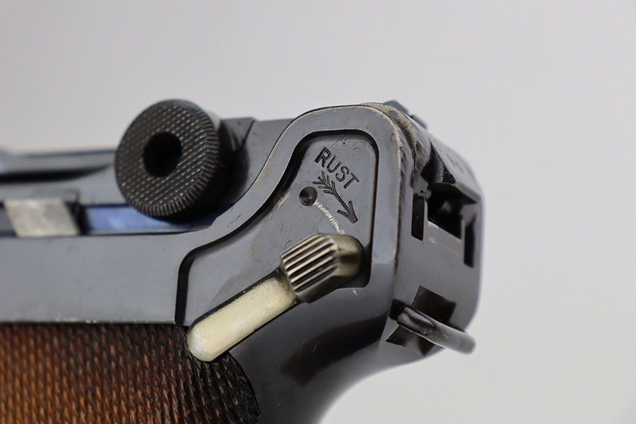 8/9/23 – This is a very rare 1928 Dutch Navy DWM Luger with WW2-era capture certificate. There were fewer than 1,500 of this variation produced, with 4in barrel, Crown/N proofs, RUST marking in safety area and all in the range from 1-1484. This particular example is also in fantastic condition with 96-97% of the blue remaining. Only minor high point wear on the sideplate, muzzle, stock lug and receiver ears. Excellent bore and grips, which are unmarked. Excellent magazine with unmarked wooden base. The listing includes an original customs declaration certificate, stating the pistol was being brought back by T/5 John Rodgers in May of 1945. It is serialized to the pistol.