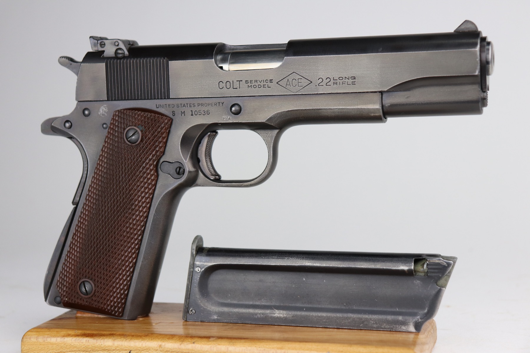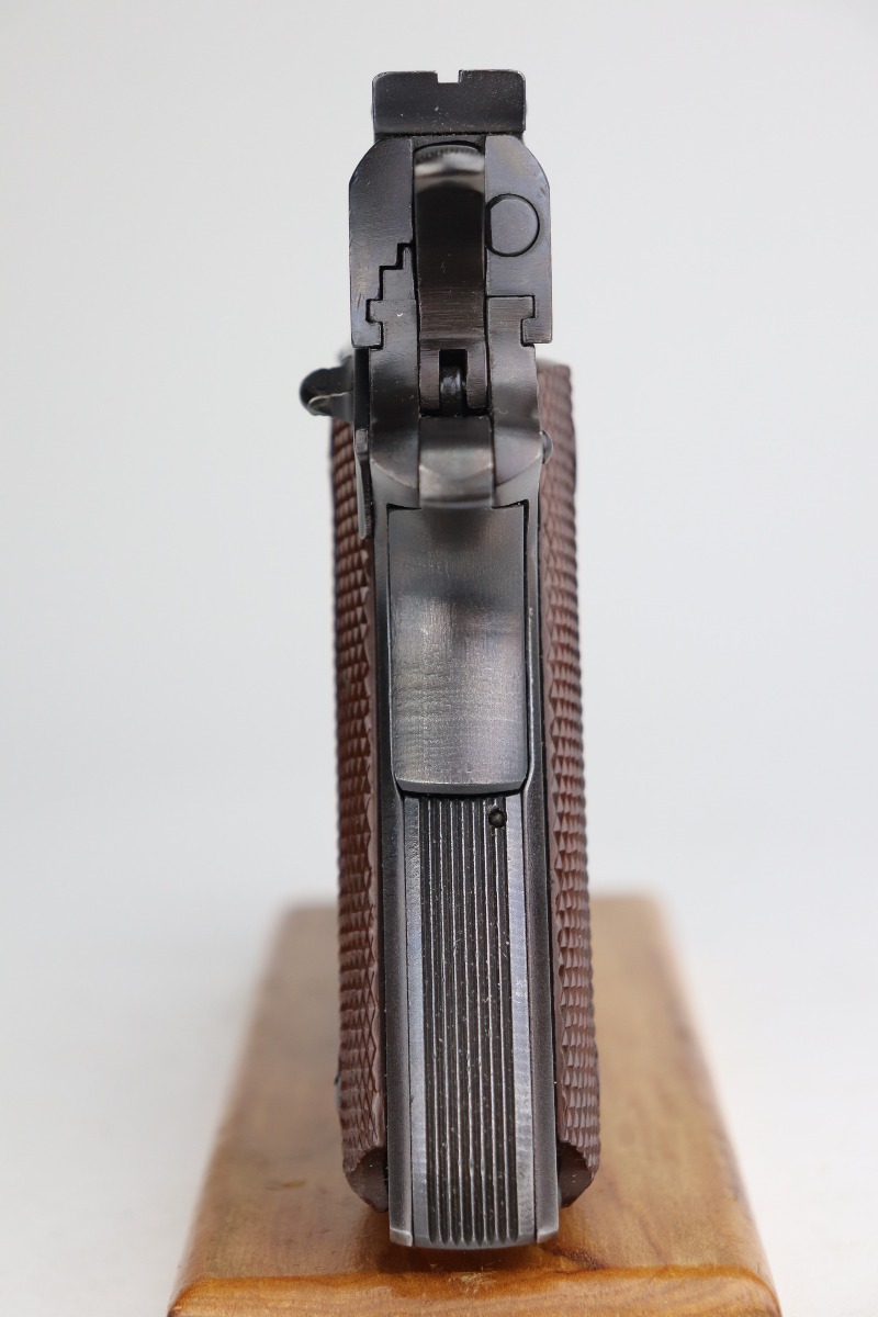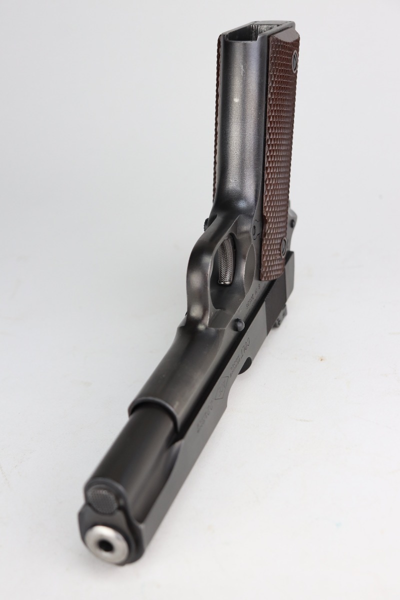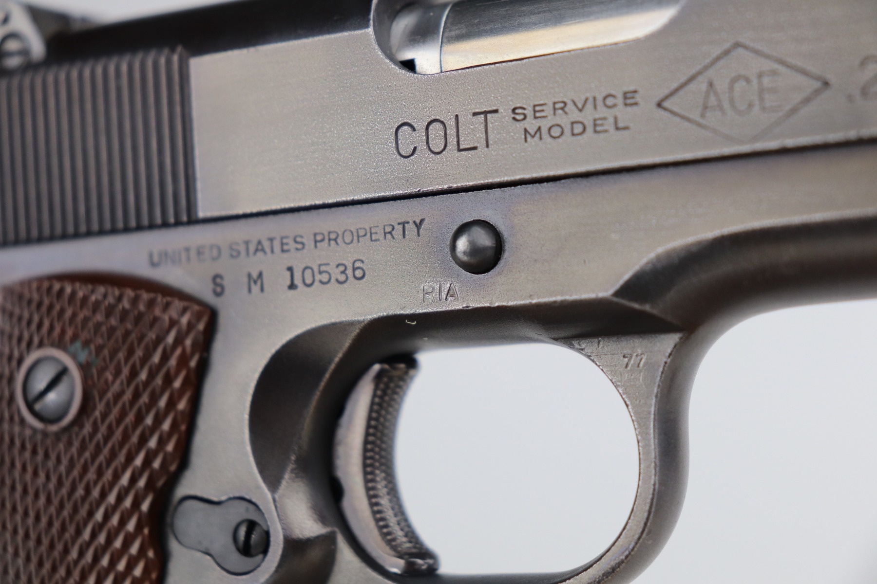 2/28/23 – This is an excellent example of a Colt Ace 1911A1 issued to the US military in August of 1945. This particular gun was part of one of the last deliveries of these guns. About 1,500 were delivered. It has a rare “JSB” inspector proof. It stands for John S. Begley, the final WW2 inspector. This gun also has a “RIA” arsenal rework stamp. It was refinished at the arsenal. It has retained 97-98% of this new finish. There is minor thinning on the front strap and a hint of wear around some of the high edges. Comes with excellent grips and a correct Colt Ace magazine. The bore is mint.