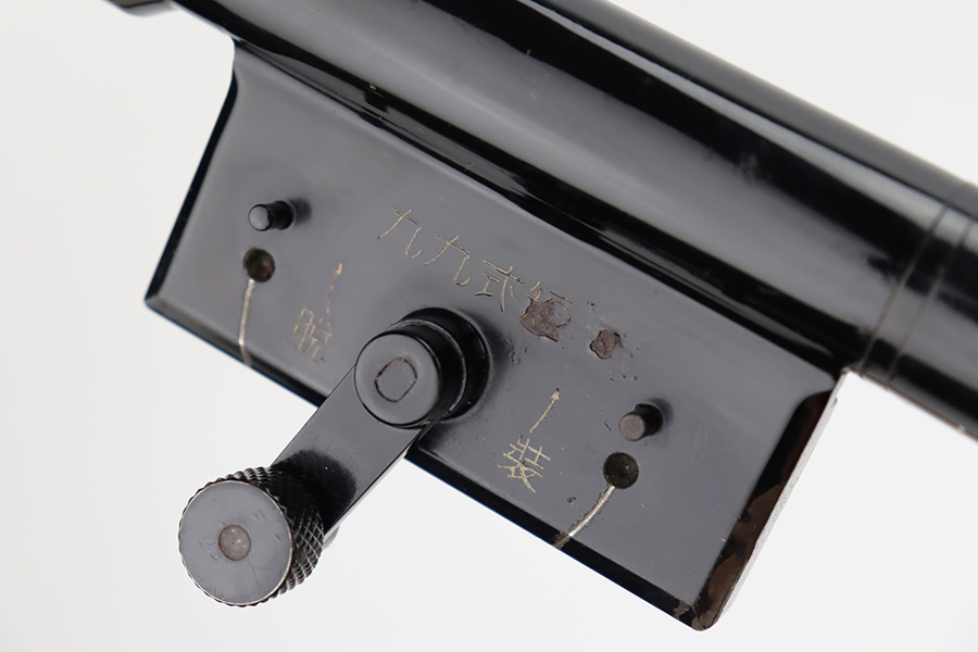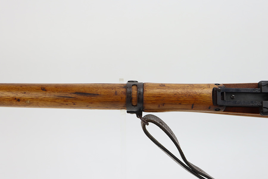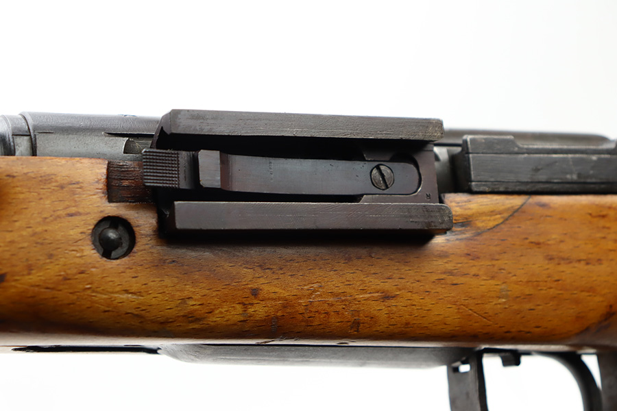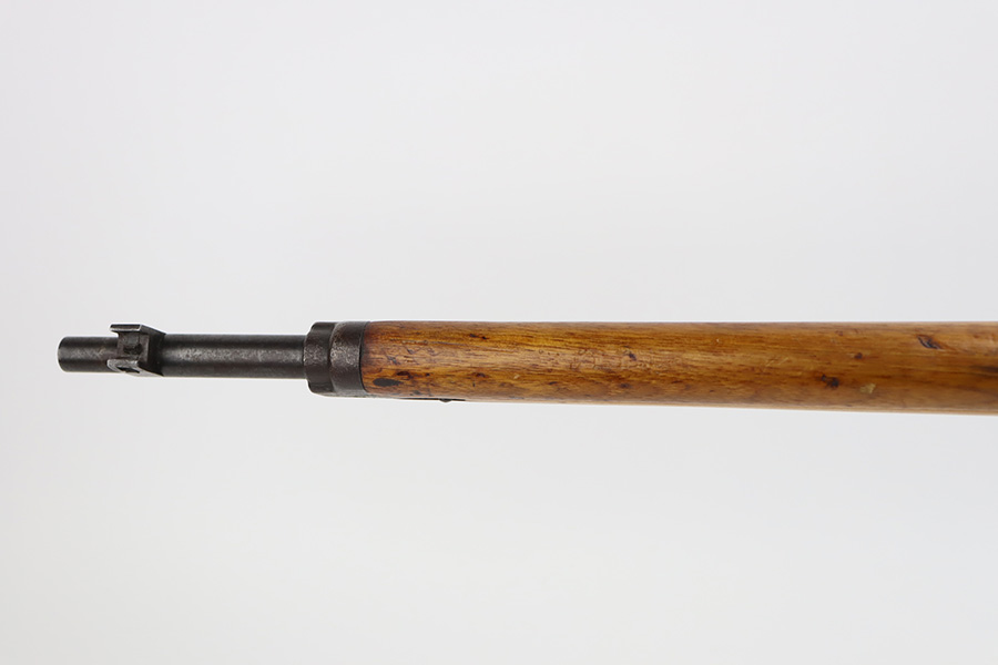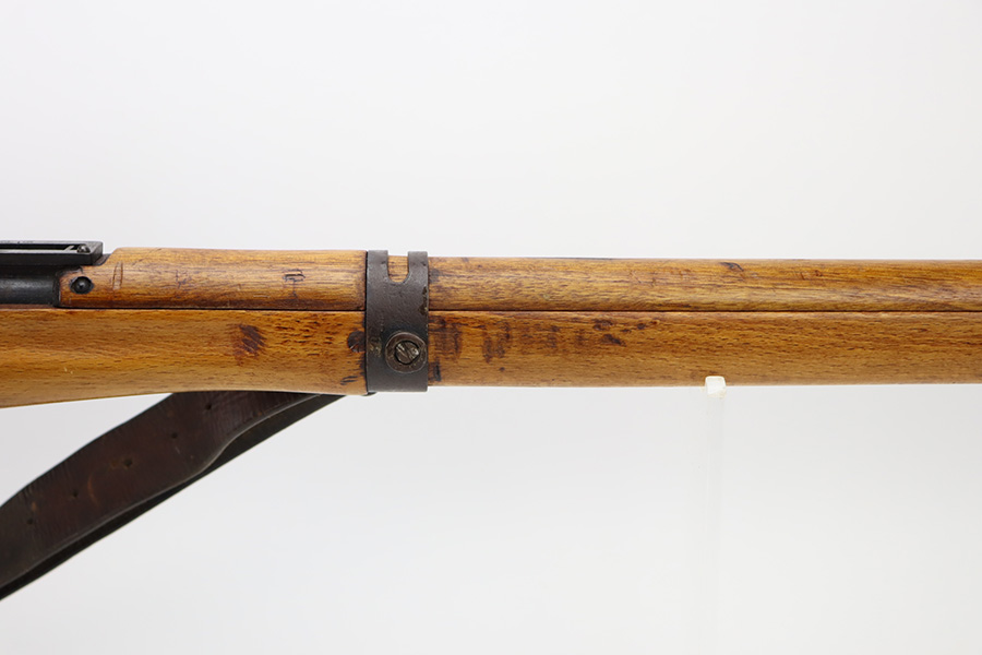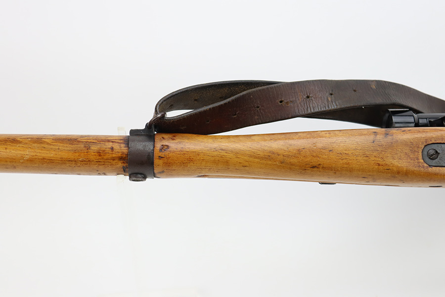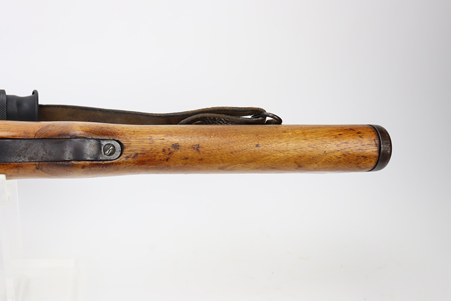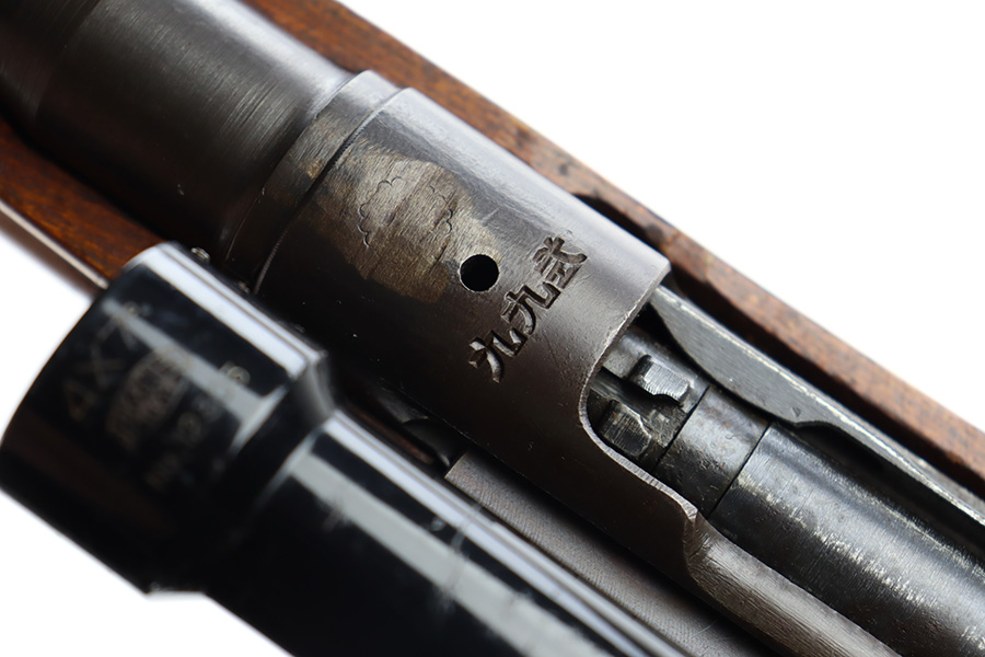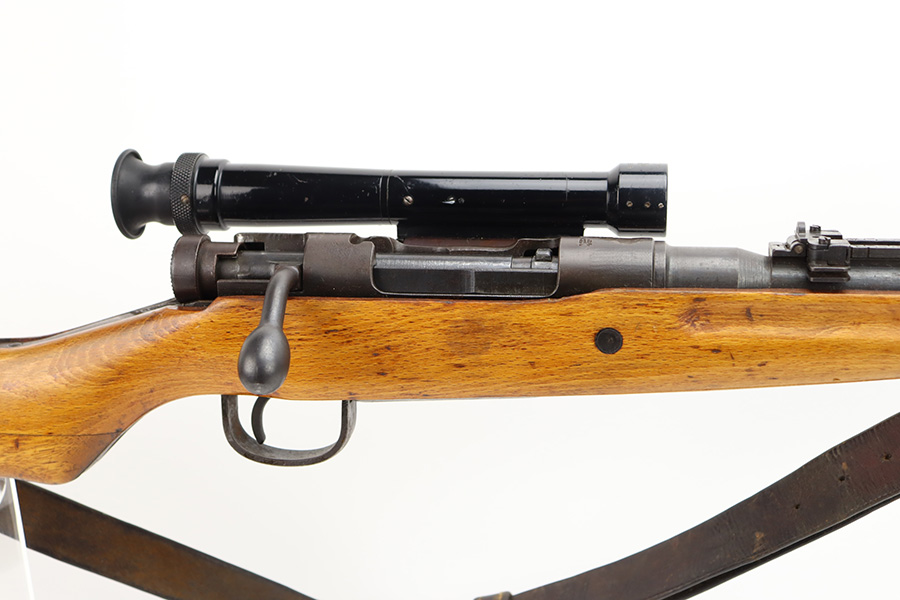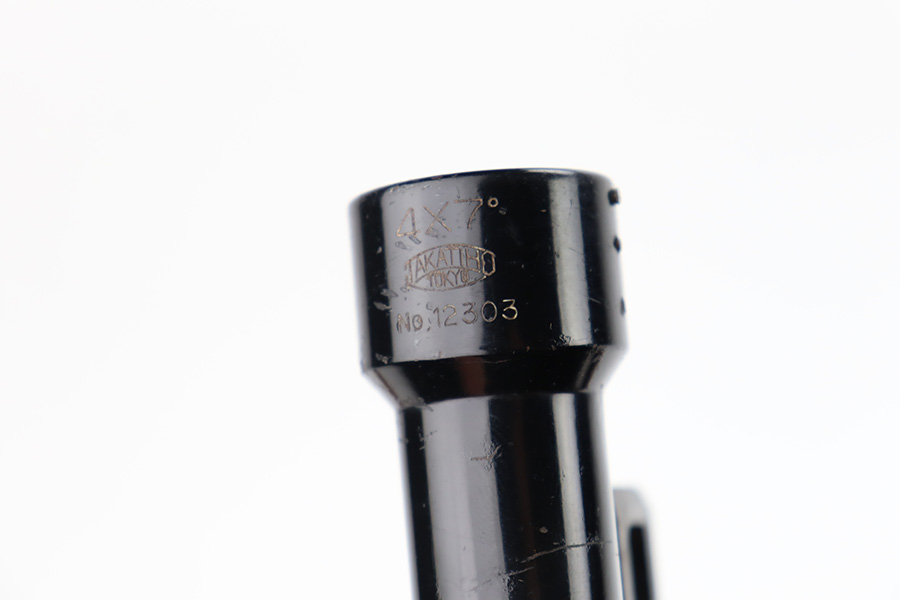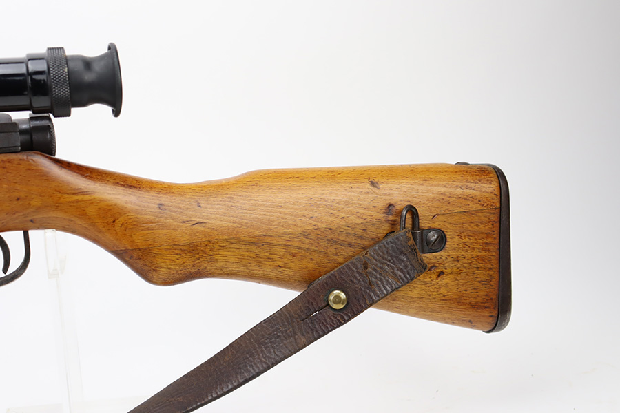 12/1/23 – This is a very rare and desirable Arisaka Type 99 sniper rifle made at the Nagoya factory during World War 2. All numbered parts on the rifle match, including the full bolt assembly, and it has an early two-digit serial number. The bluing is original throughout but the mum has been ground, and there is some patina throughout. Excellent bore. The rifle is fitted with a scope marked ‘Takahito 4×7’ along the top, with serial number ‘12303’ on it. The optics are fairly clear but there are flecks of dirt in the field of view here or there. Excellent wood stock but has been lightly sanded at some point. Comes with a cleaning rod, and also a period leather sling.