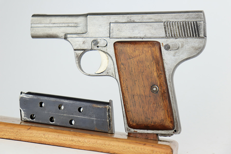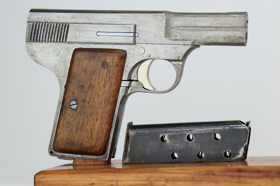 The Leige, Belgian produced Armand Gavage was produced from May, 1940 – September, 1944 with both Belgian and German test proofs (no Waffenampts). The serial number range was from 19 – 4612, so less than 4600 were ever manufactured. Two types of grips were used – pressed horn (appears black) and wood as are on this pistol. Jan Still’s Luger Forum has a database showing this serial number (3188) right in the middle of Nazi occupied produced AGs Armand Gavage 7.65mm pistol survey? | Jan C. Still Lugerforums Post #55) In addition, of the reported 81 AGs, this pistol falls into a very small group of 9% that have no markings and only 4 are “in the white” – SN: 1524,3697,3188,3896,&4414. When you put this together based on those listed in the latest 7/8/22 database and extrapolate this out to a total of 4600 pistols, you won’t find but maybe 20 other AGs “in the white” without any Belgium or Nazi test proofs. Colonel Whittington’s Book, Volume 2 rates this Armand Gavage on a rarity scale of 1 to 5 as a “5” indicating the rarest WW2 pistol to be used by the Nazis. To be manufactured under Nazi occupation and used by the BelgianFrench resistance forces with a population of maybe 20 with only 4 others actually known, this pistol is a unicorn. It doesn’t take much speculation that this gun was taken off the assembly line and smuggled out of the AG plant after production but before it was finished, blued and Nazi test proofed. The magazine is blued and not the correct nickel plated type further indicating that it was smuggled out of the factory before getting the correct magazine at the end of production. The mag has 6 witness holes as the original nickel mag and enters and exits the mag well without any issues. This pistol was reported to the AG database on 10/21/16 on post 36 on the link below. Posts 37-39 indicate it could well have been a resistance gun by Anthony Vanderlinden on the following link as were some of the other similar documented Belgian wartime “in the white” pistols (FN 1922s, Hi Powers, etc.) https://www.lugerforums.com/threads/armand-gavage-7-65mm-pistol-survey.38243/page-2 which seems reasonable. Who knows, it may have shot a few Nazis in its days! This exact field stripped pistol is shown in this link along with the previous owner’s comments: Armand Gavage | Jan C. Still Lugerforums This is a well-documented very rare pistol used by the resistance forces against the Nazis with their own weapon.