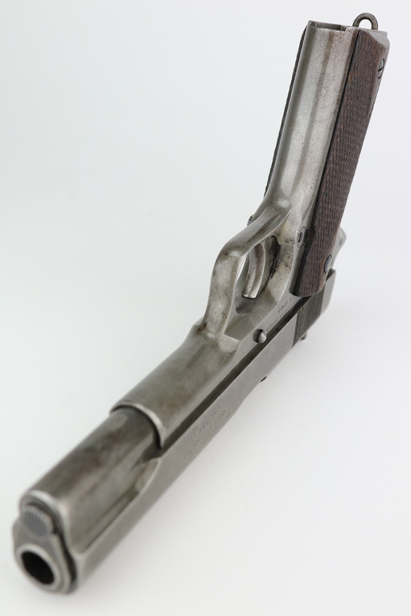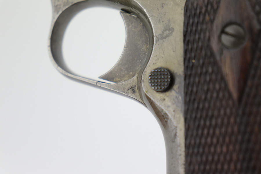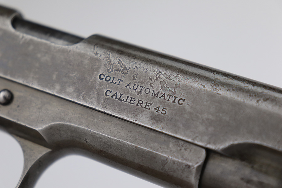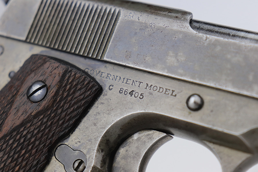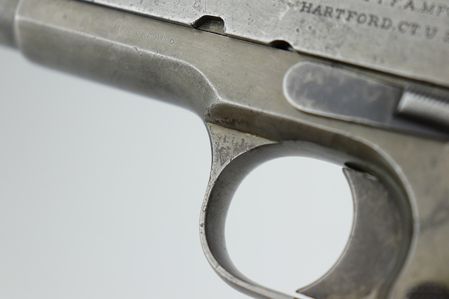 3/7/23 – This is an original example of a very rare Colt Government Model “Russian” contract semi-automatic pistol. In the 1914-1916 years, the Russian Army was severely short of arms and ammunition and was forced to purchase thousands of weapons from abroad based on credits that the Russian Government had negotiated with Great Britain. These credits were supported by the Gold reserves held in Russia, however all the contracts had to be placed with Great Britain on behalf of Russia. In this way Russia was able to purchase Colt pistols through Great Britain. So during the 1916-1917 timeframe Russia purchased approximately 51,000 Colt Model 1911 commercial pistols. These were standard Colt commercial models that didn’t have any specific Russian acceptance proofs, however the left side of the frame is marked in Cyrillic letters “АНГЛ. ЗАКАЗЬ”, which roughly translate to “English Order” or “British Contract”. These are an extremely rare pistol as almost no examples were ever imported into this country. These pistols fall into the serial number range of “C23000 to C89000”, and we have also confirmed the originality with a Colt archive letter stating this was shipped to the Russian government in January of 1917. This particular example has clearly seen better days, but nearly all of the surviving examples were exposed to harsh conditions and heavy use. The finish is worn throughout, and there is some pitting on the slide. The grips show some smoothing and handling wear but no cracks or chips. Bore has some frost and freckling in the grooves but strong rifling. Two-tone magazine.