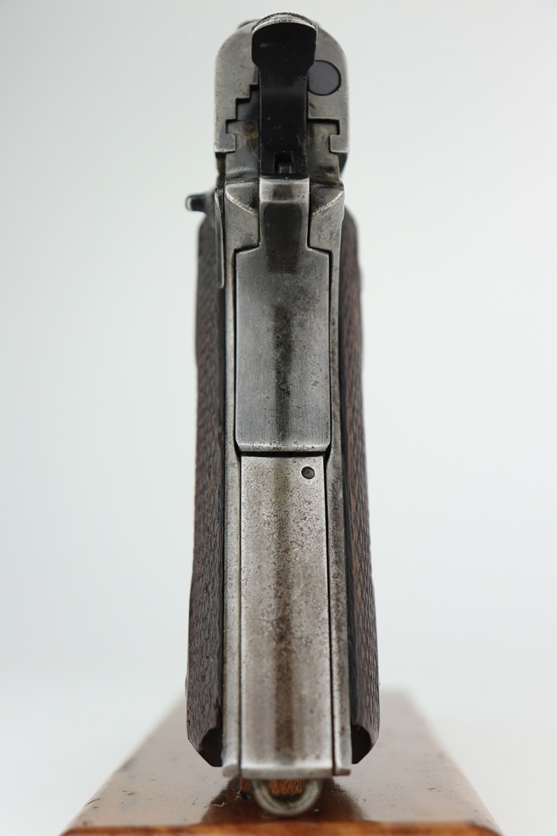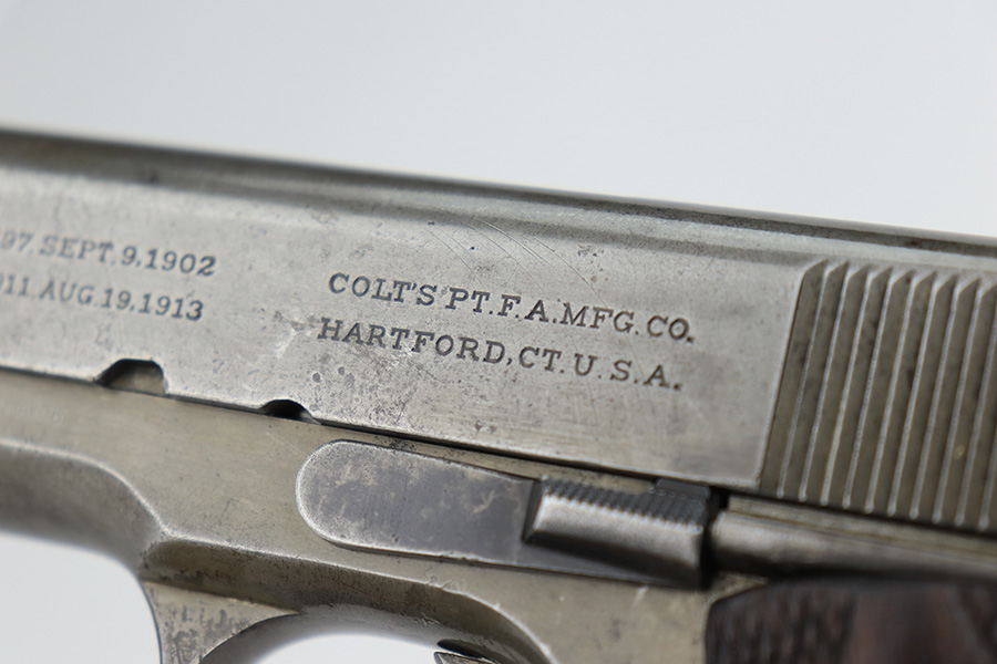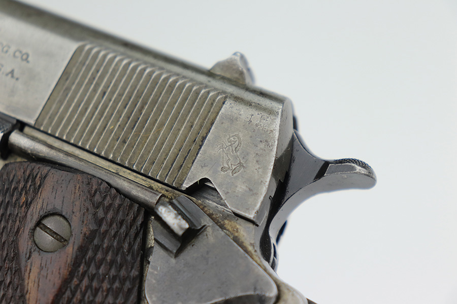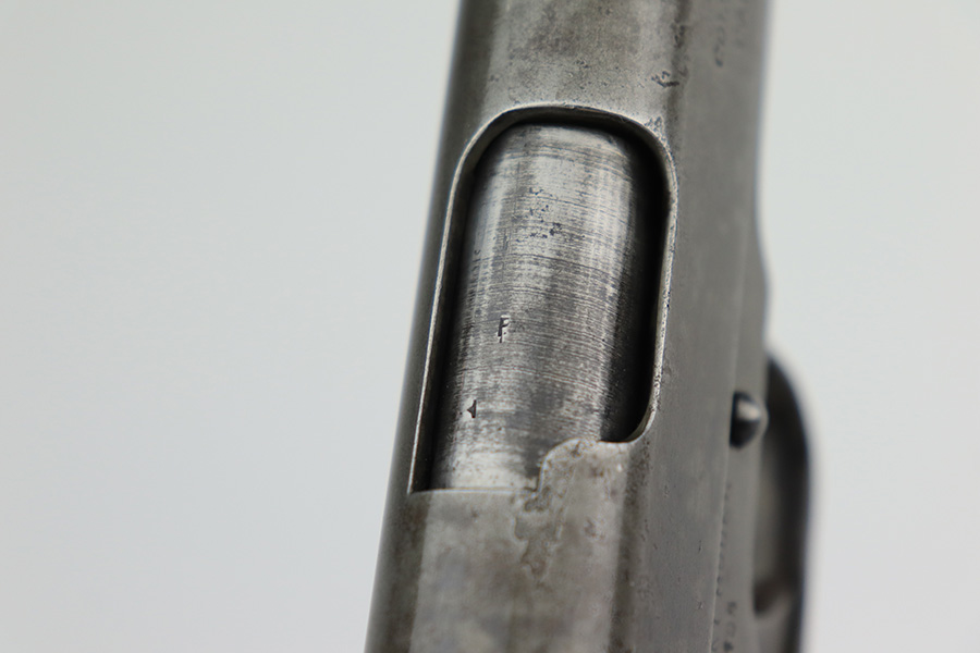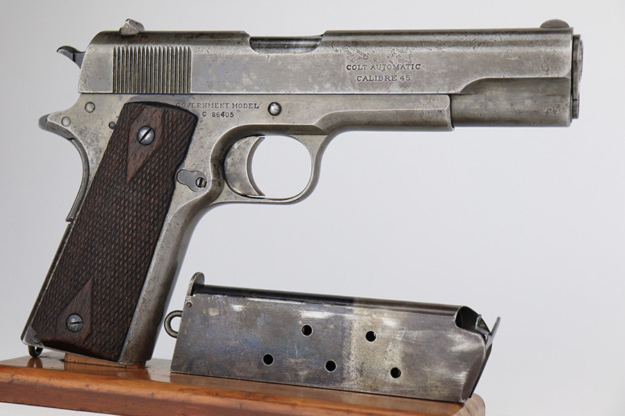 3/7/23 – This is an original example of a very rare Colt Government Model “Russian” contract semi-automatic pistol. In the 1914-1916 years, the Russian Army was severely short of arms and ammunition and was forced to purchase thousands of weapons from abroad based on credits that the Russian Government had negotiated with Great Britain. These credits were supported by the Gold reserves held in Russia, however all the contracts had to be placed with Great Britain on behalf of Russia. In this way Russia was able to purchase Colt pistols through Great Britain. So during the 1916-1917 timeframe Russia purchased approximately 51,000 Colt Model 1911 commercial pistols. These were standard Colt commercial models that didn’t have any specific Russian acceptance proofs, however the left side of the frame is marked in Cyrillic letters “АНГЛ. ЗАКАЗЬ”, which roughly translate to “English Order” or “British Contract”. These are an extremely rare pistol as almost no examples were ever imported into this country. These pistols fall into the serial number range of “C23000 to C89000”, and we have also confirmed the originality with a Colt archive letter stating this was shipped to the Russian government in January of 1917. This particular example has clearly seen better days, but nearly all of the surviving examples were exposed to harsh conditions and heavy use. The finish is worn throughout, and there is some pitting on the slide. The grips show some smoothing and handling wear but no cracks or chips. Bore has some frost and freckling in the grooves but strong rifling. Two-tone magazine.