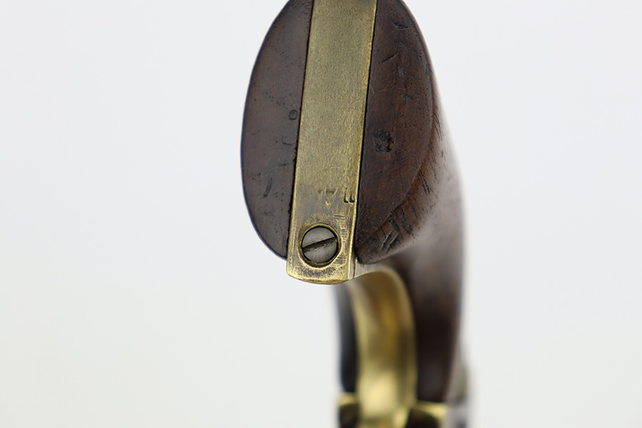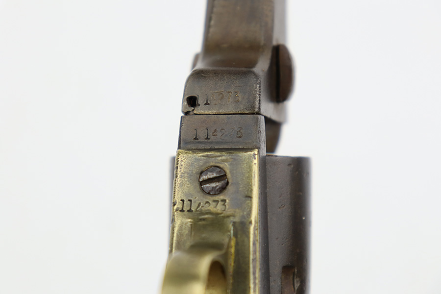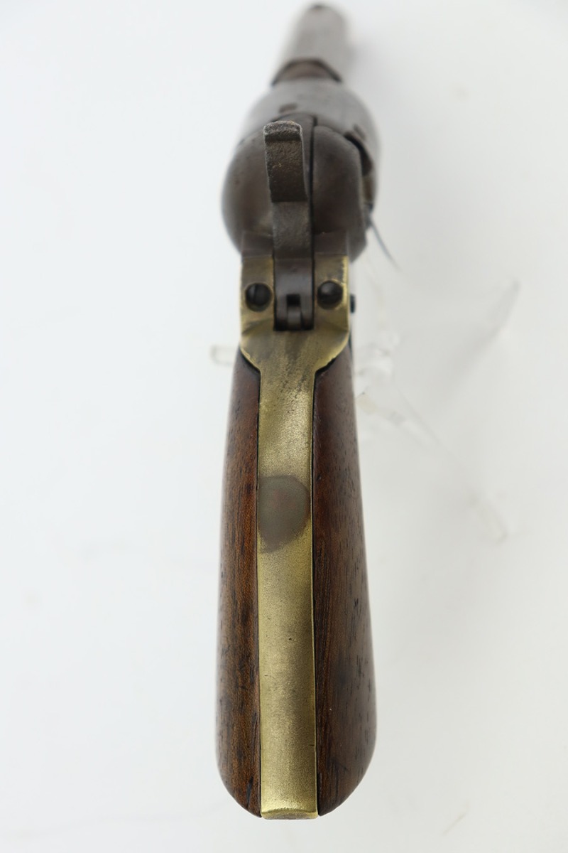 8/14/23 – This is an antique Colt 1849 Pocket Revolver “Wells Fargo Model”, made in 1856 in Hartford, Connecticut. Though over 340,000 1849 Pocket Revolvers were produced by Colt’s factory at Hartford, only a mere 4,000 of them were produced in this configuration with a 3-inch barrel and no loading lever. These would have been even handier for the pocket than their longer-barreled brethren and have been colloquially called the “Wells Fargo Model”. The gun is matching, but part of the serial number on the butt of the frame is obscured, and the serial number on the cylinder has completely worn away. The stagecoach scene on the cylinder has also completely worn away and is no longer visible. The frame, cylinder, and barrel appear to have been touched up with cold blue, and the gun has a light brown appearance throughout. There are areas of pitting, most obvious on the left side of the frame, on the cylinder, and around the hammer. There is a tiny hole in the metal on the underside of the barrel (next to the serial number). Fitted with fairly worn wood grips. The bore has strong rifling, with a few small areas of light oxidation. Fully functional.