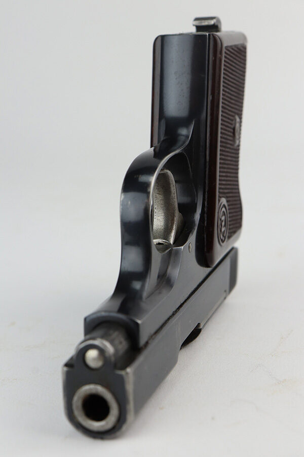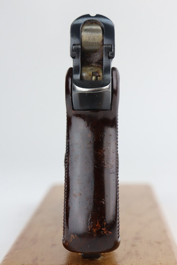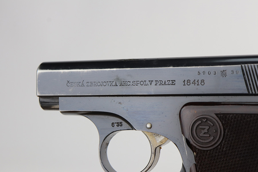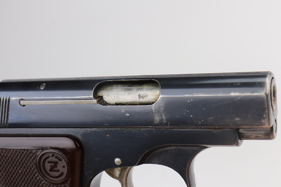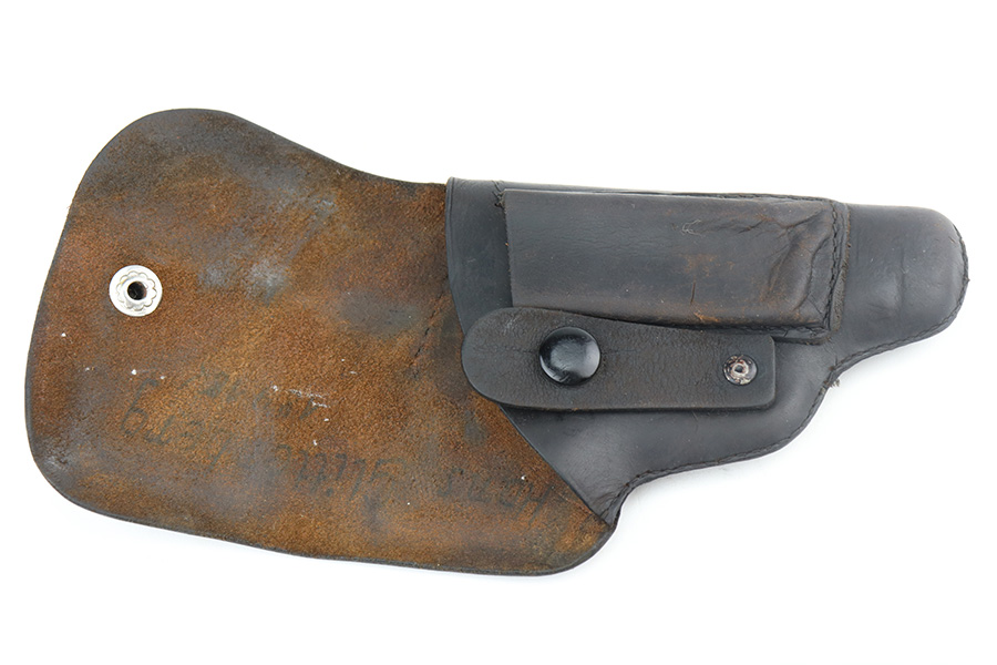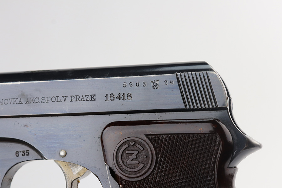 6/9/21 – This is a very nice example of a very rare CZ Model 36 rig sold in the commercial market in 1936. The gun is all matching, has a Czech lion proof, and is dated 1939. The gun comes with a period-correct holster that has someone’s name and the serial number written on the inside. The stitching at the top of the belt loop is missing. It has retained about 93% of its original high polish finish. Minor wear on the high edges of the slide and around the muzzle. Some spotty wear on the right side of the slide. Comes with nice original grip with a chip in the left side. Also comes with a period-correct magazine. Excellent bore – shiny with strong rifling.