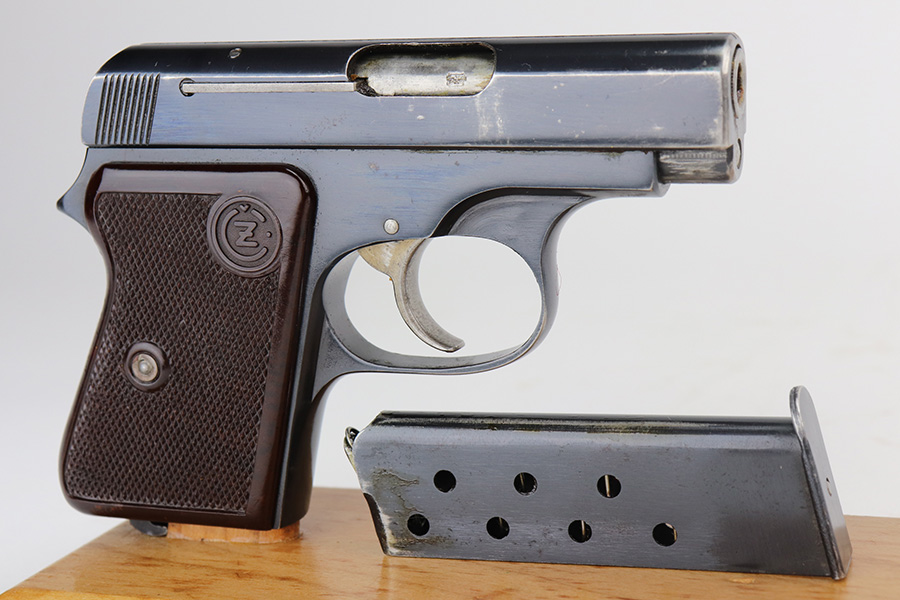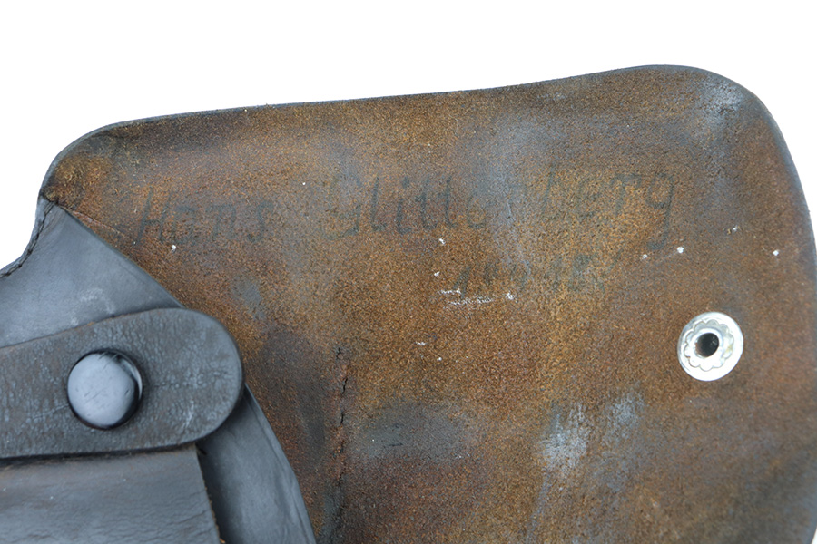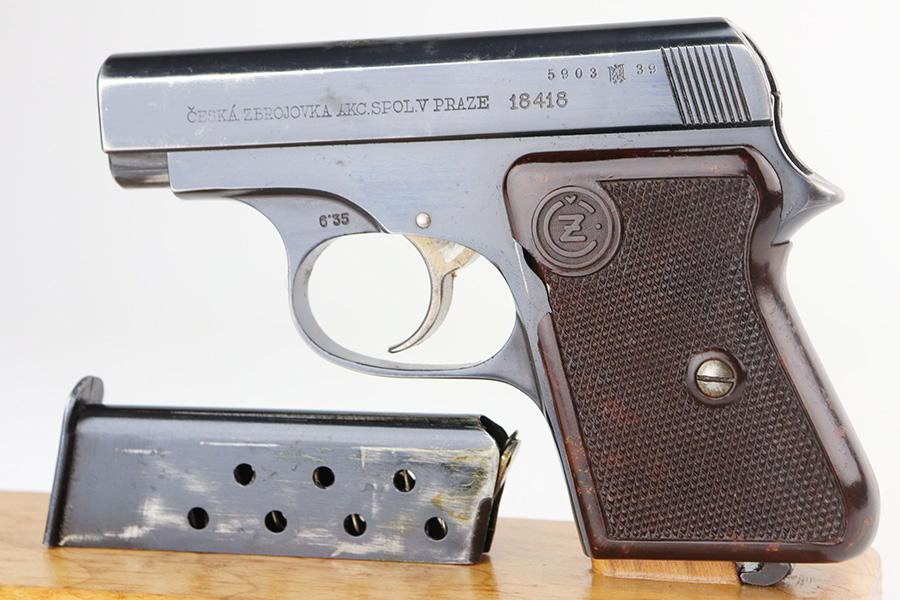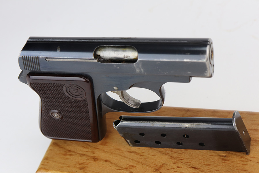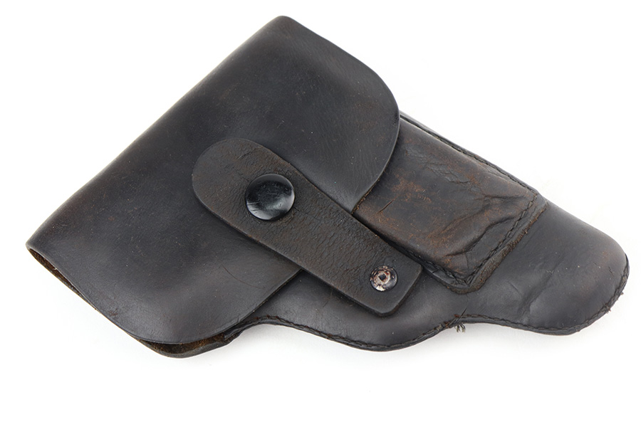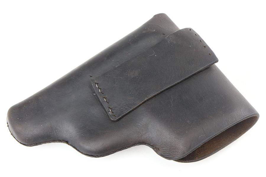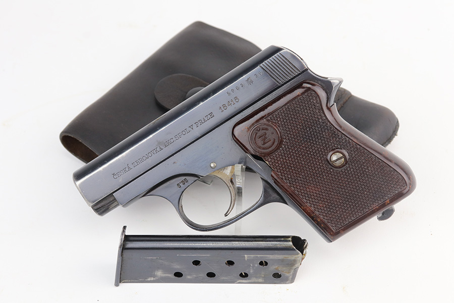 6/9/21 – This is a very nice example of a very rare CZ Model 36 rig sold in the commercial market in 1936. The gun is all matching, has a Czech lion proof, and is dated 1939. The gun comes with a period-correct holster that has someone’s name and the serial number written on the inside. The stitching at the top of the belt loop is missing. It has retained about 93% of its original high polish finish. Minor wear on the high edges of the slide and around the muzzle. Some spotty wear on the right side of the slide. Comes with nice original grip with a chip in the left side. Also comes with a period-correct magazine. Excellent bore – shiny with strong rifling.