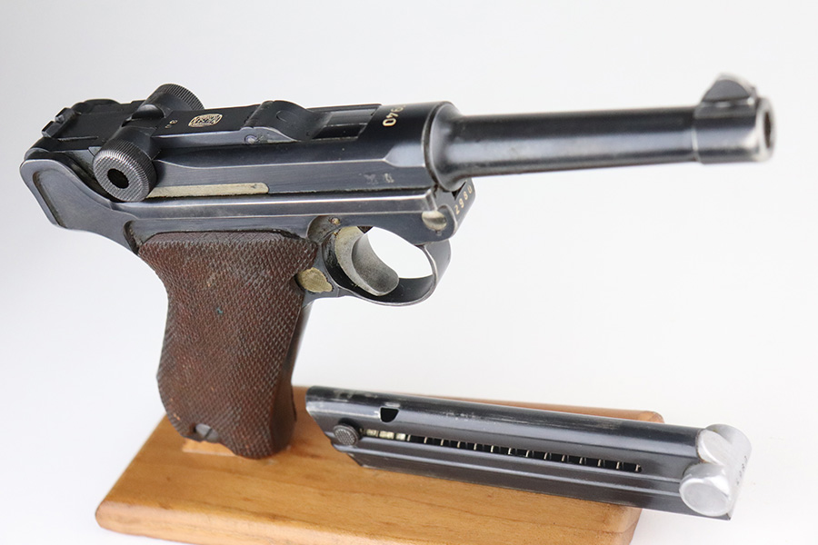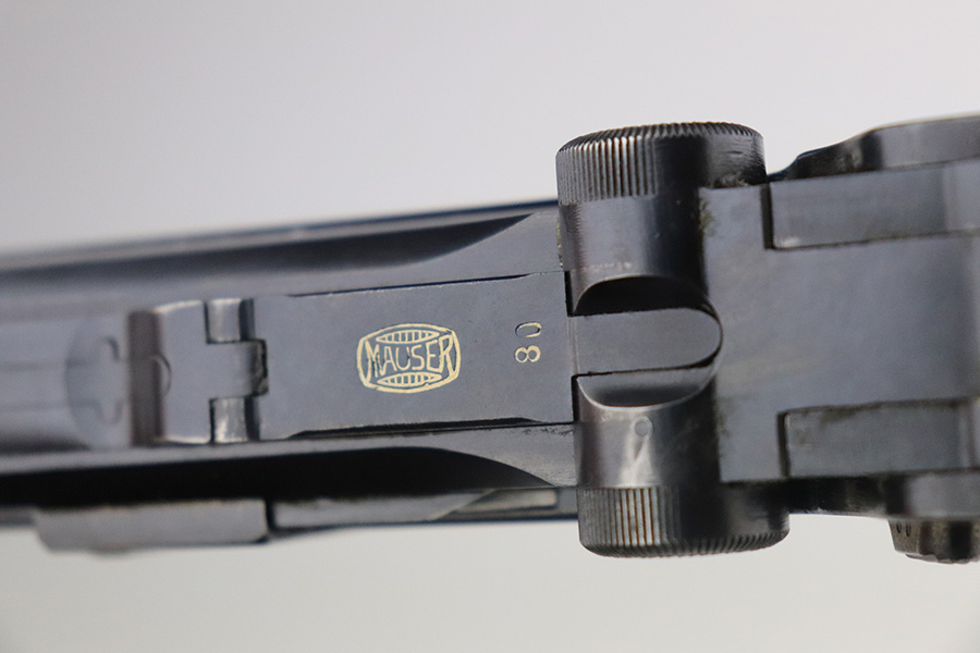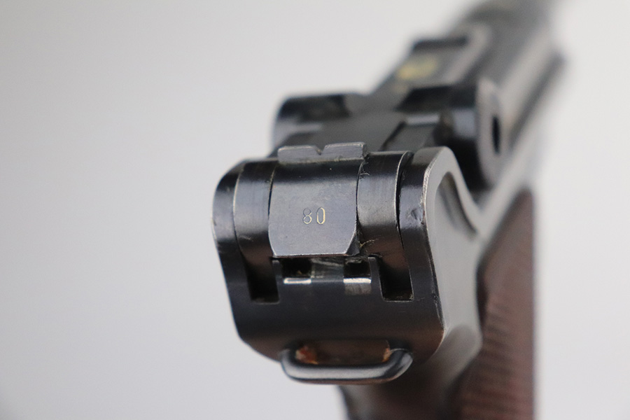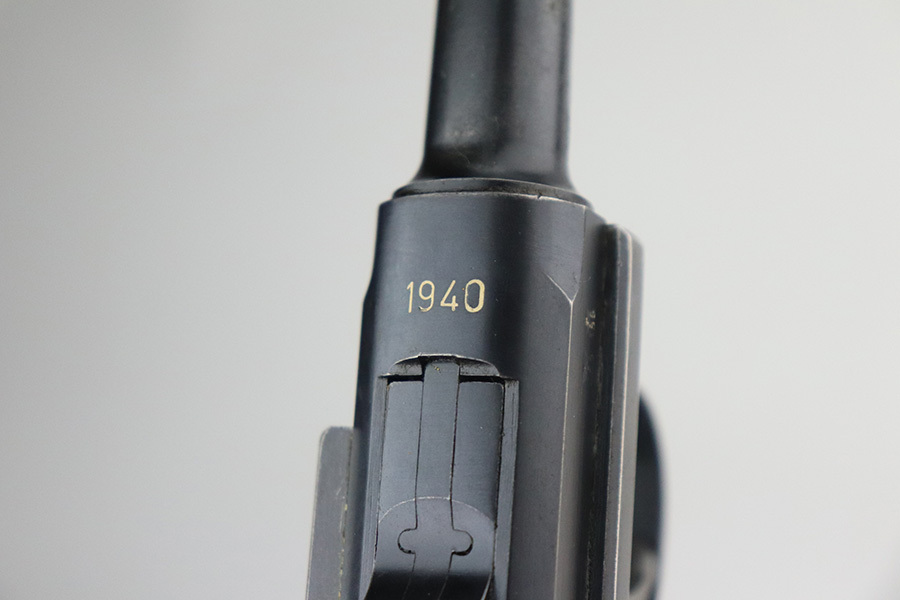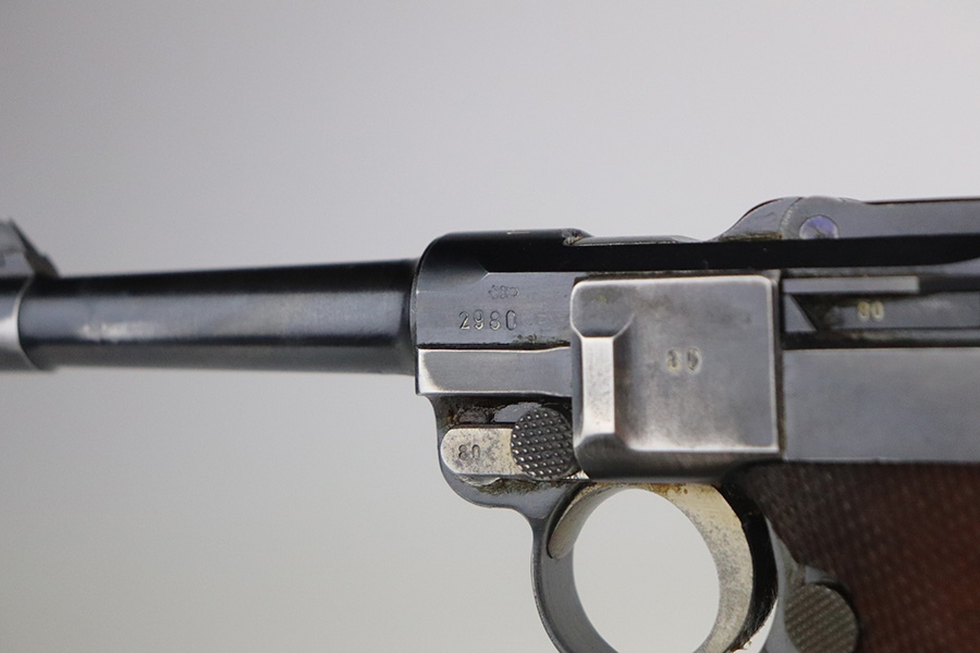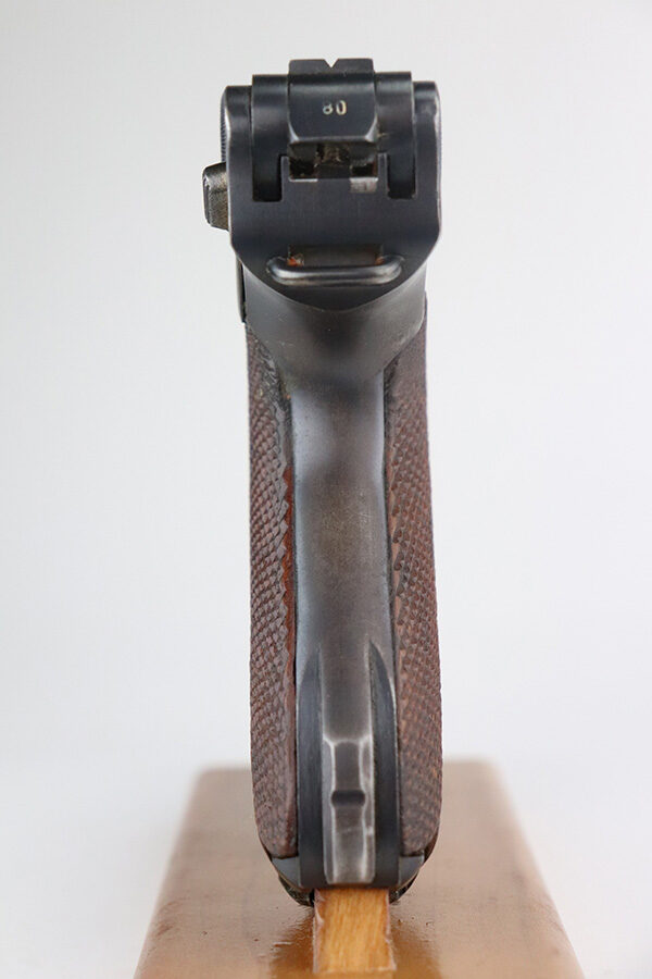 7/3/21 – This is a nice example of a very rare 1940 Mauser Banner Luger. The Dutch Army and its Air Force were procuring these Lugers from Mauser between 1937-1940. Some of these guns were in the middle of production during Germany’s invasion of Holland in 1940. They were seized by the Germans, given waffen military proofs, and subsequently issued to the Nazi military. The reported serial range for these guns is 2551v-3254v. They are very rare – estimated procurement is only about 600. They are dated 1940 on the chamber, have the Mauser banner logo, have “Crown U” proofs, the Dutch “Rust” safety, and bear “Eagle 655” Nazi military proofs on the right side of the side of the slide. This particular example is all matching, has all the proper characteristics, and falls in the correct serial range for this variation. It has retained roughly 85% of its original finish. Most of the wear is on the straps and on the side plate. But there are also areas of minor wear on the side rails, on the left side of the barrel, and around the muzzle. It comes with excellent un-numbered grips and a matching magazine. The bore is shiny with strong rifling with minor freckling in the grooves.