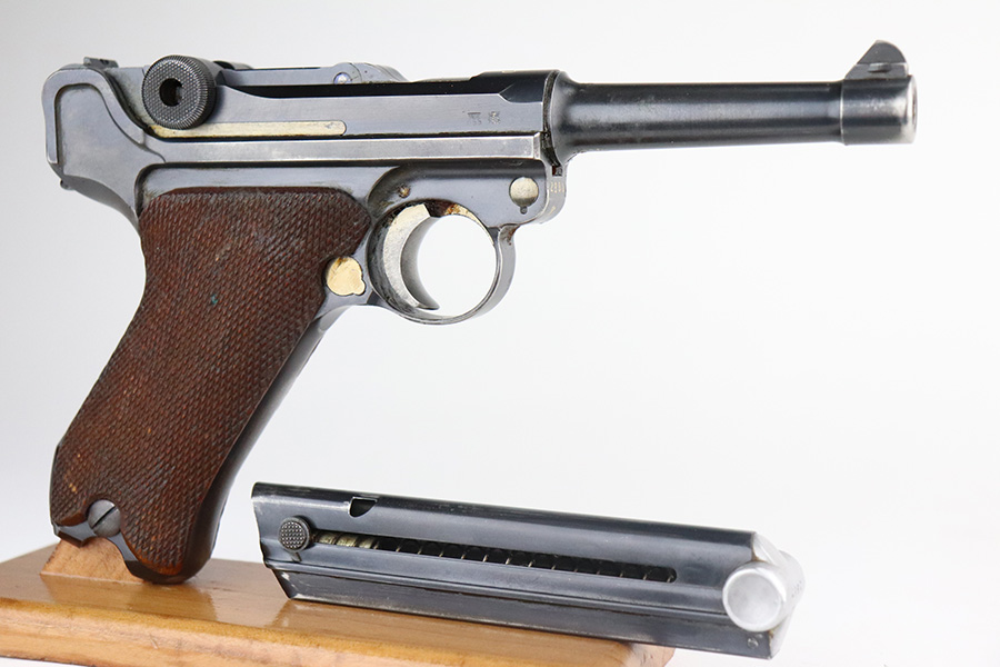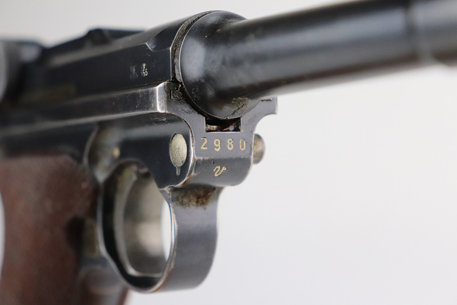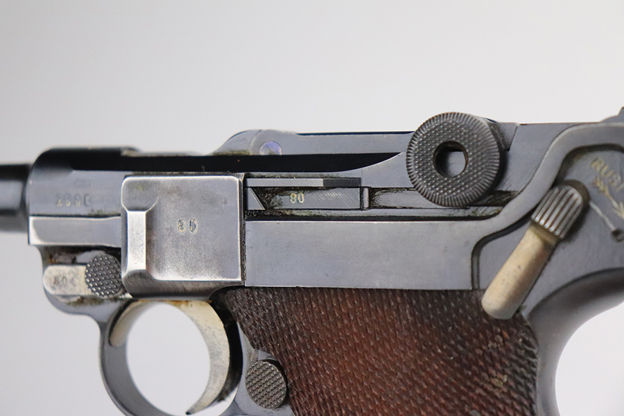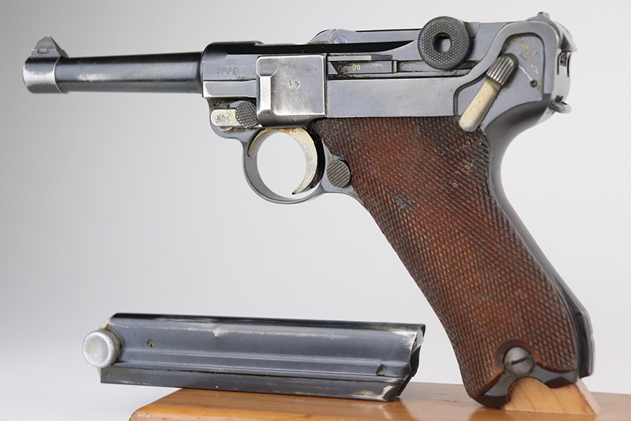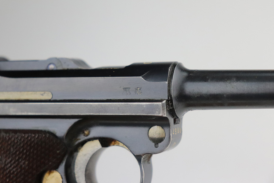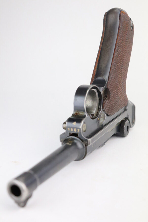7/3/21 – This is a nice example of a very rare 1940 Mauser Banner Luger. The Dutch Army and its Air Force were procuring these Lugers from Mauser between 1937-1940. Some of these guns were in the middle of production during Germany’s invasion of Holland in 1940. They were seized by the Germans, given waffen military proofs, and subsequently issued to the Nazi military. The reported serial range for these guns is 2551v-3254v. They are very rare – estimated procurement is only about 600. They are dated 1940 on the chamber, have the Mauser banner logo, have “Crown U” proofs, the Dutch “Rust” safety, and bear “Eagle 655” Nazi military proofs on the right side of the side of the slide. This particular example is all matching, has all the proper characteristics, and falls in the correct serial range for this variation. It has retained roughly 85% of its original finish. Most of the wear is on the straps and on the side plate. But there are also areas of minor wear on the side rails, on the left side of the barrel, and around the muzzle. It comes with excellent un-numbered grips and a matching magazine. The bore is shiny with strong rifling with minor freckling in the grooves.