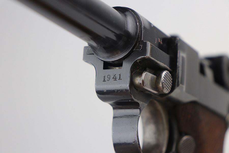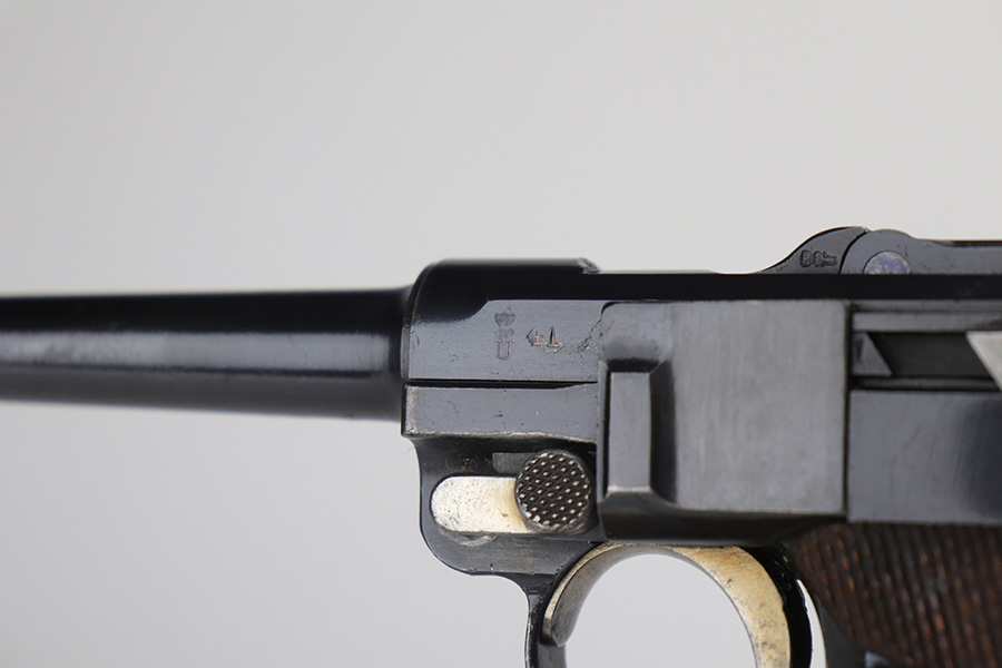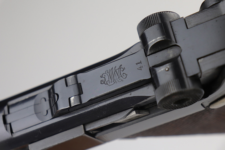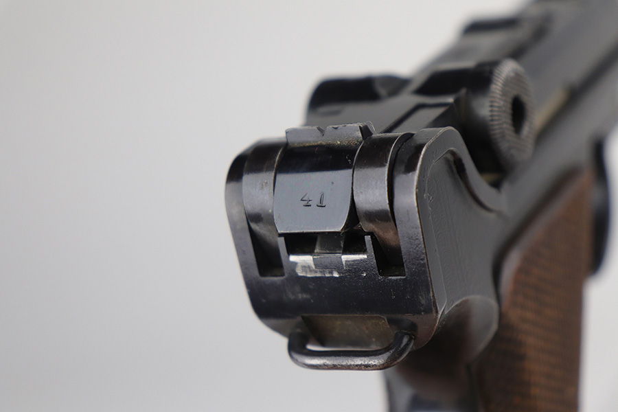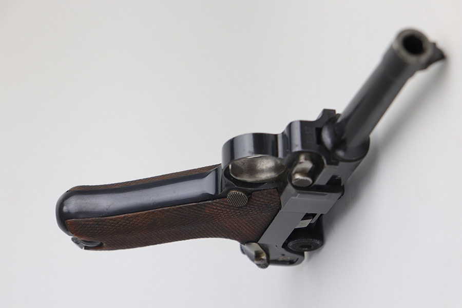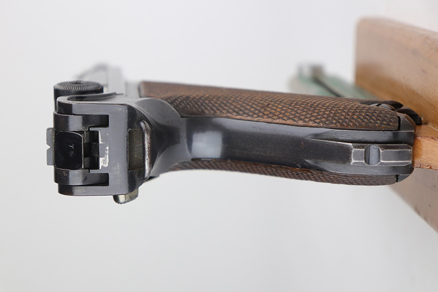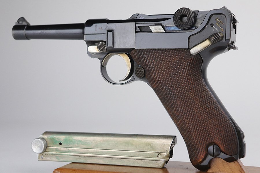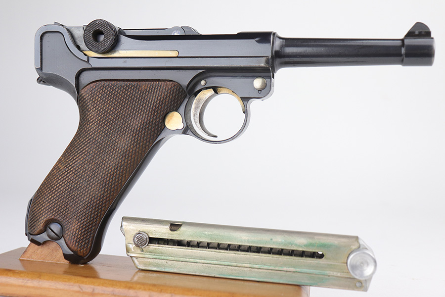 5/4/22 – This is a very rare DWM Luger that was made in ~1930 and went to the Dutch Navy. All numbered parts match, including the grips and hold open. Firing pin and rear toggle pin are unmarked. The magazine is an aluminum body and base, both of which are also unmarked. The gun is in excellent condition with minor high edge and strap wear, though the toggle assembly has a polished finish which may indicate that part was refinished. The frame features the Dutch “Rust” marking in the safety area, and strawed small parts. Grips have some smoothing and handling wear but no cracks. Excellent, shiny bore.