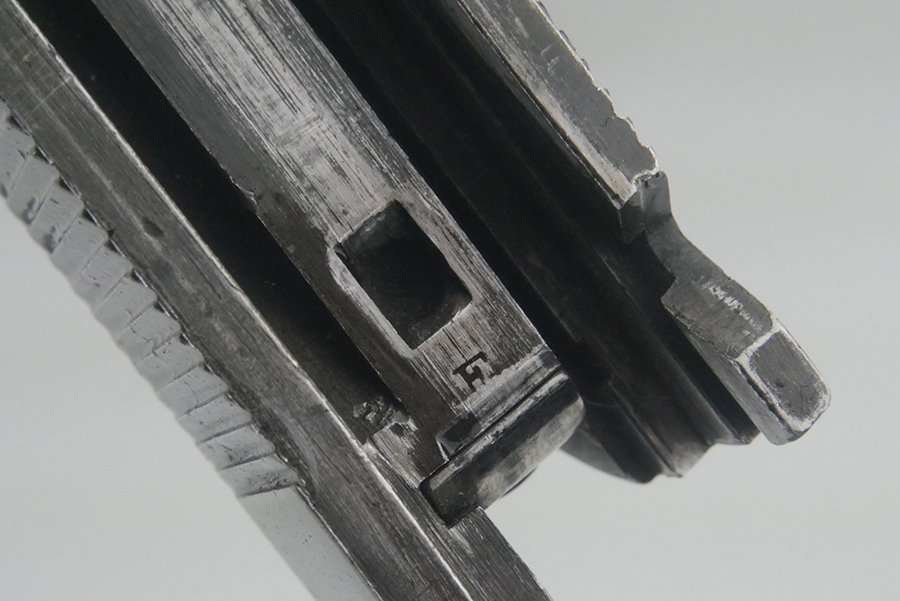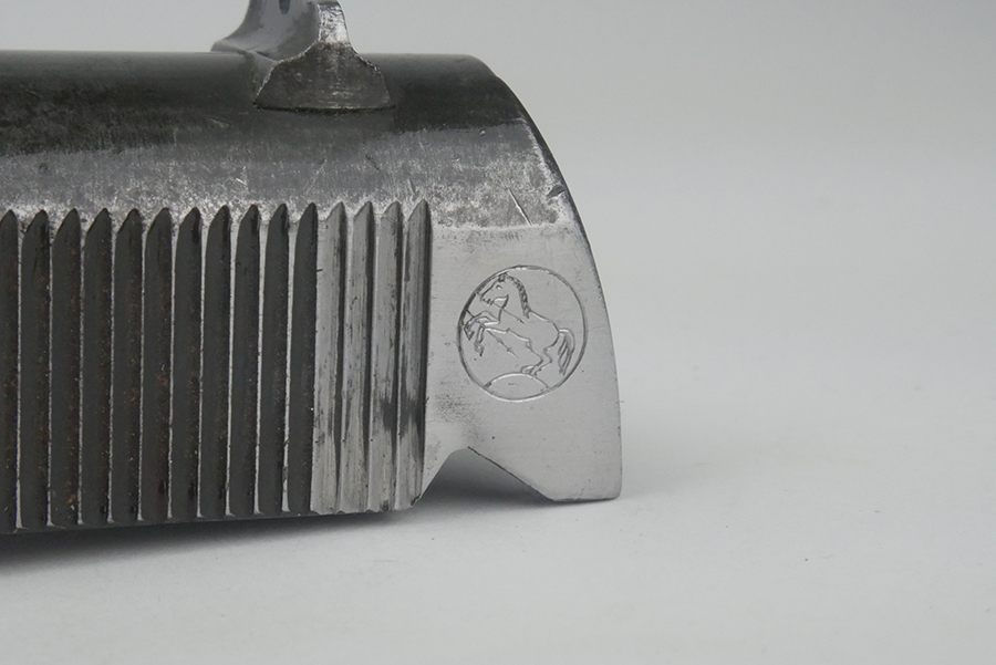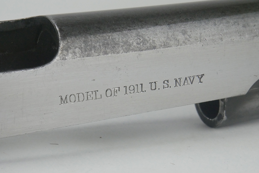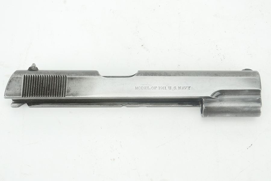 5/17/24 – This is a rare, original Colt 1911 slide that is U.S. Navy roll marked and has a 1911 patent date and vertical ‘H’ proof on rear of slide. This patent date was only used until serial numbers ~83xxx. The finish on the slide is original but worn throughout with maybe 15% of the blue remaining but no major corrosion. There is a somewhat prominent ding along the top though.