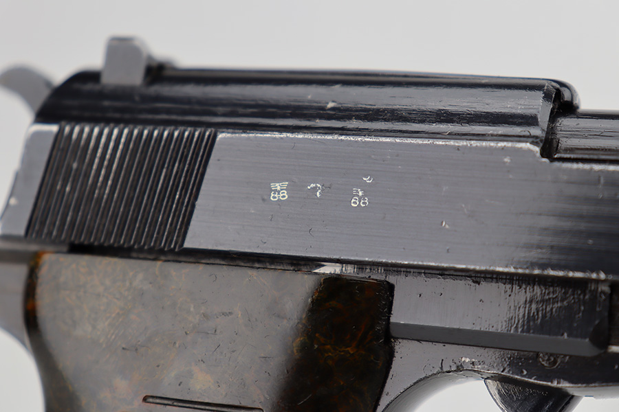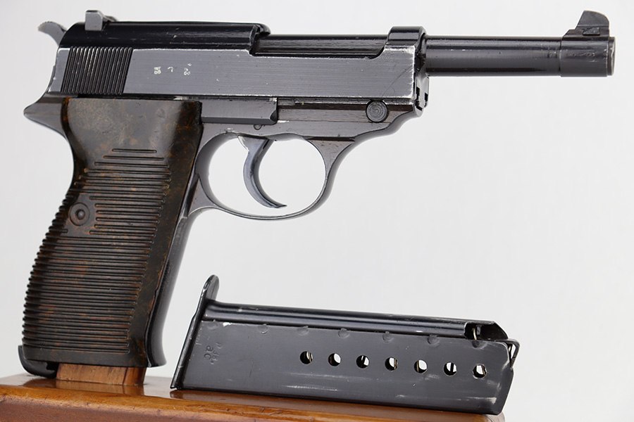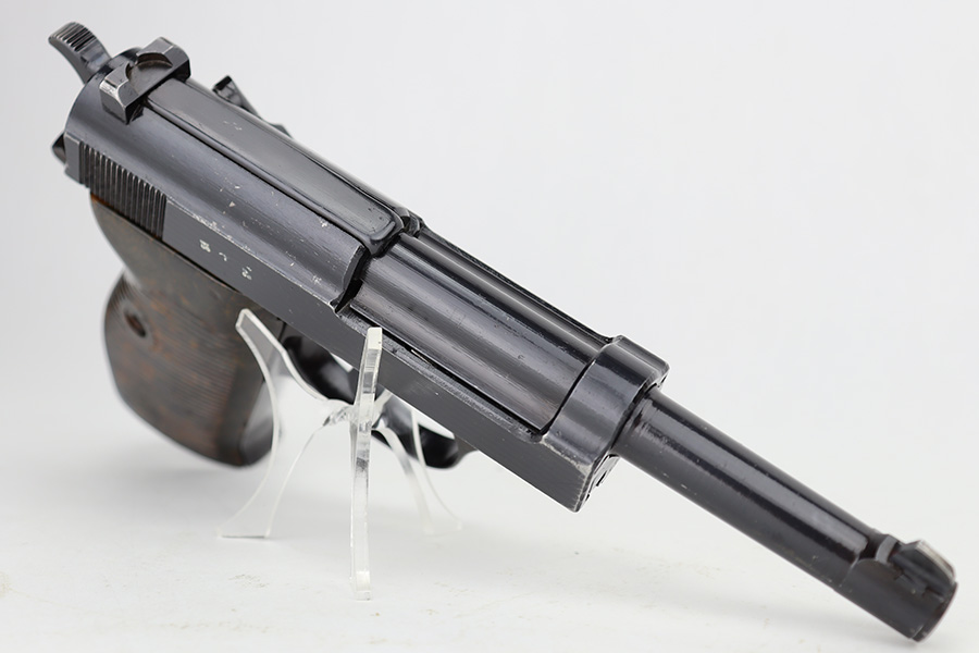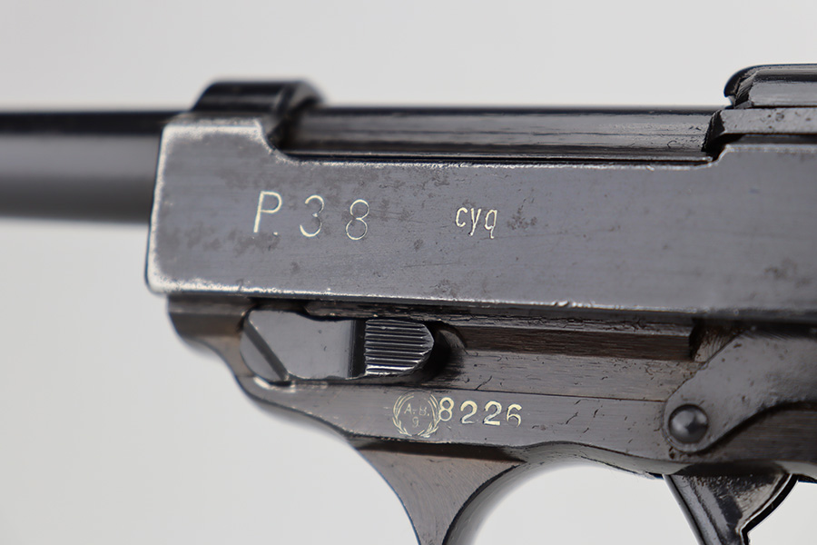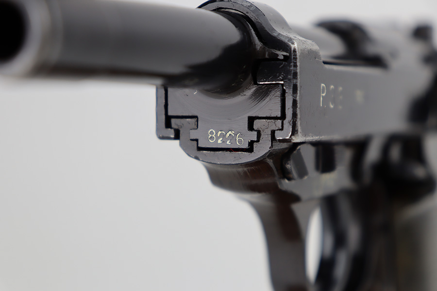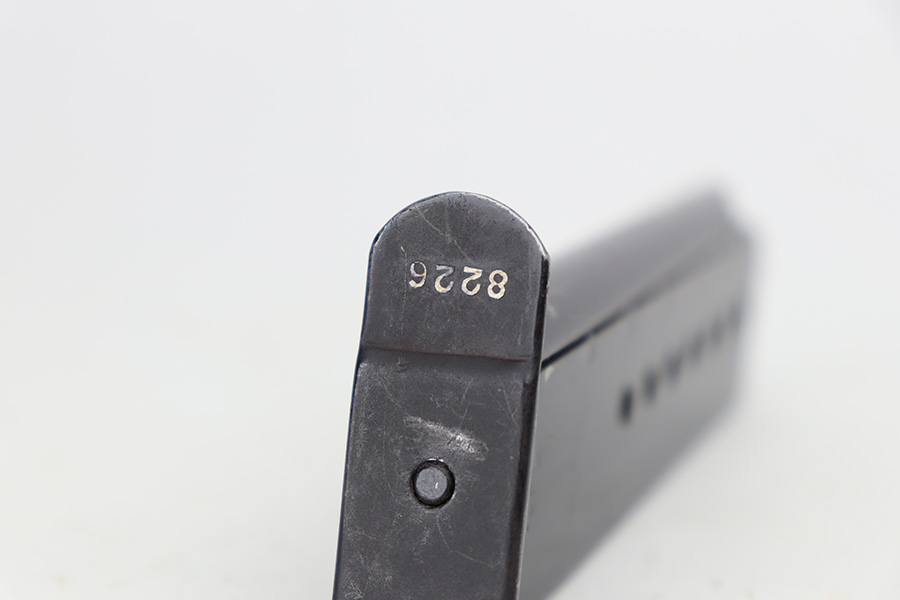 6/15/23 – This is a very rare P.38 made by the Ernst Thalmann factory in Suhl in 1953. They only made about 120 of these guns. It is all matching and has all the correct proofs. In this variation, the main parts were usually newly manufactured by Ernst Thalmann. This one has a Spreewerk slide and has Nazi proofs on the right side. These weapons were marked with the A.B.9 logo. New production started for some weapon types that were needed for arming the newly established German Communist authorities. In the beginning, the readily available German WW2 weapons were used, although those weapons needed spare parts and replacement. This one has retained about 90-92% of its finish. Most of the wear is on the front strap, but there is also minor wear around the muzzle and on the front edges of the slide. Fitted with excellent bakelite grips. Comes with a matching-numbered “ac” and “Eagle 359” marked Walther magazine. Excellent bore with great rifling. De-cocker is functional.