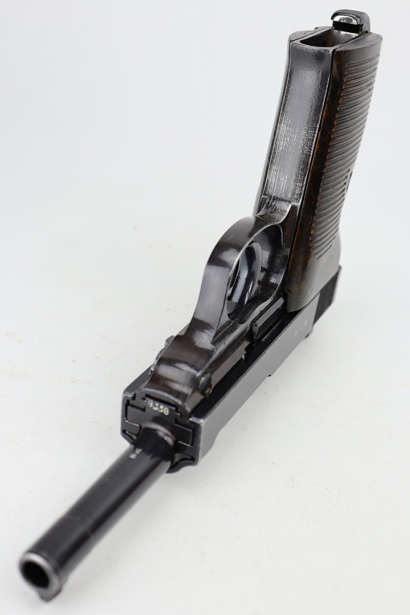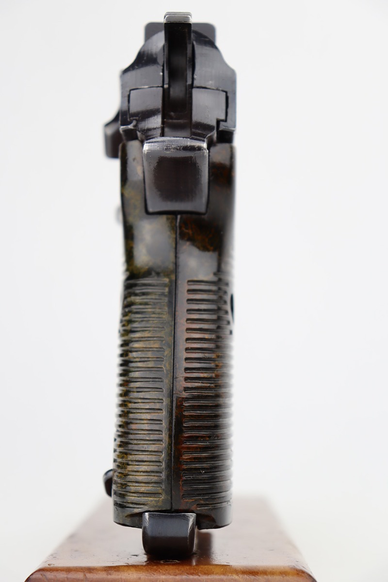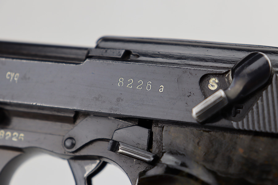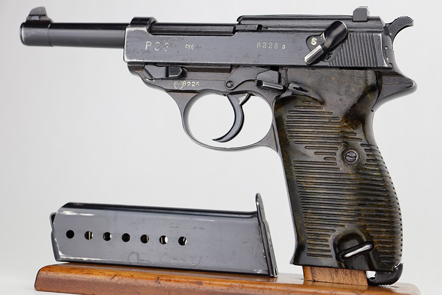6/15/23 – This is a very rare P.38 made by the Ernst Thalmann factory in Suhl in 1953. They only made about 120 of these guns. It is all matching and has all the correct proofs. In this variation, the main parts were usually newly manufactured by Ernst Thalmann. This one has a Spreewerk slide and has Nazi proofs on the right side. These weapons were marked with the A.B.9 logo. New production started for some weapon types that were needed for arming the newly established German Communist authorities. In the beginning, the readily available German WW2 weapons were used, although those weapons needed spare parts and replacement. This one has retained about 90-92% of its finish. Most of the wear is on the front strap, but there is also minor wear around the muzzle and on the front edges of the slide. Fitted with excellent bakelite grips. Comes with a matching-numbered “ac” and “Eagle 359” marked Walther magazine. Excellent bore with great rifling. De-cocker is functional.