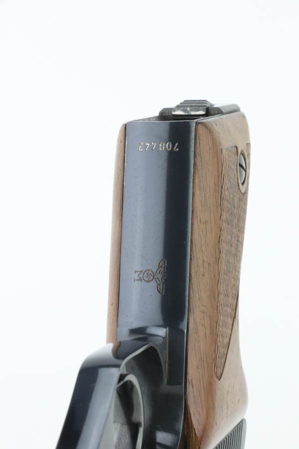 09/27/2024 – For sale is a 1 of 638 units of Mauser HSc pistols made for the German Navy in 1940. The pistol has a very nice highly polished blued finish with minor edge wear on the slide. The front of the grip has an Eagle/M stamped to denote it for the German Navy. The slide and barrel are not matching with the frame. The bore is very bright with good rifling. The wood panels are in great condition and are free of any cracks or breaks.