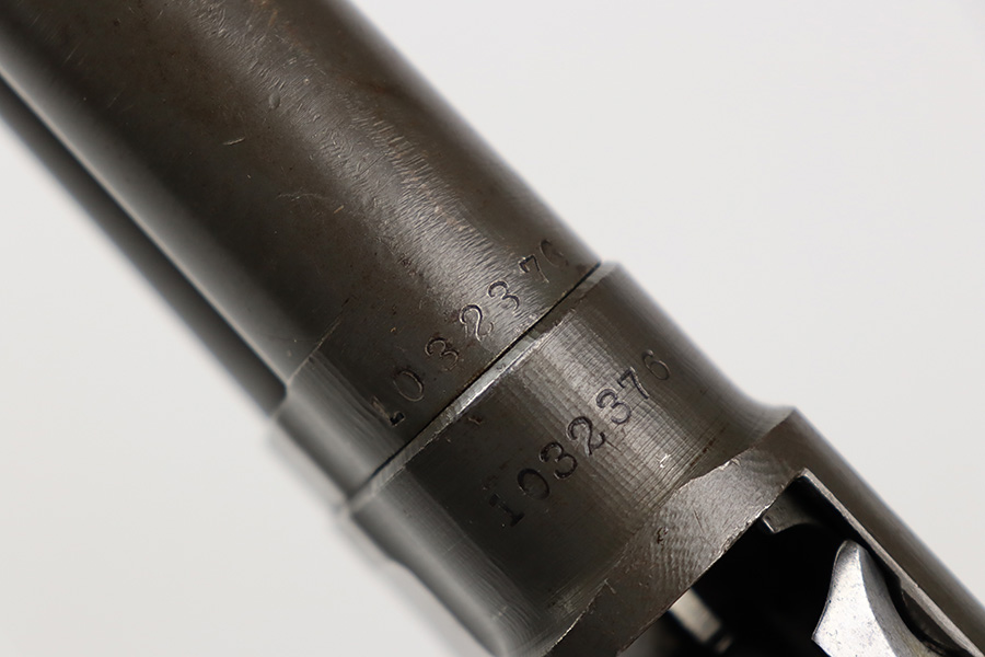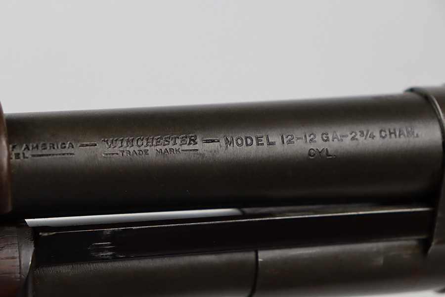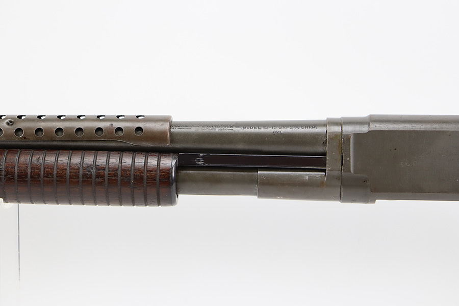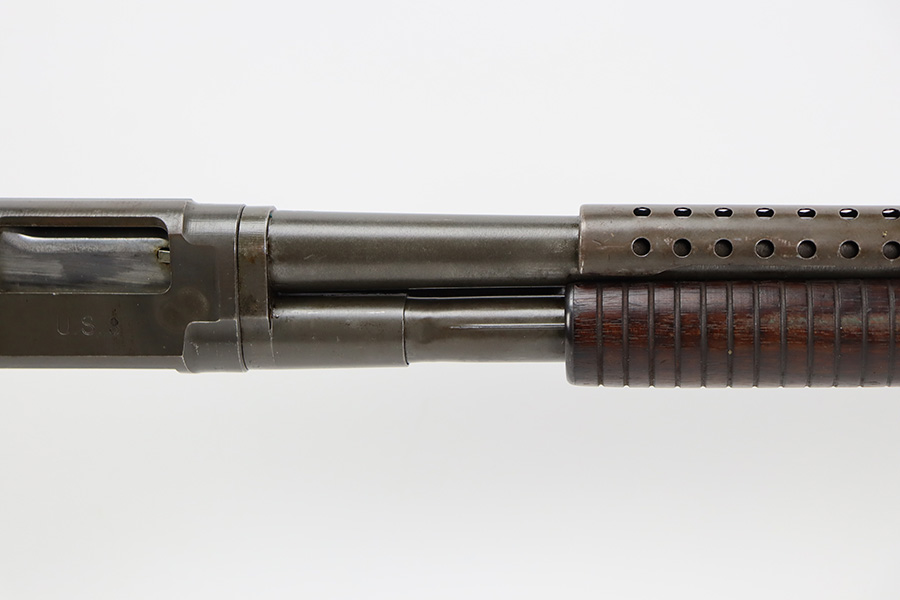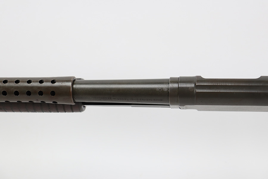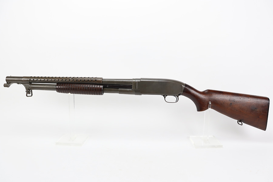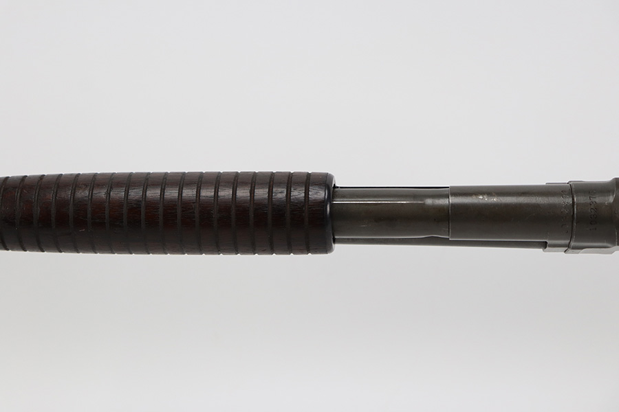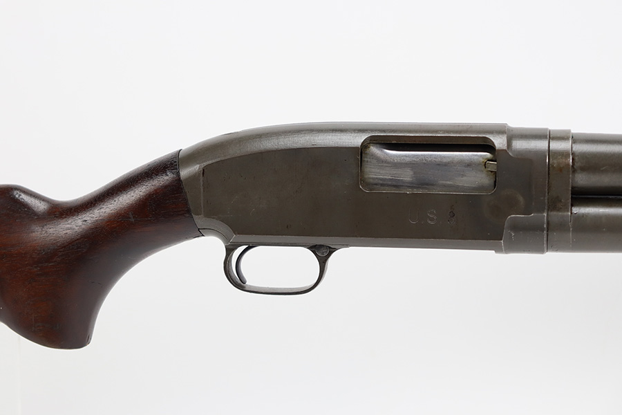9/20/23 – This is a very rare and desirable Winchester Model 12 Trench Shotgun that was issued to the U.S. military. It’s in the proper serial range for Winchester Model 12 trench guns, and more specifically, the proper range for those with a factory parkerized finish. This range runs from only 1.03m to 1.036m with some blued examples mixed in, so this is a very rare military shotgun. The parkerizing on these original examples is somewhat distinct as they exhibit a lack of final polishing. Receiver is U.S. marked with flaming bomb ordnance proof. Stock has GHD inspector’s mark over crossed cannons cartouche. Correct Model 12 stock with thicker wrist. The barrel, receiver, magazine and handguard/bayonet adapter have the gray-green parkerized finish found on Winchester M1 rifles and M1 carbines. The finish is very nice overall, with most of the wear found on the heat shield. The slide action bar, trigger and slide release have the blue commercial finish. The wood furniture is in good condition, with minor handling wear and dings but no cracks. Original Winchester buttplate with no cracks or chips. Bore shows minor use but is generally shiny. 20in barrel marked ‘cyl’ is correct. Proper 4-row heat shield, and the bayonet adaptor has a Winchester ‘W’ marking.