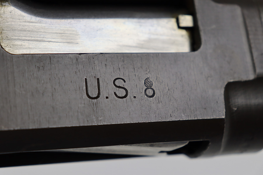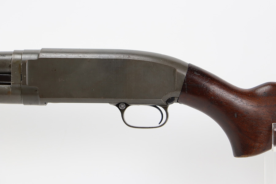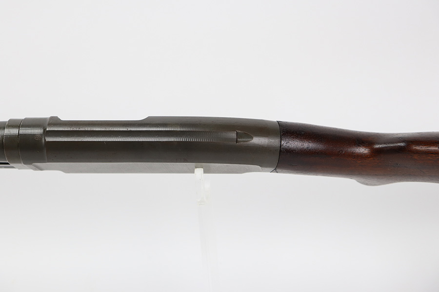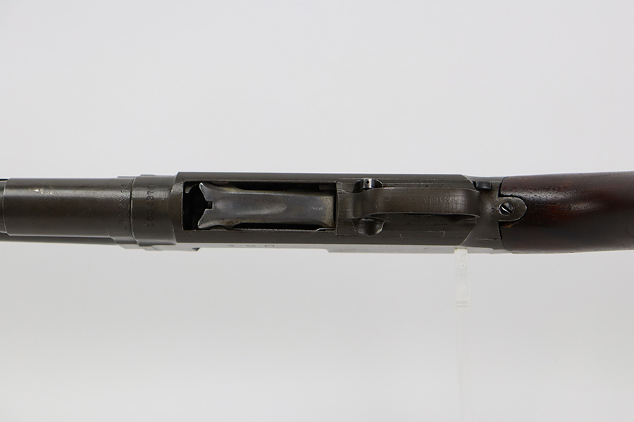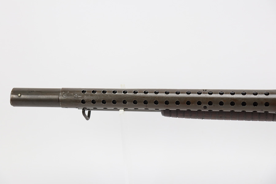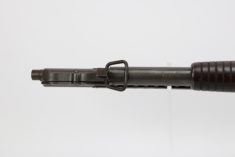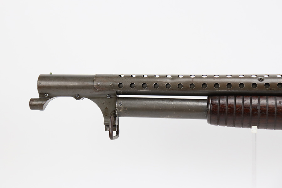 9/20/23 – This is a very rare and desirable Winchester Model 12 Trench Shotgun that was issued to the U.S. military. It’s in the proper serial range for Winchester Model 12 trench guns, and more specifically, the proper range for those with a factory parkerized finish. This range runs from only 1.03m to 1.036m with some blued examples mixed in, so this is a very rare military shotgun. The parkerizing on these original examples is somewhat distinct as they exhibit a lack of final polishing. Receiver is U.S. marked with flaming bomb ordnance proof. Stock has GHD inspector’s mark over crossed cannons cartouche. Correct Model 12 stock with thicker wrist. The barrel, receiver, magazine and handguard/bayonet adapter have the gray-green parkerized finish found on Winchester M1 rifles and M1 carbines. The finish is very nice overall, with most of the wear found on the heat shield. The slide action bar, trigger and slide release have the blue commercial finish. The wood furniture is in good condition, with minor handling wear and dings but no cracks. Original Winchester buttplate with no cracks or chips. Bore shows minor use but is generally shiny. 20in barrel marked ‘cyl’ is correct. Proper 4-row heat shield, and the bayonet adaptor has a Winchester ‘W’ marking.