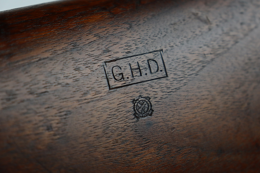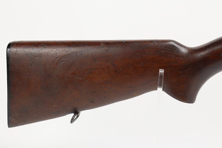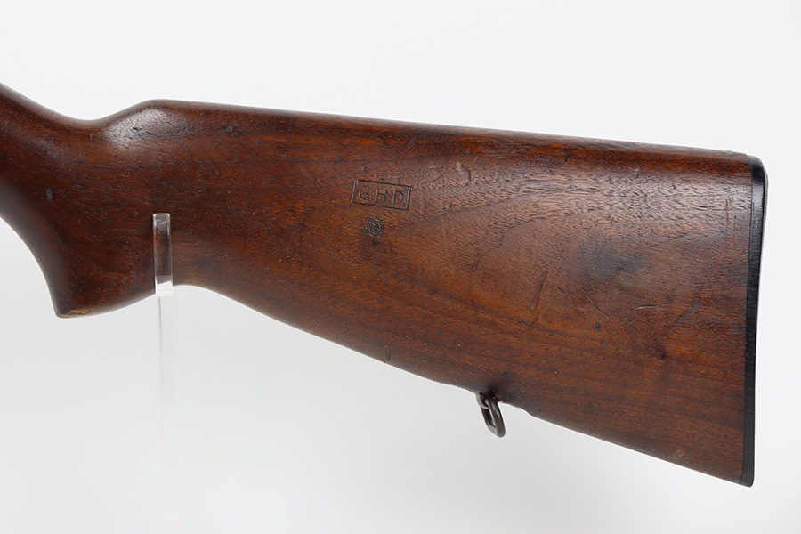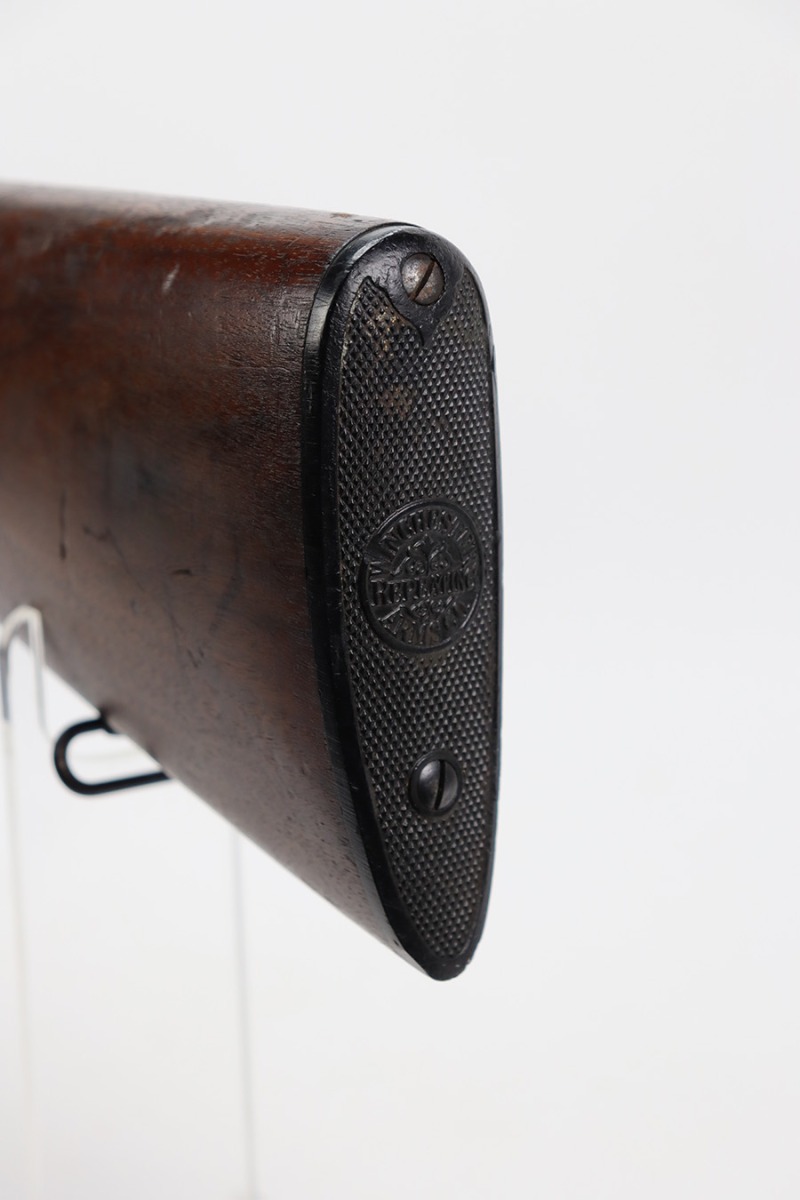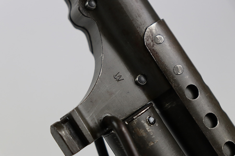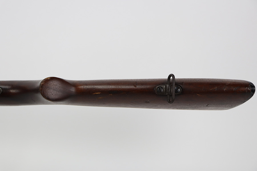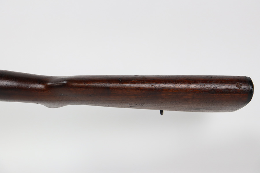9/20/23 – This is a very rare and desirable Winchester Model 12 Trench Shotgun that was issued to the U.S. military. It’s in the proper serial range for Winchester Model 12 trench guns, and more specifically, the proper range for those with a factory parkerized finish. This range runs from only 1.03m to 1.036m with some blued examples mixed in, so this is a very rare military shotgun. The parkerizing on these original examples is somewhat distinct as they exhibit a lack of final polishing. Receiver is U.S. marked with flaming bomb ordnance proof. Stock has GHD inspector’s mark over crossed cannons cartouche. Correct Model 12 stock with thicker wrist. The barrel, receiver, magazine and handguard/bayonet adapter have the gray-green parkerized finish found on Winchester M1 rifles and M1 carbines. The finish is very nice overall, with most of the wear found on the heat shield. The slide action bar, trigger and slide release have the blue commercial finish. The wood furniture is in good condition, with minor handling wear and dings but no cracks. Original Winchester buttplate with no cracks or chips. Bore shows minor use but is generally shiny. 20in barrel marked ‘cyl’ is correct. Proper 4-row heat shield, and the bayonet adaptor has a Winchester ‘W’ marking.