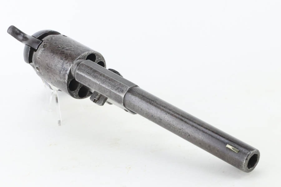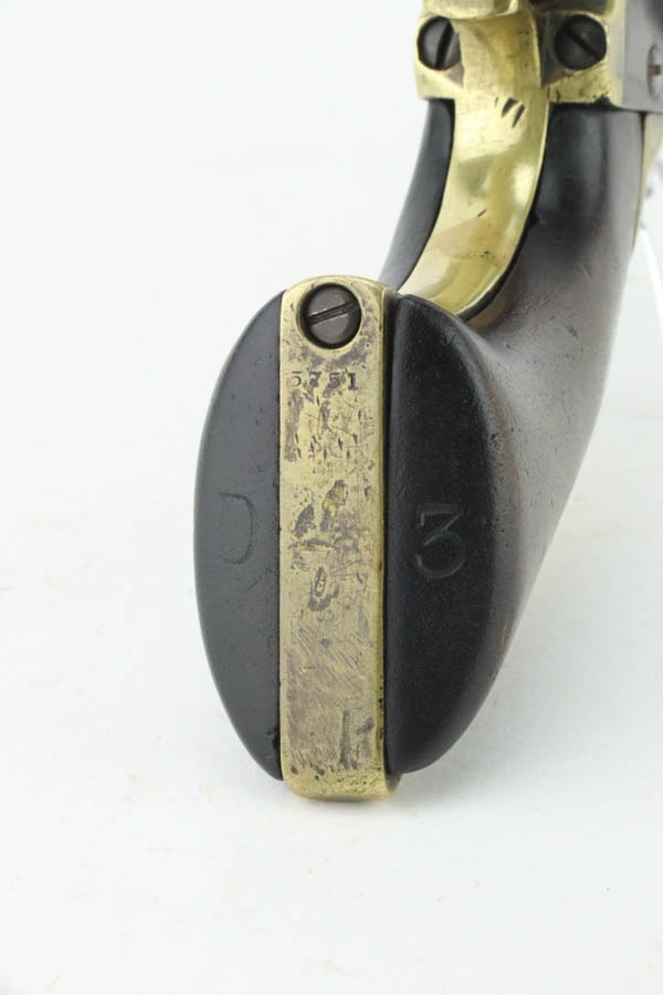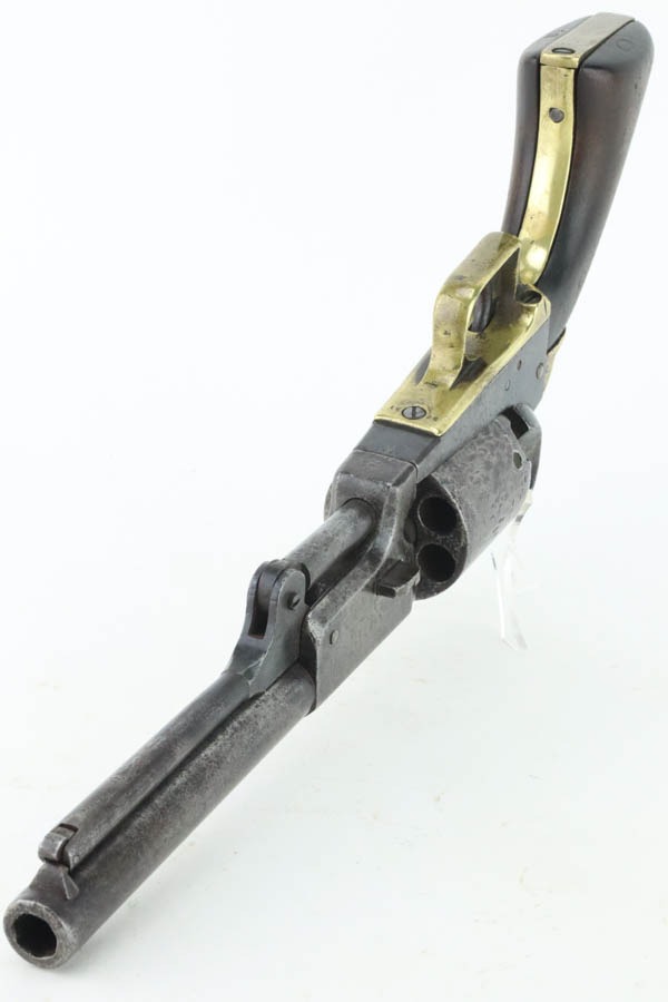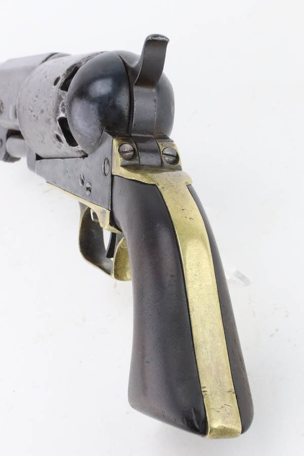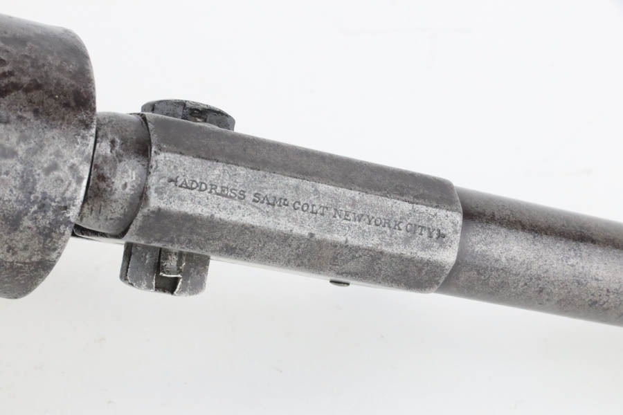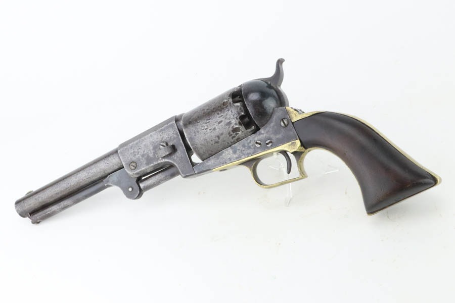 10/16/24 – This is a matching and original example of a very rare 1st Model Colt Dragoon revolver from ~1849. Matching numbers on all of the parts, including the barrel wedge. However, since the cylinder is worn, we can’t read a serial number on it. The First Model Dragoon is an important descendant of the famous Colt Walker revolver which debuted just one year earlier and was meant for use by the U.S. Mounted Riflemen and U.S. Dragoons and saw use on the western frontier in the antebellum era and on the battlefields of the Civil War in both Union and Confederate hands. This specific revolver was manufactured in 1849, falls within the First Model serial number range (1341 through about 8000). “US” marked on the left side of the frame. Nearly 100% of the early Dragoons were issued, so they are very difficult to find with any bluing left. This one is no different, as virtually all of the finish is worn with honest “attic patina” and pin-pricking throughout. There are some small dings in the metal here and there, most noticeable on the cylinder. The cylinder scene is completely worn. The bottom edges of the wood grips read “D3”. The bore has a good amount of rifling left, but there is obvious surface oxidation and light rust throughout. Fully functional. No FFL required.