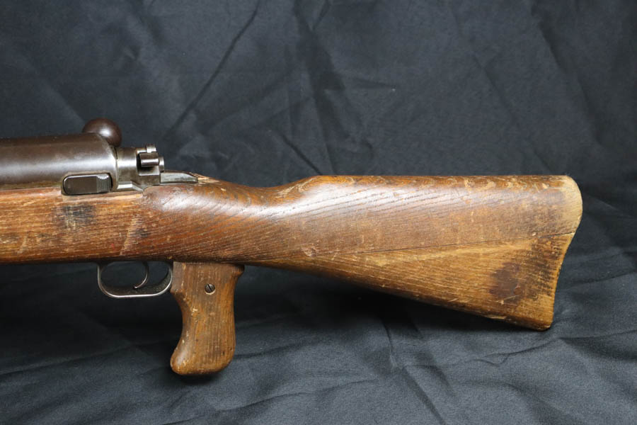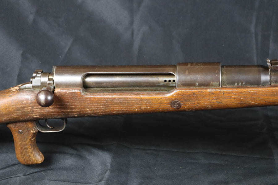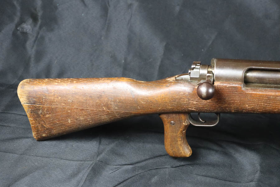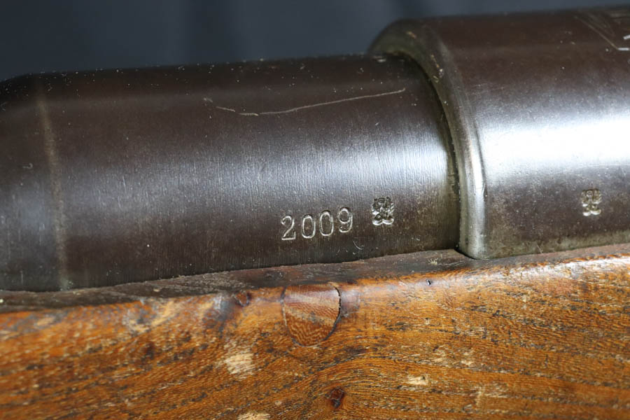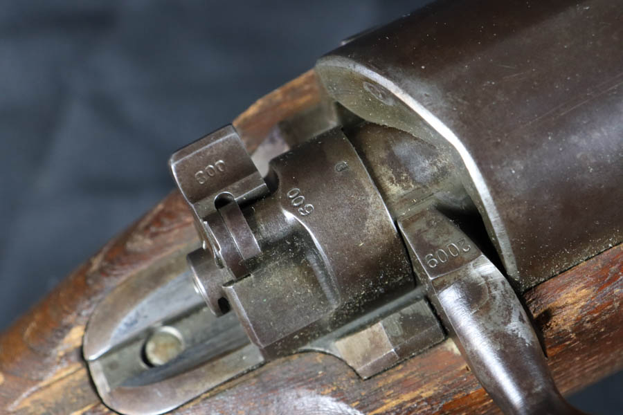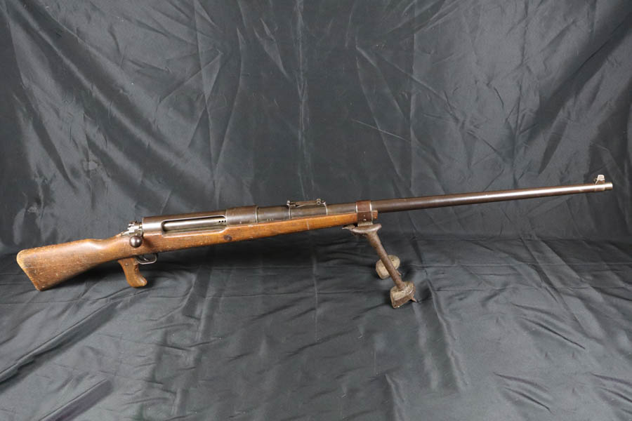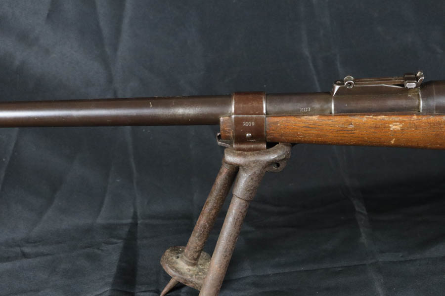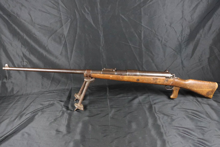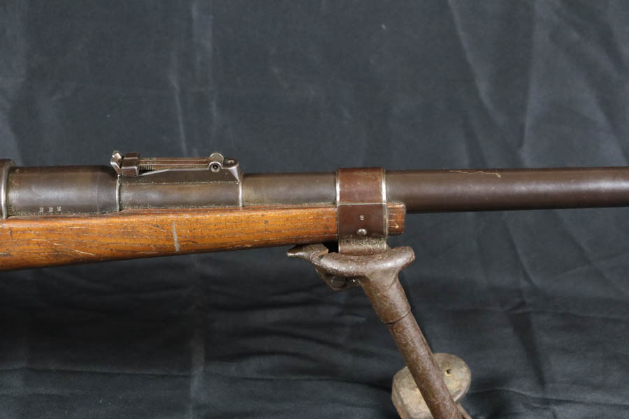 6/4/24 – This is an all matching and original example of the very rare Mauser T-Gewehr Anti-Tank rifle from 1918. There were only ~15,000 produced for the war with the vast majority being destroyed after the war, and even fewer surviving examples still found in original, matching condition. These massive single shot rifles were manufactured in 1918 and are chambered for the 13x92SR cartridge. Known as the “Elefant-Buechse” (elephant rifle) by the German Army, the Tankgewehr 18 (T-Gewehr) was an up-scaled single-shot version of the Model 98 infantry rifle with a bipod and a pistol grip. The T-Gewehr could penetrate the armor of any Allied tank used during WWI. Tanks at this time were only designed to stop rifle rounds and shrapnel. Matching numbers include the receiver, bolt assembly, rear sight, front sight, floorplate and more. The stock is also matching numbered to the gun and has handling wear but is structurally intact. The bluing on the rifle is all original and has no major areas of wear, but there is patina that has set in on much of the metal surface. The bore has fairly strong rifling but has some frost throughout and could use a thorough cleaning. Comes with an original bipod and one original cartridge. Weighs in at over 40lbs and is 66in long.