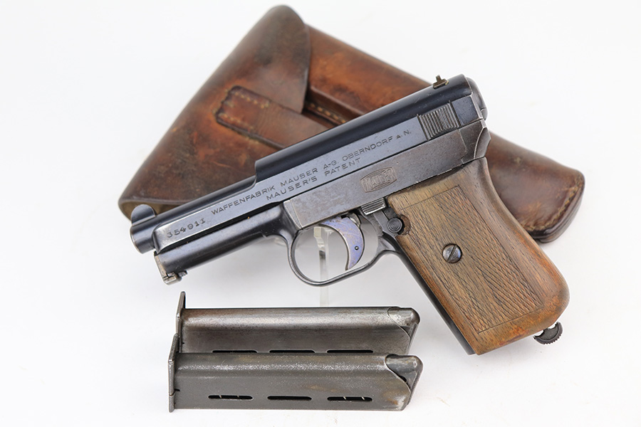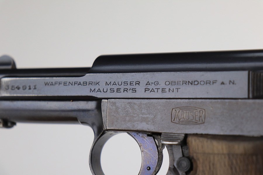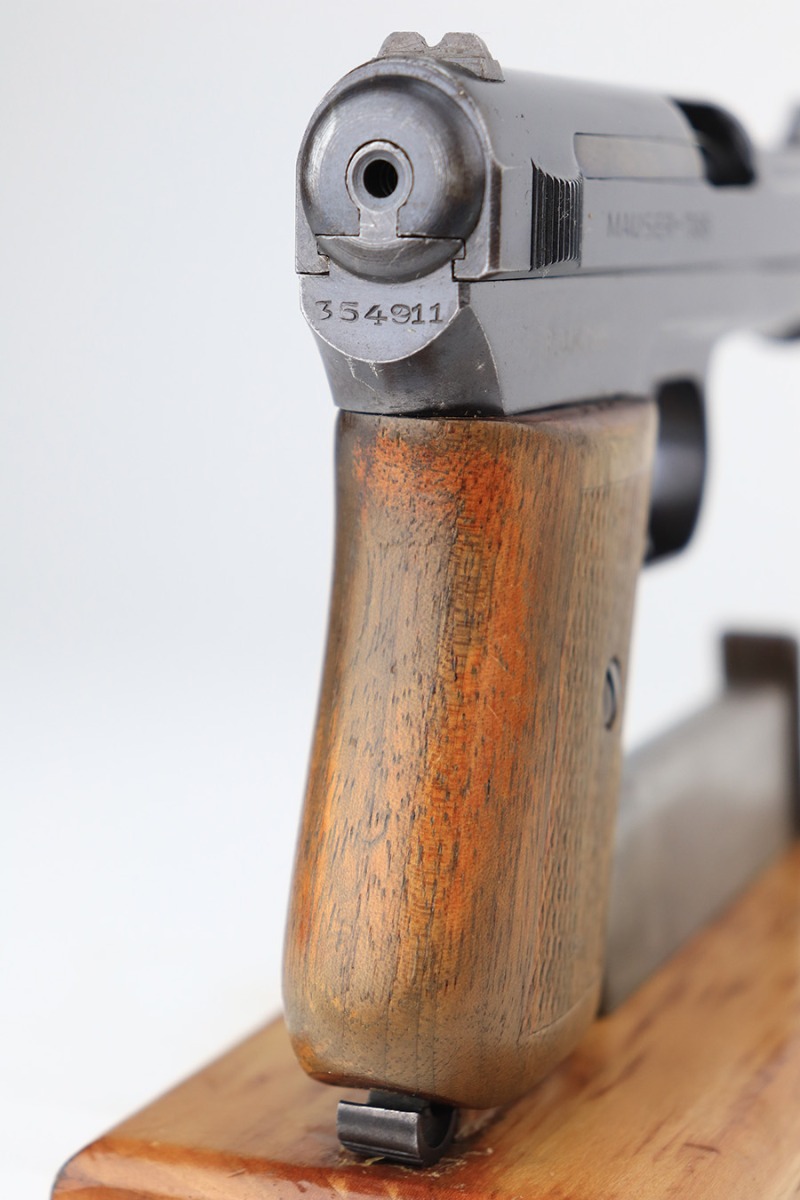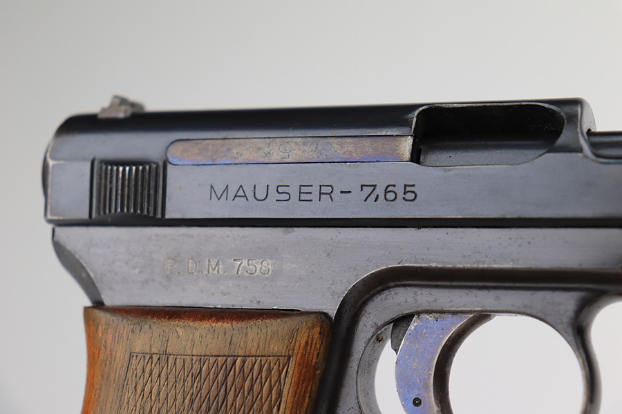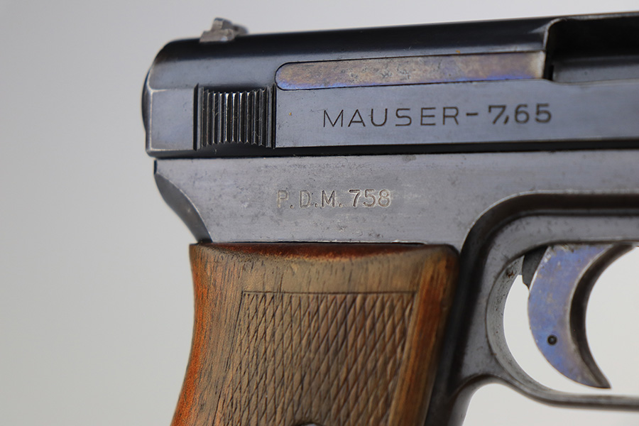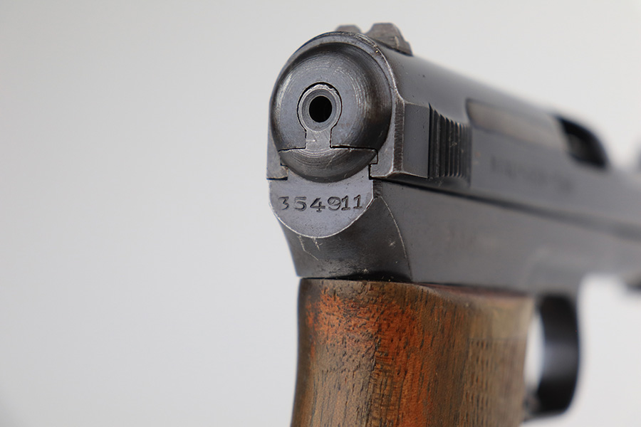 3/26/22 – This is an excellent example of a very rare Mauser Model 1914. It is marked “P.D.M. 758”, indicating it was issued to the Police Department of Munich. From research, there are very few known examples. In fact, we only know of one other in the private collection of an advanced collector. This one is all matching and has the proper “Crown U” proofs. It comes as a rig with a nice 1935-dated police holster, one un-marked magazine, and one police-numbered magazine that does not match the gun. There is a police unit marking on the inside of the holster that does not match the gun. The pistol has retained about 97% of its original finish with very minor wear around the muzzle and some spotty wear on the front strap. While there is not much actual finish loss, there are areas of noticeable spotty oxidation on the left side of the frame and on the front strap. Comes with a slightly worn period-correct wood grip. The bore has good rifling with some very minor pin-pricking throughout.