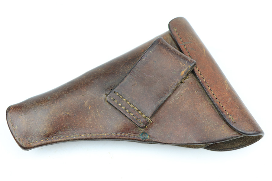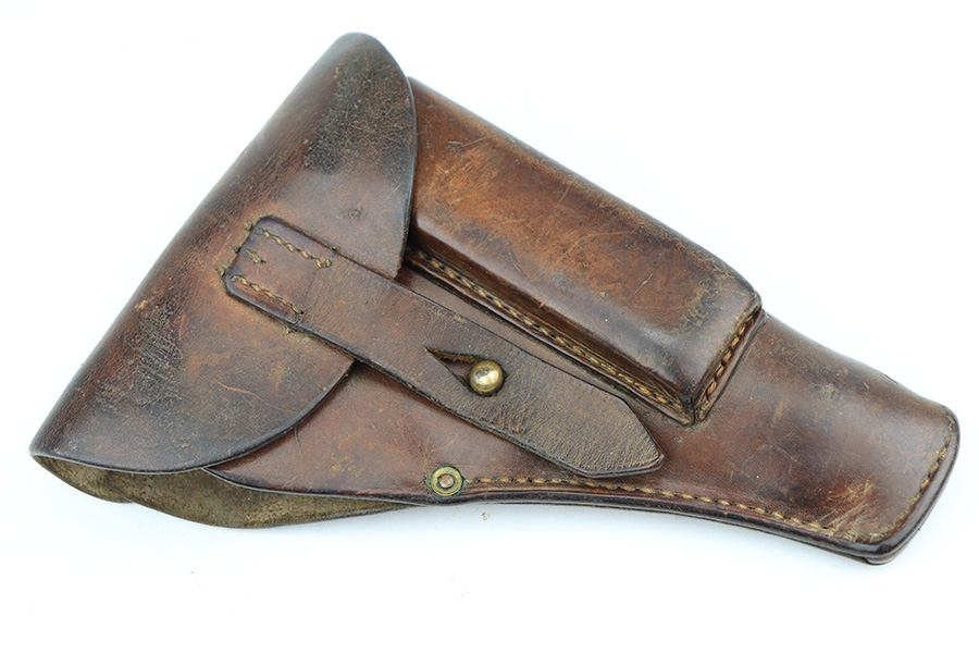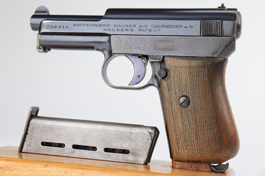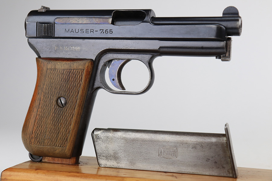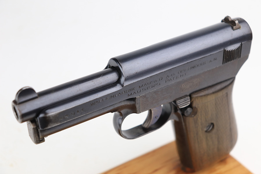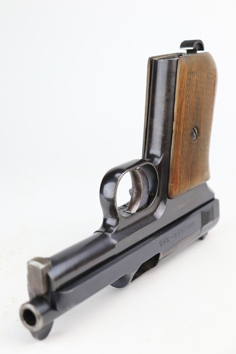 3/26/22 – This is an excellent example of a very rare Mauser Model 1914. It is marked “P.D.M. 758”, indicating it was issued to the Police Department of Munich. From research, there are very few known examples. In fact, we only know of one other in the private collection of an advanced collector. This one is all matching and has the proper “Crown U” proofs. It comes as a rig with a nice 1935-dated police holster, one un-marked magazine, and one police-numbered magazine that does not match the gun. There is a police unit marking on the inside of the holster that does not match the gun. The pistol has retained about 97% of its original finish with very minor wear around the muzzle and some spotty wear on the front strap. While there is not much actual finish loss, there are areas of noticeable spotty oxidation on the left side of the frame and on the front strap. Comes with a slightly worn period-correct wood grip. The bore has good rifling with some very minor pin-pricking throughout.